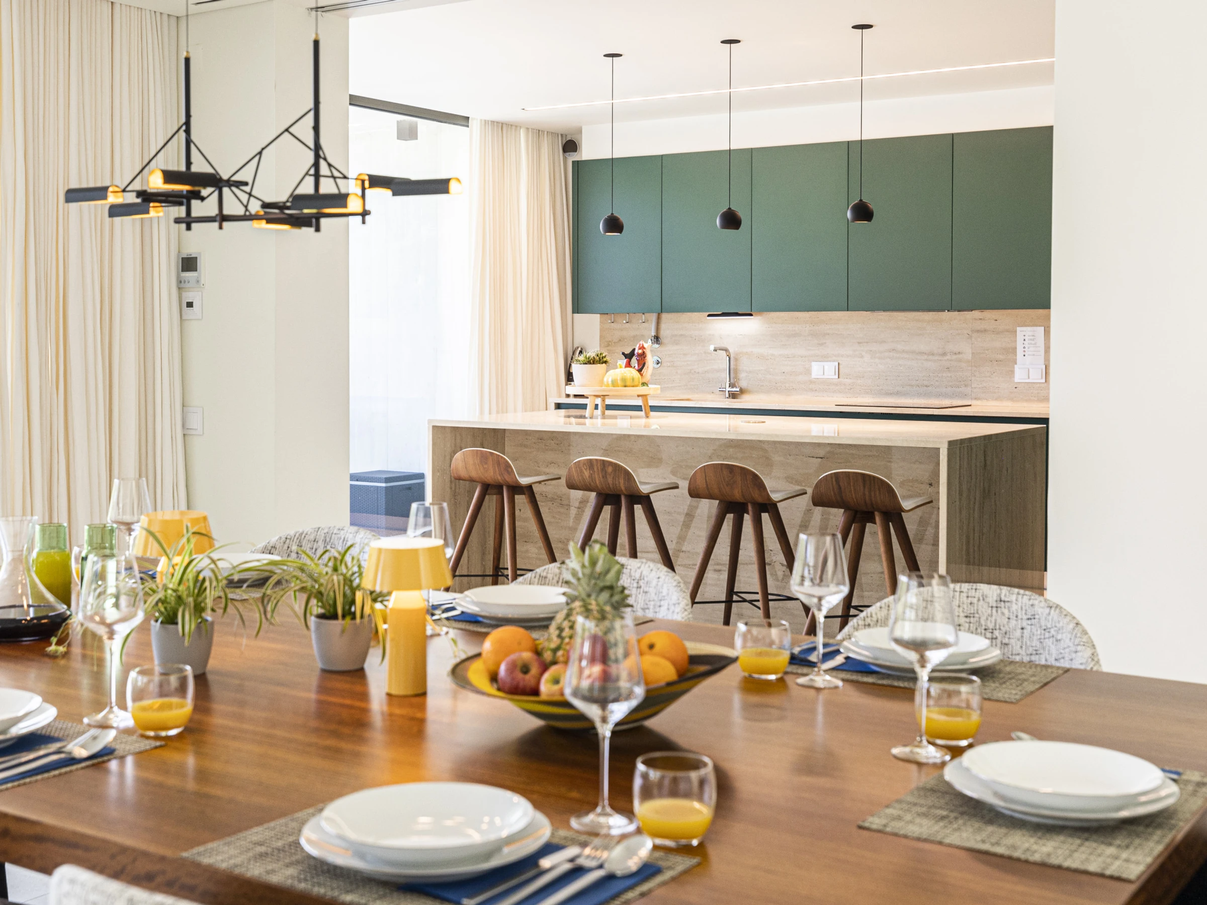 La disposition colorée en plan ouvert est idéale pour les familles, avec une salle de télévision dédiée pour se détendre ensemble.