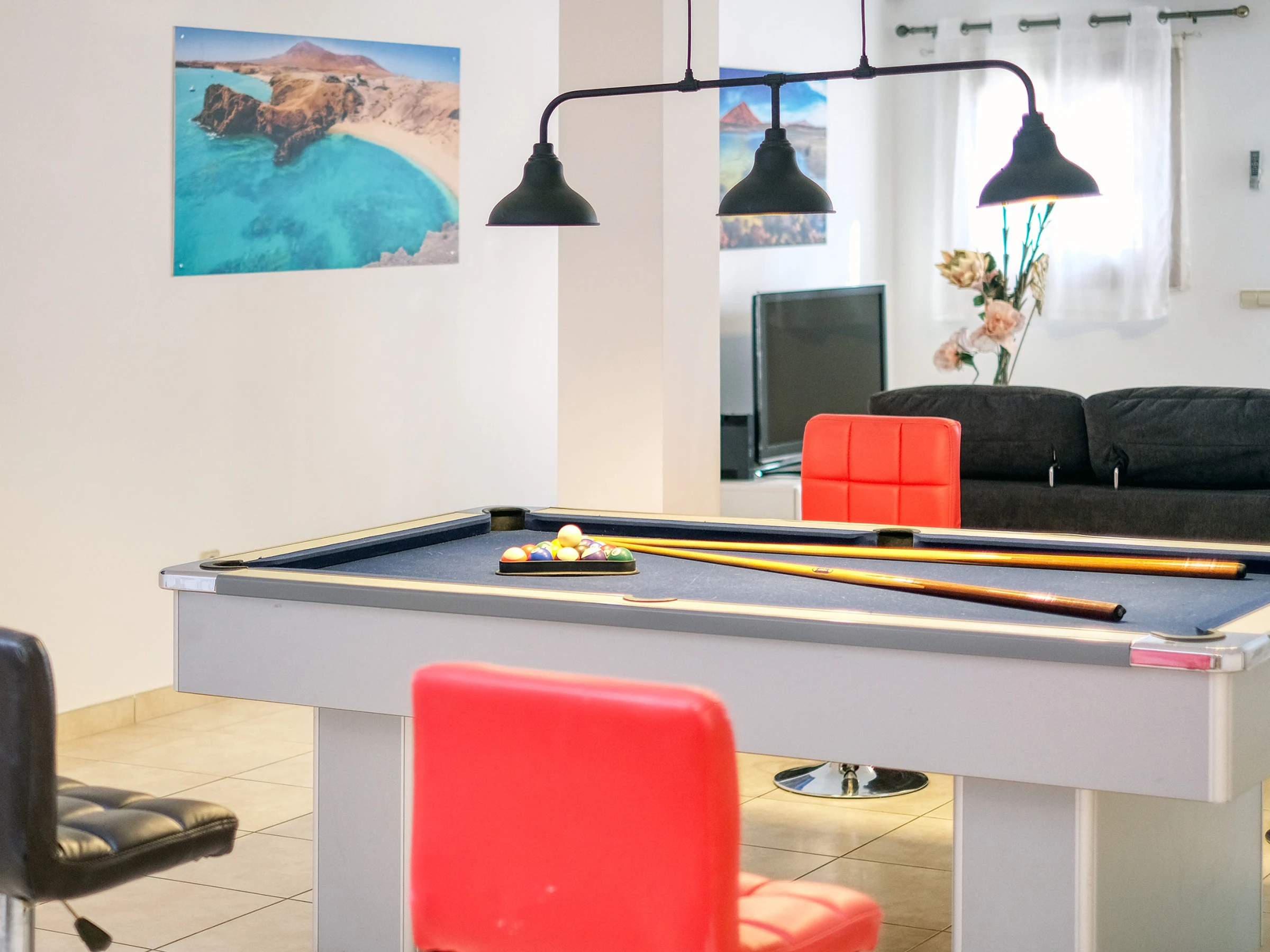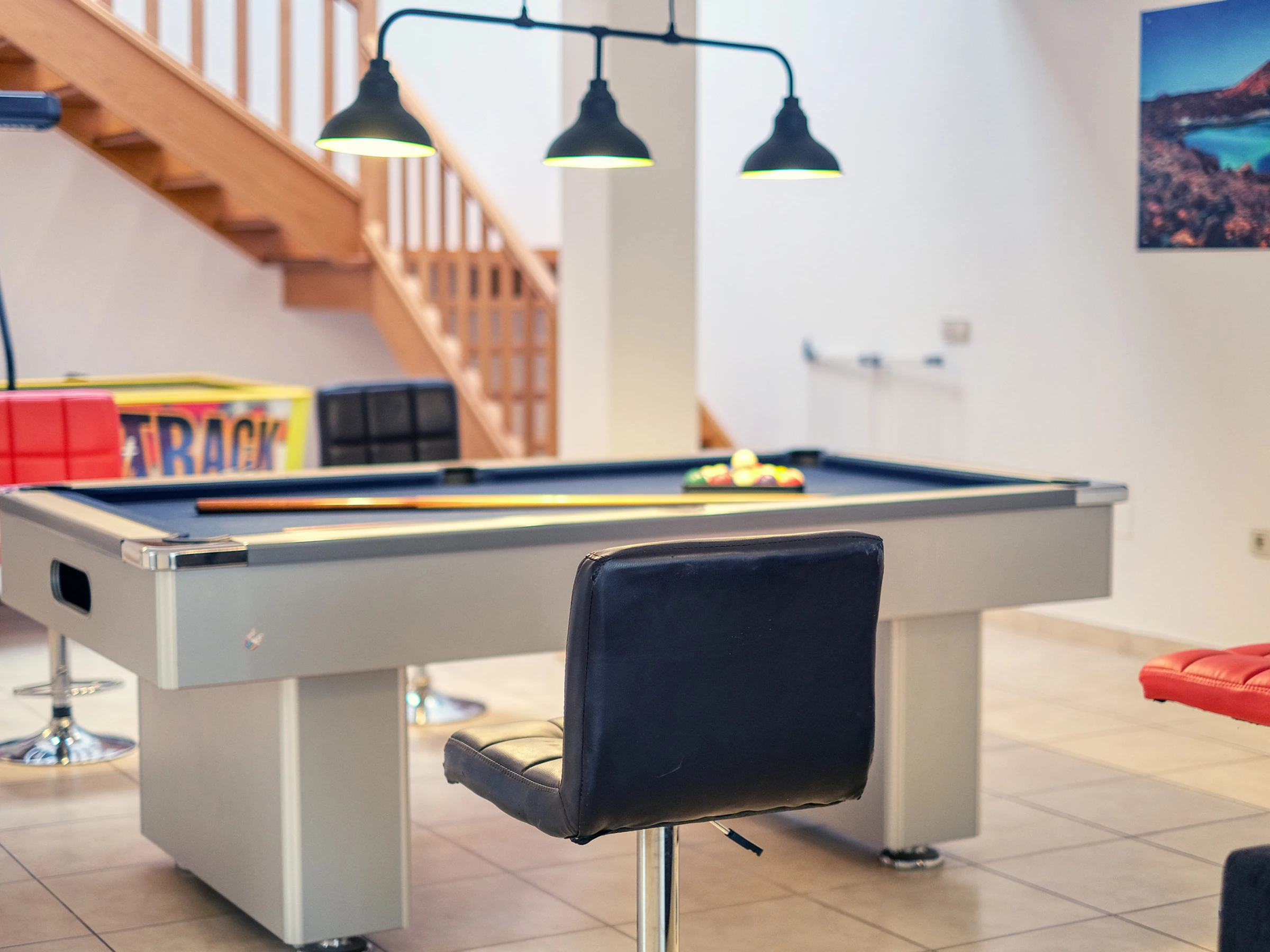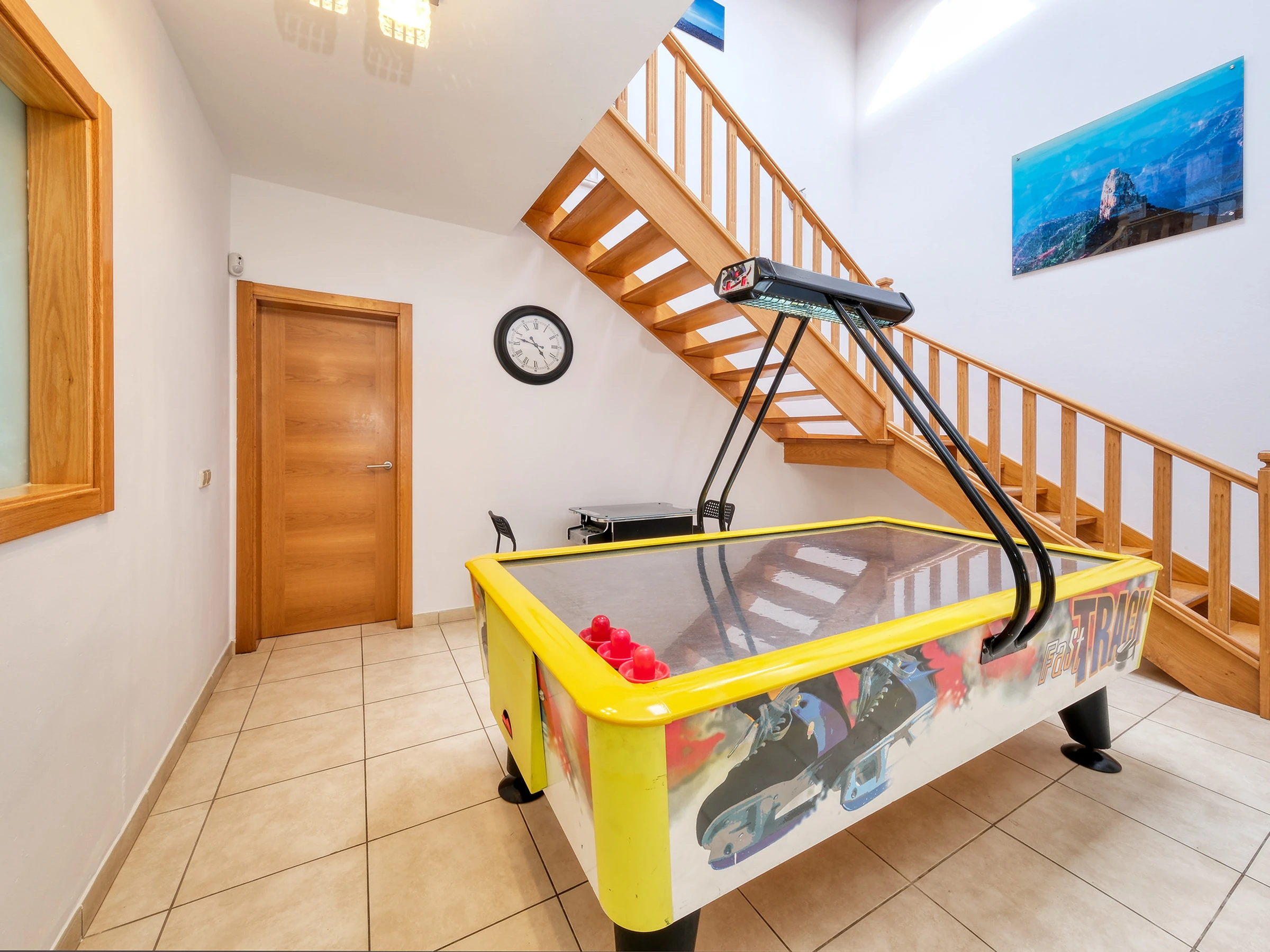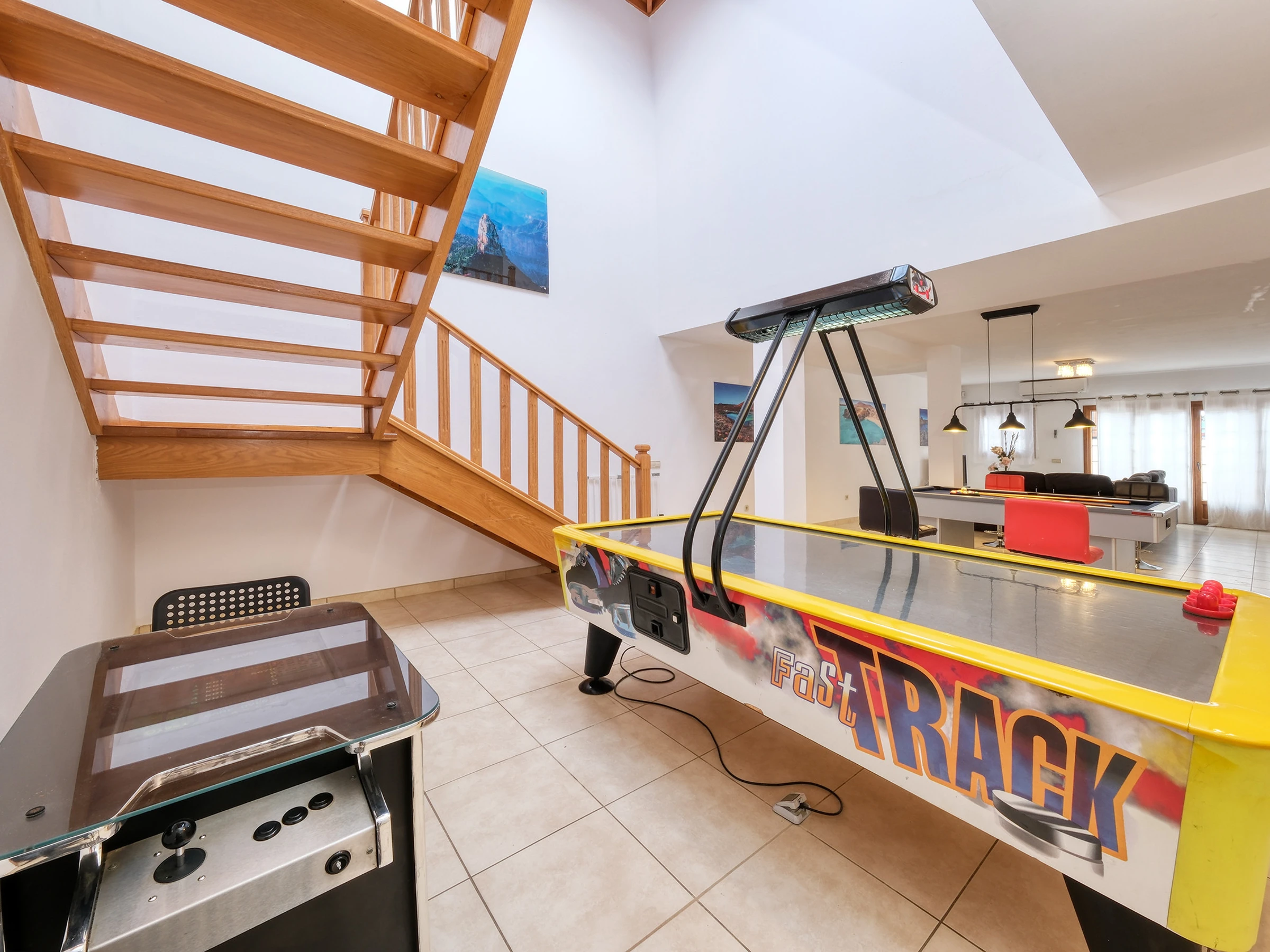Au rez-de-chaussée, il y a une grande salle de jeux avec billard, Air-Hockey, Pac-Man et autres jeux numériques, ainsi qu'un Smart TV avec chaînes internationales ; et 3 chambres supplémentaires :