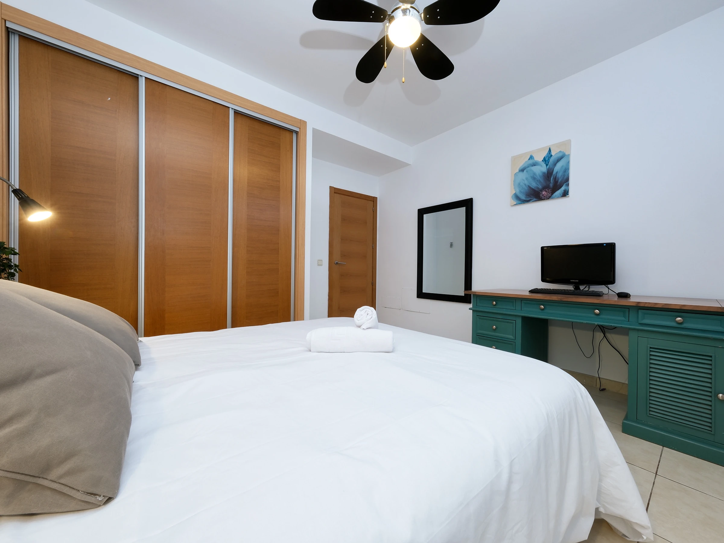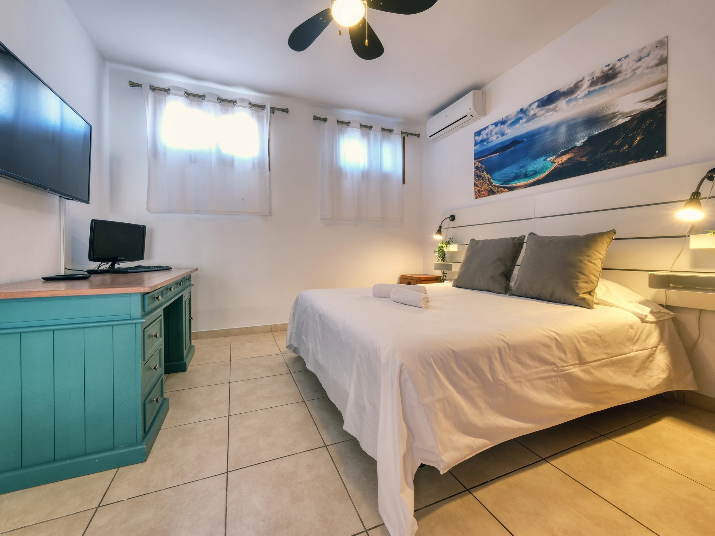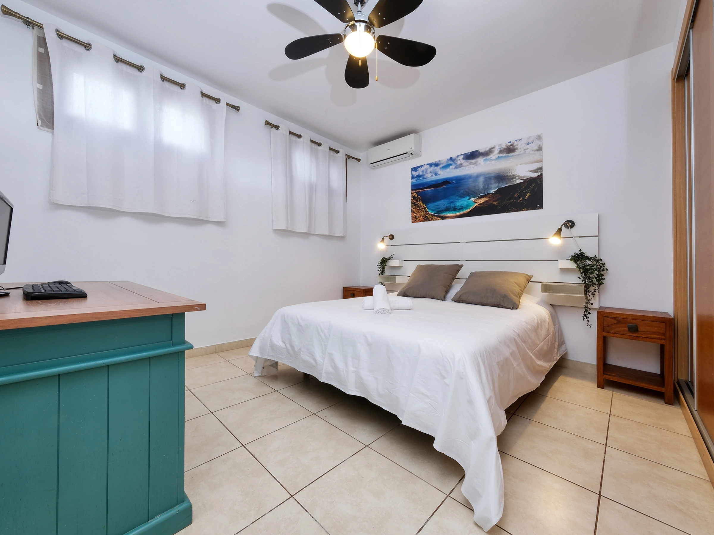 Une avec bureau, écran et clavier, idéale pour le télétravail.