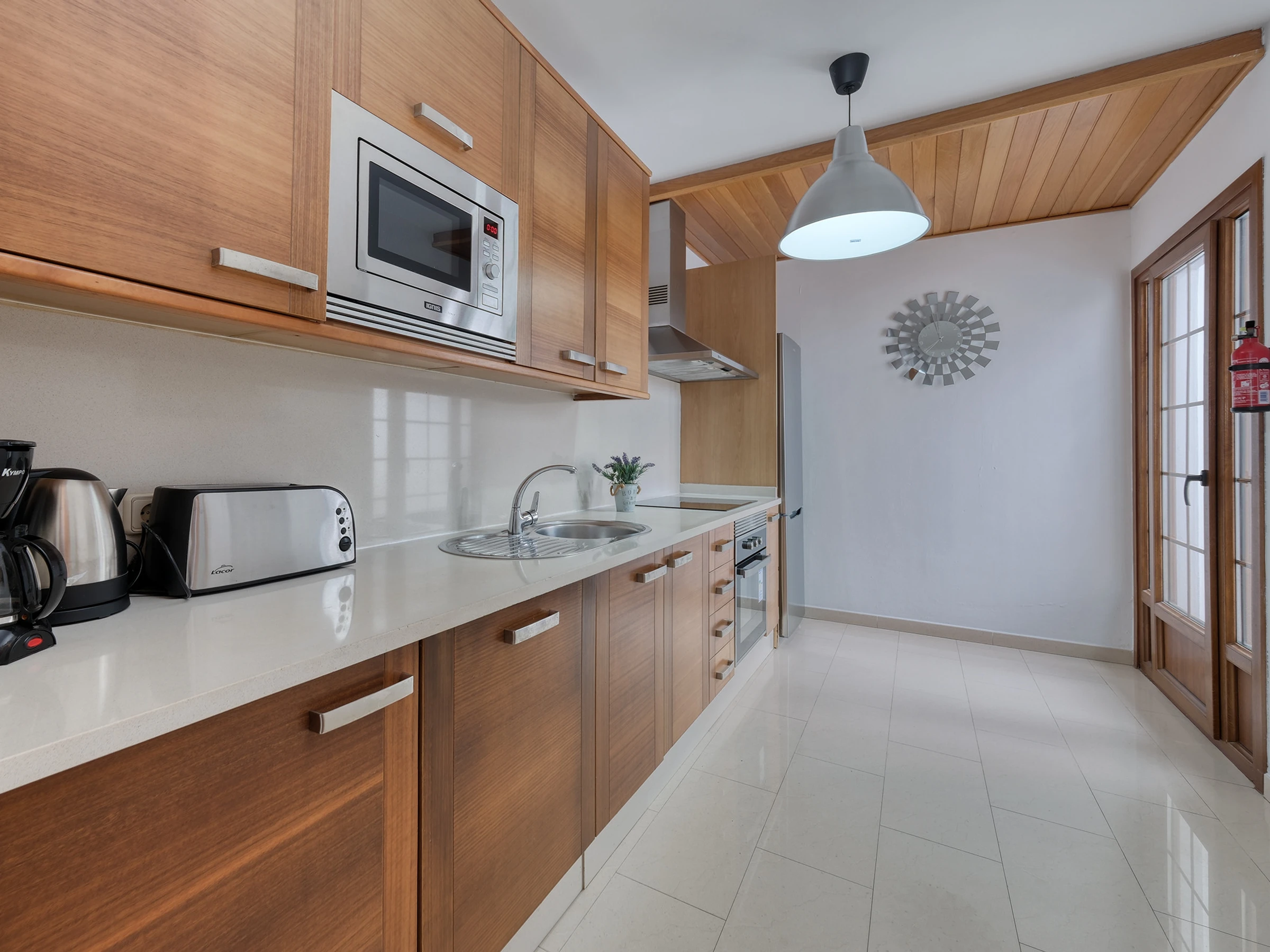 Cuisine indépendante entièrement équipée avec lave-vaisselle, réfrigérateur, cafetière américaine, grille-pain, bouilloire, micro-ondes, four et vaisselle complète, et une salle à manger avec des vues spectaculaires sur la mer et un accès direct à la terrasse et à la piscine.