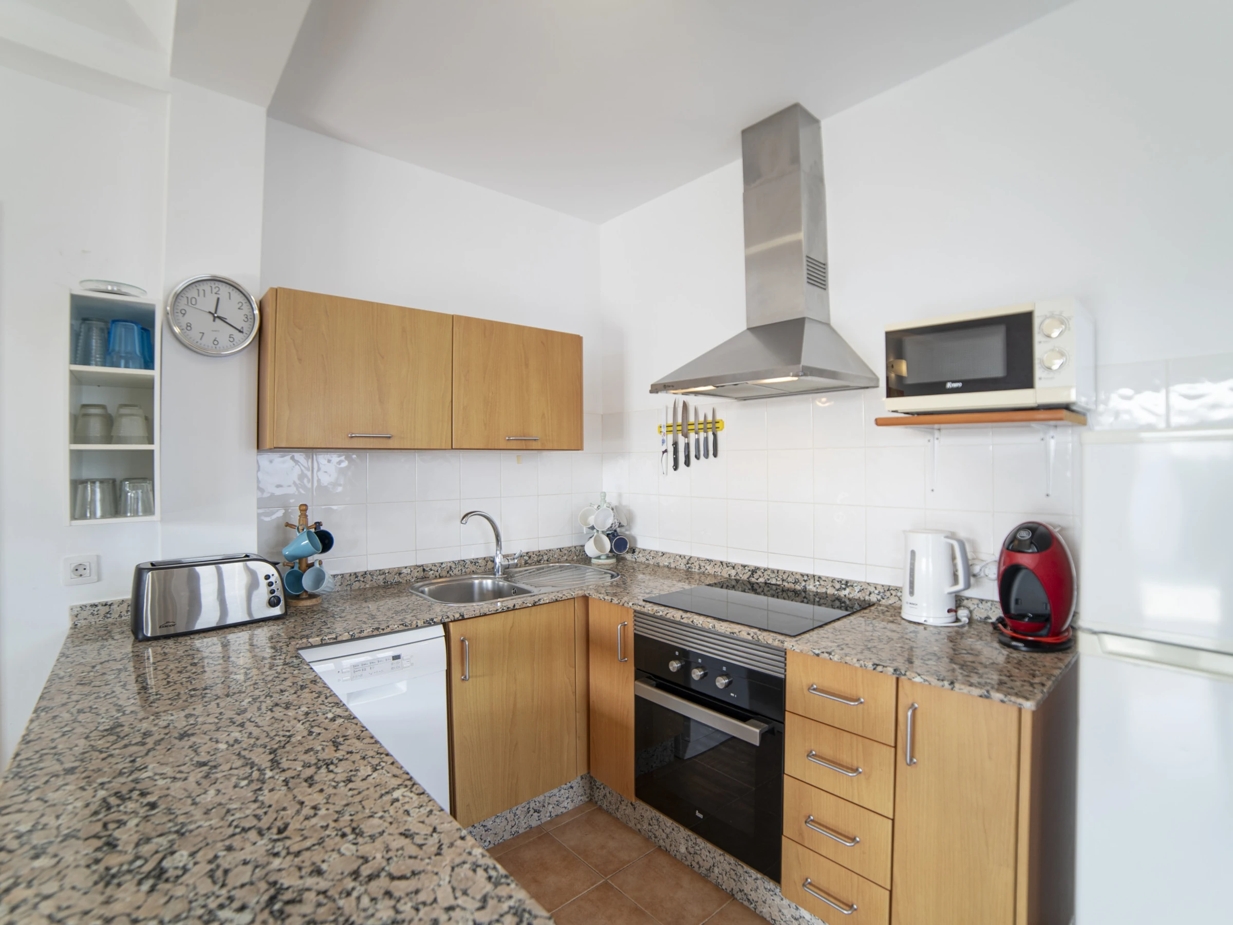 La cuisine, est équipée avec réfrigérateur, micro-ondes, four, cafetière et grille pain.