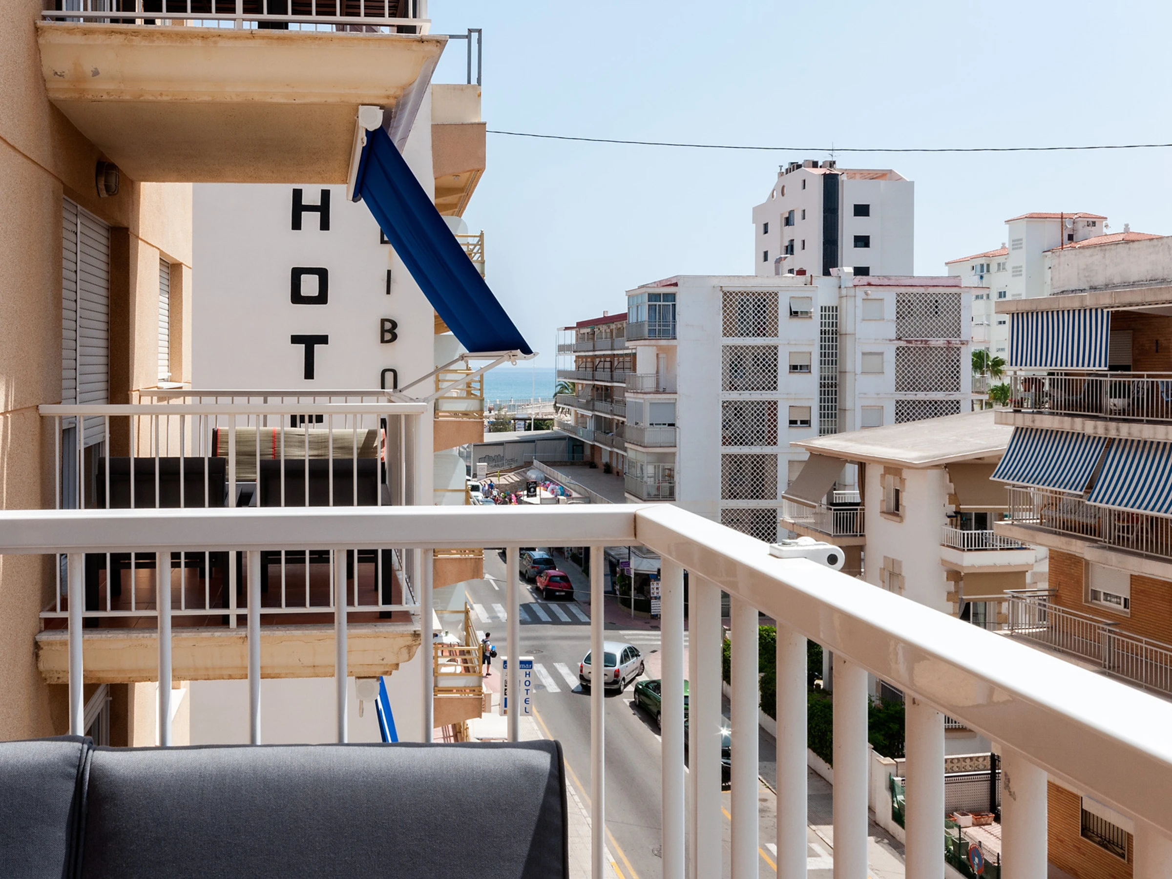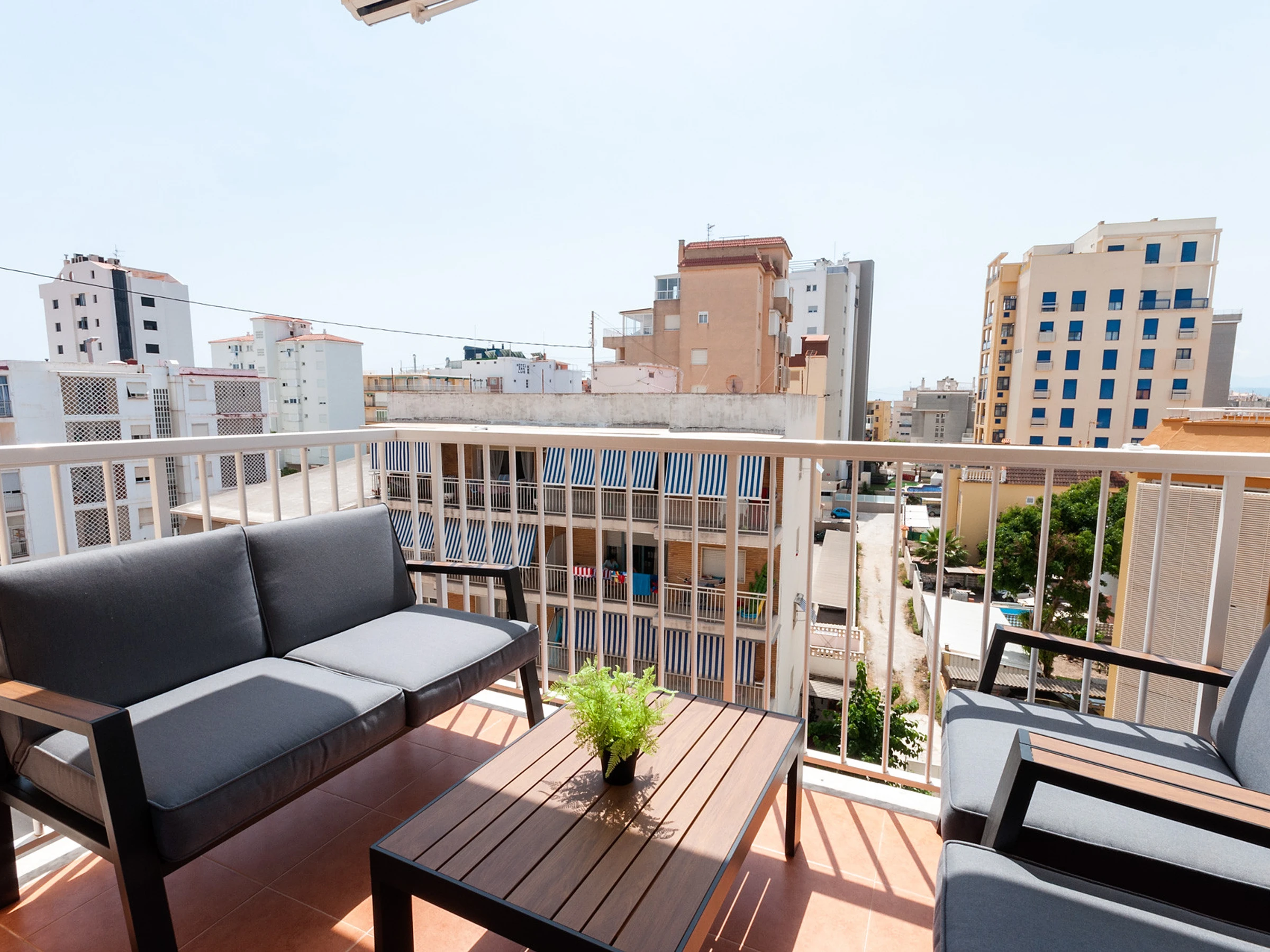 La terrasse, à côté du salon, est un espace très important et nous l’avons meublée avec des chaises longues, car c’est ce que nous sommes venus chercher pour nous détendre pendant nos vacances à Gandia. Nous avons aussi des auvents sur la terrasse.