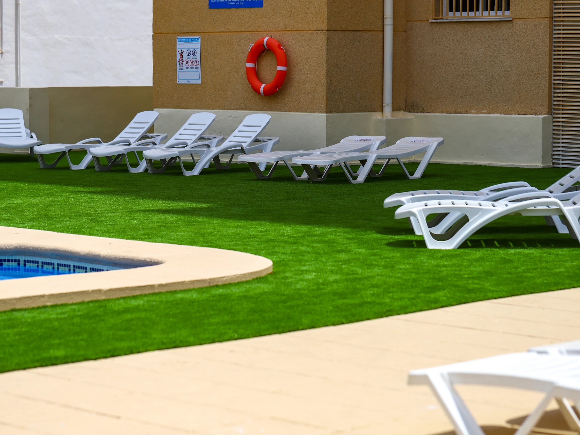 Logement de 55 m² meublé avec goût et entièrement équipé, avec vue sur la mer depuis la terrasse et la piscine.