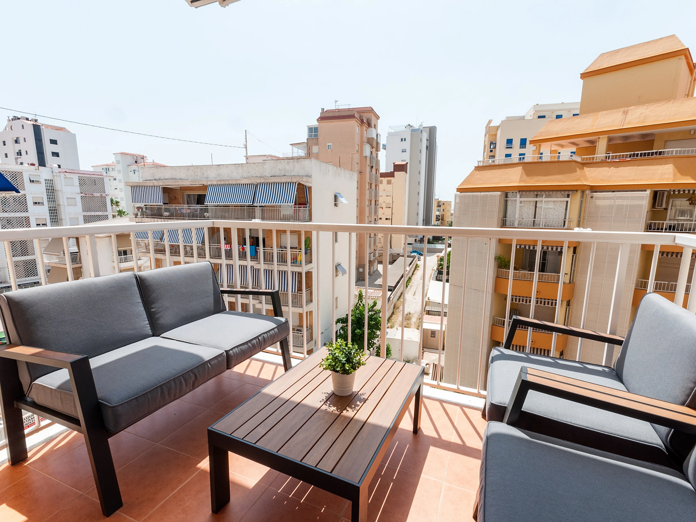 La terrasse, à côté du salon, est un espace très important et nous l’avons meublée avec des chaises longues, car c’est ce que nous sommes venus chercher pour nous détendre pendant nos vacances à Gandia. Nous avons aussi des auvents sur la terrasse.