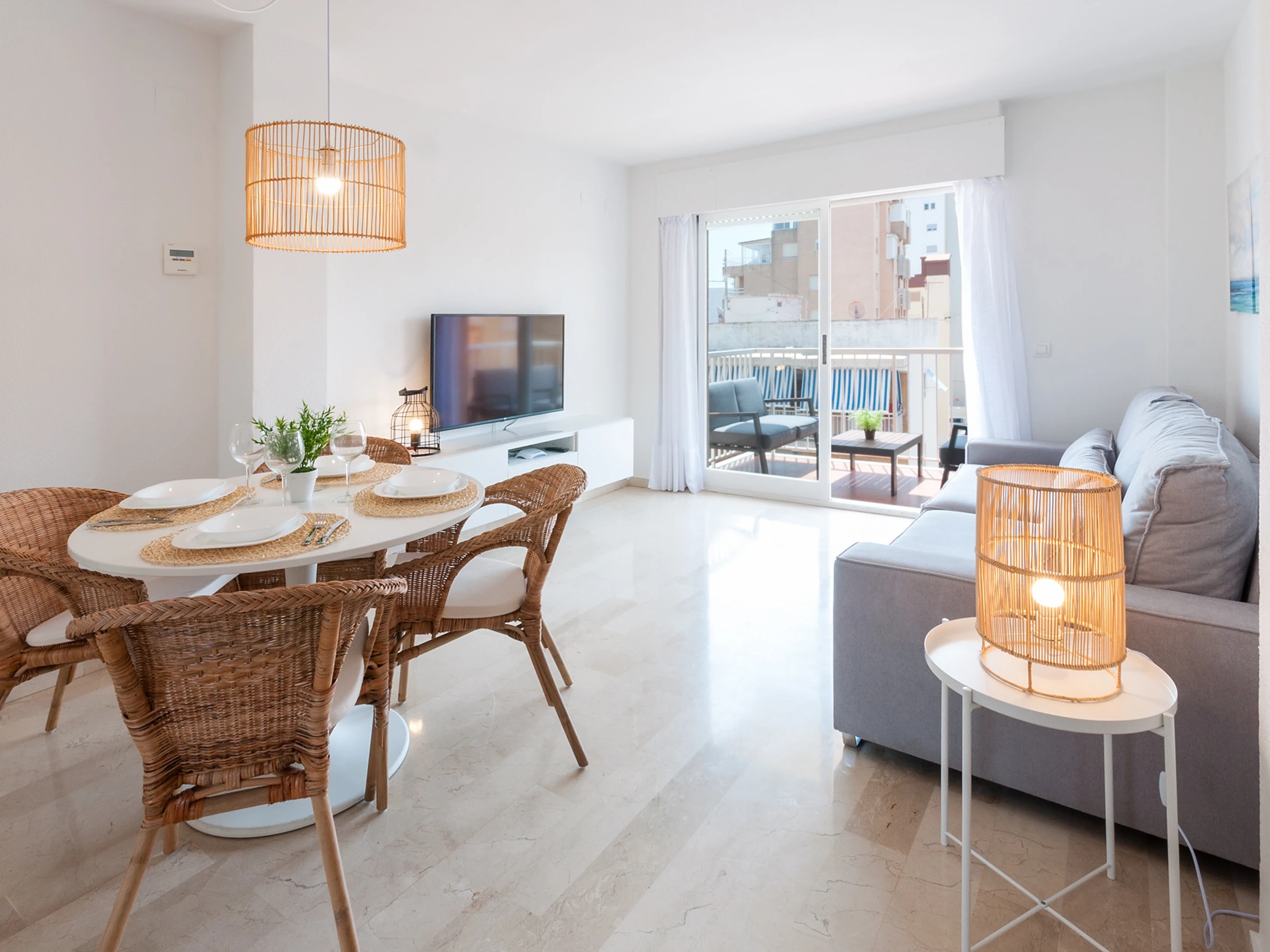 Vous trouverez une table confortable pour manger les 4 avec différentes chaises avec des lampes en osier / bambou pour donner ce style méditerranéen.