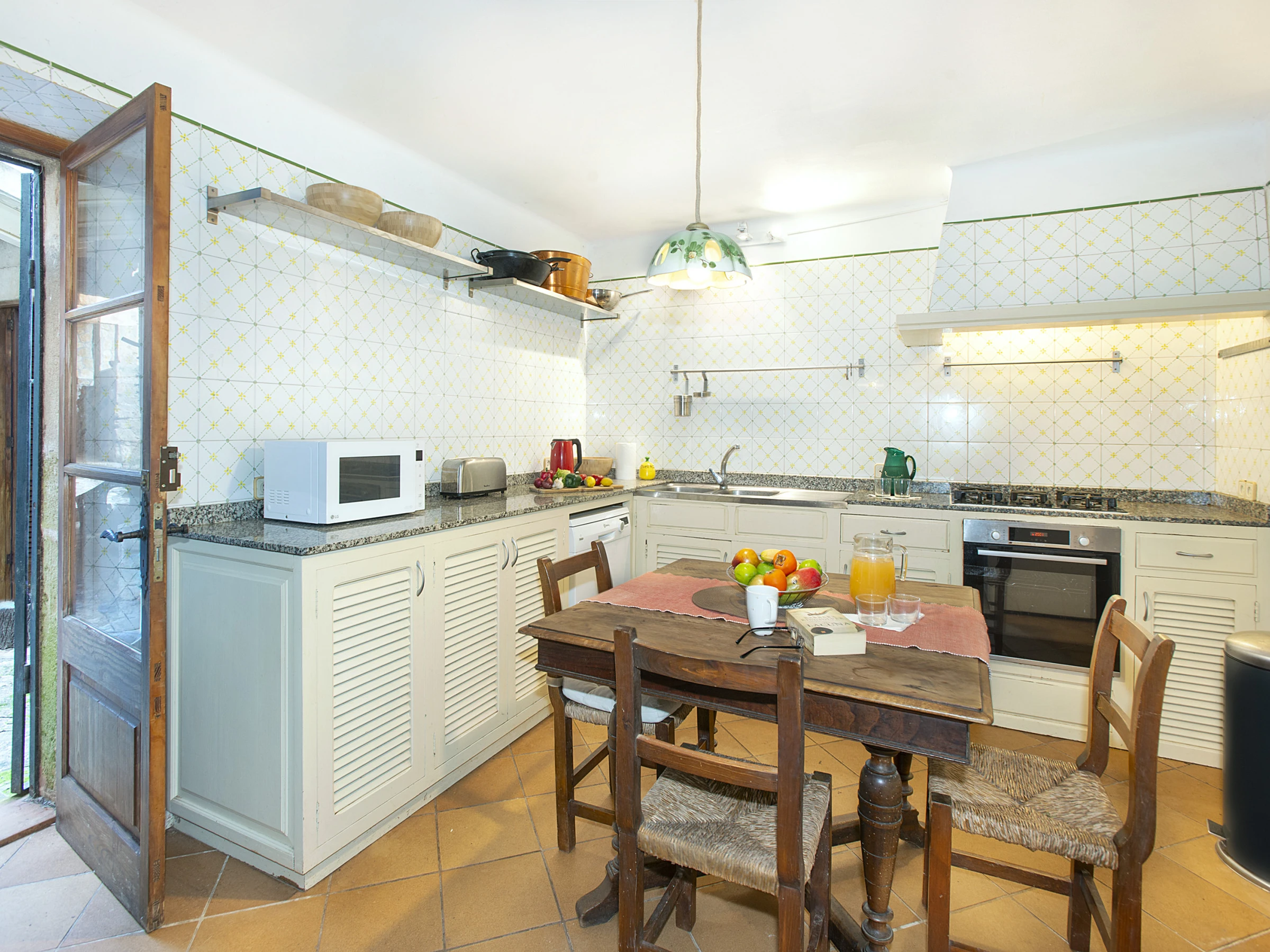 À gauche se trouve la cuisine rustique, idéale pour cuisiner tout en dégustant un verre de vin.