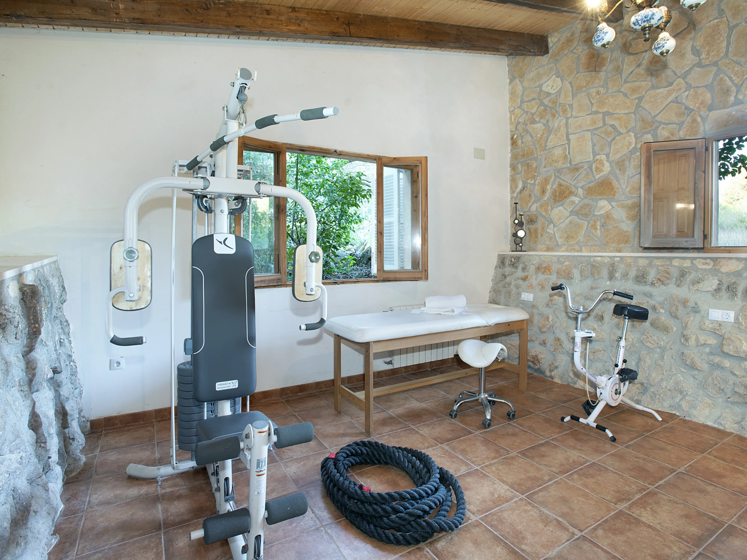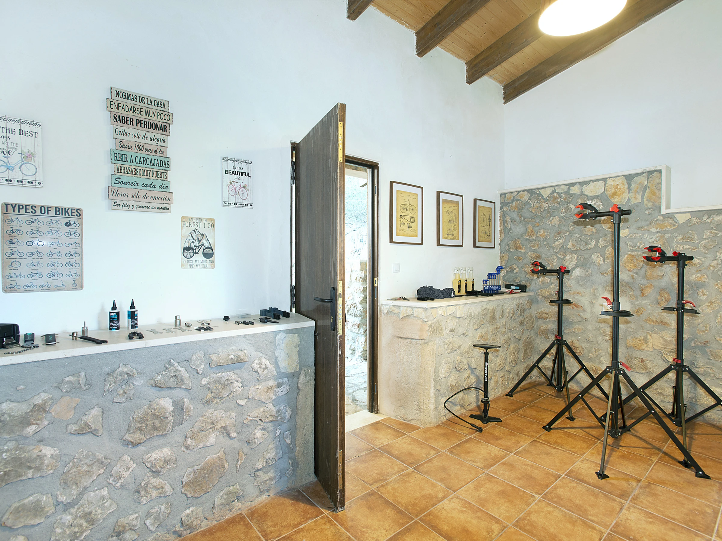 À l'extérieur, il y a deux chambres annexes qui abritent une petite salle de sport et un espace dédié aux cyclistes, avec des outils et des porte-vélos. Il y a aussi une salle de bain complète pour se doucher après une journée de sport.