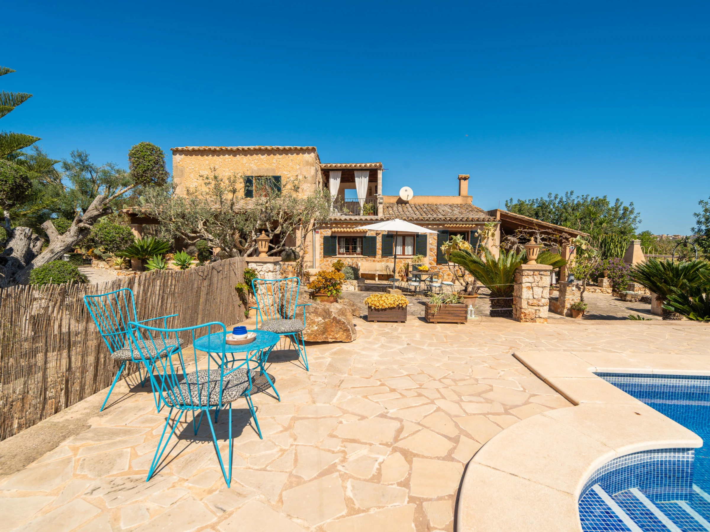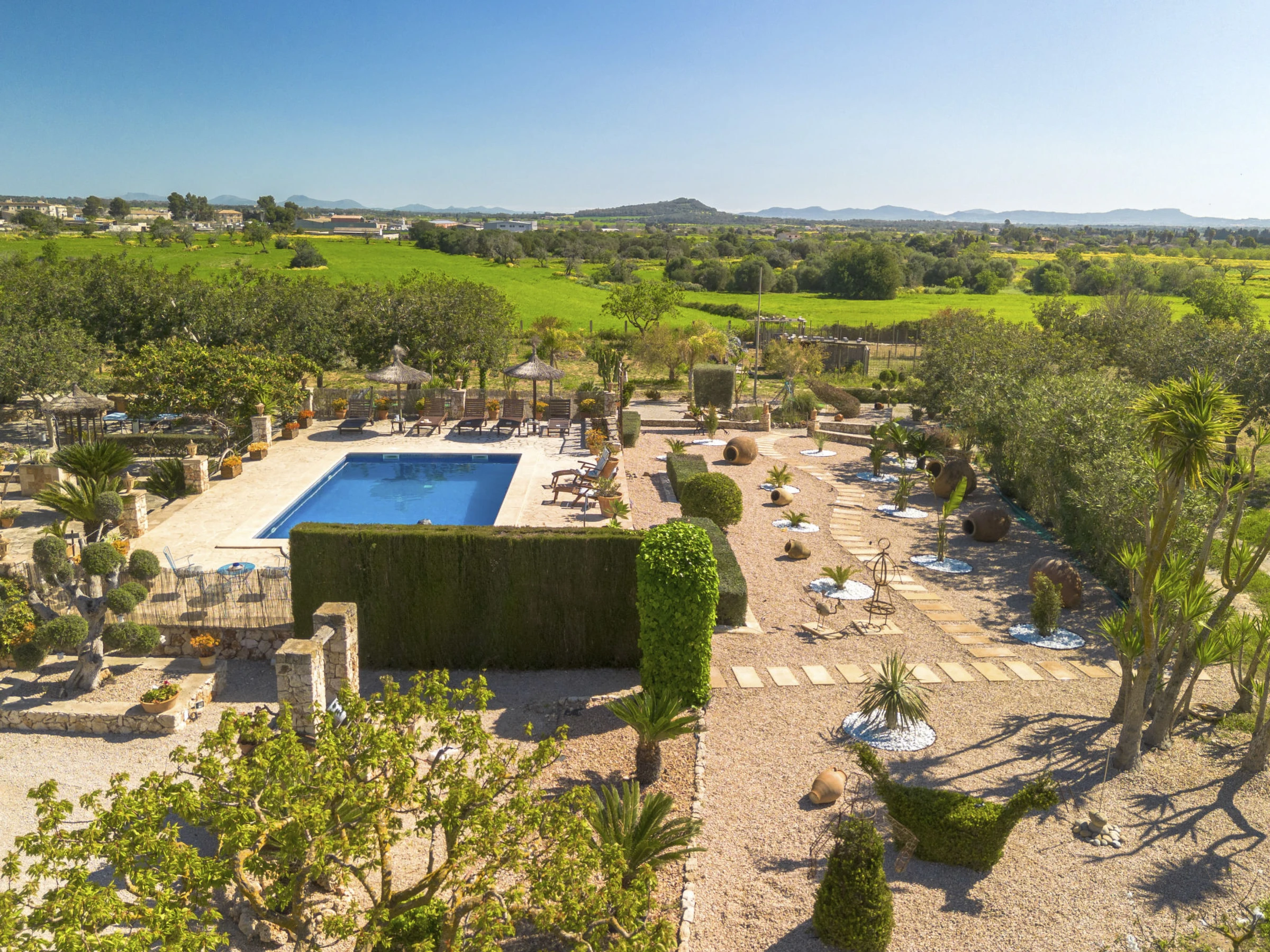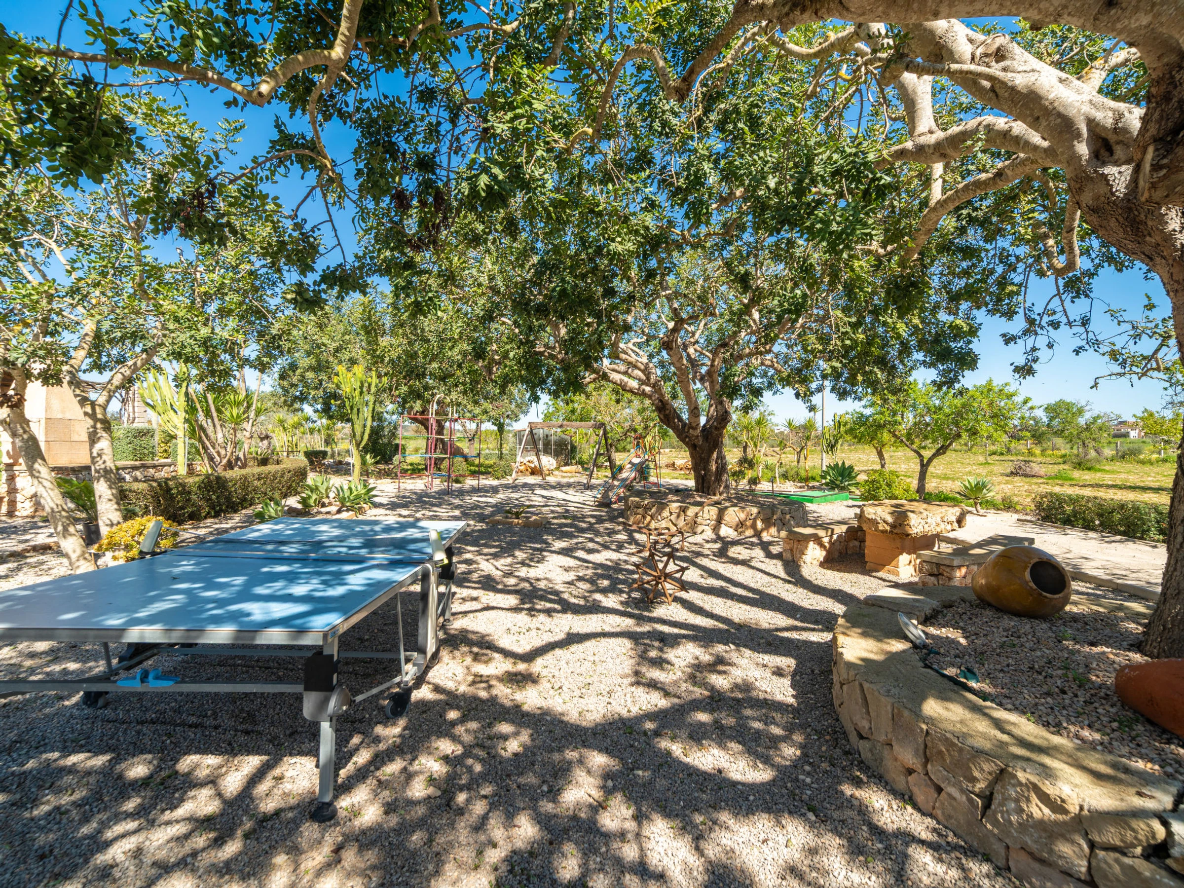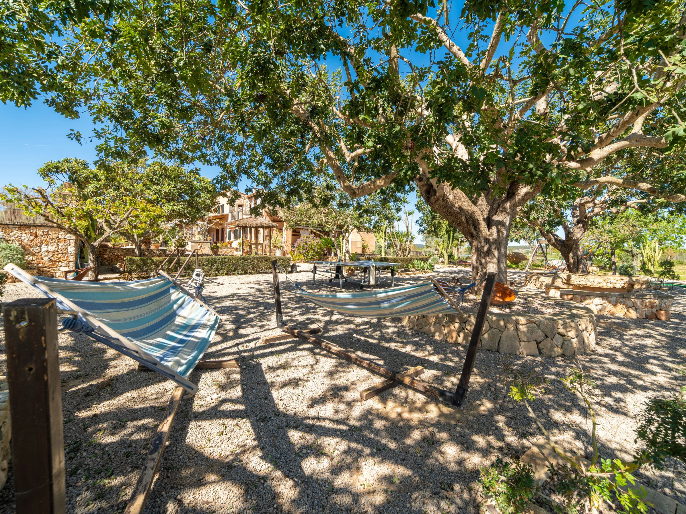 Beau, grand domaine confortable "Ses Terrasses", de 2 étages, renové, environné par les champs. En-dehors de la localité, à 1.5 km du centre de Porreres, situation tranquille, ensoleillée, à 19 m de la mer, dans la verdure. A usage privé: terrain à l'état naturel (clôturé), jardin avec plantes et arbres, piscine rectangulaire (9 x 5 m, profondeur 30 - 200 cm, disponibilité saisonnière: [hidden] - [hidden] Douche extérieure, ping-pong, terrain de pétanque, jardinet, tonnelle, pergola, meubles de jardin, barbecue, espace de jeux pour les enfants (toboggan, balançoire), minizoo entretien de la piscine par le propriétaire/jardinier. Infrastructures de la Maison: accès internet, Connexion WIFI. Place de parking près de la maison sur le terrain. Supermarché 3.4 km, restaurant 3.3 km, bar 3.3 km, boulangerie 3.4 km, centre à 25 minutes à pieds, arrêt de bus "Ronda de l'Estació 1 (43006)" 1.5 km, plage de sable "Arenal de Sa Ràpita - Es Trenc" 20 km. Port plaisance 18.6 km, terrain de golf (18 trous) 27 km, piste cyclable 500 m. Attractions à proximité: Palma City 43 km, Pueblos de Porreres-Campos-Felanitx, Colonia Sant Jordi 23 km, Portopetro 32 km, Santuario de Lluc 52 km, Santuario de Montision 1.9 km. Région de randonnées: Serra de Tramuntana. Veuillez noter: voiture recommandée, sans ascenseur. Adapté(e) aux familles. Bien convenant à 6 adultes. Le propriétaire n'accepte pas les groupes de jeunes. Sur le terrain des animaux. Animaux dans le voisinage. Aéroport 38 km de la maison.