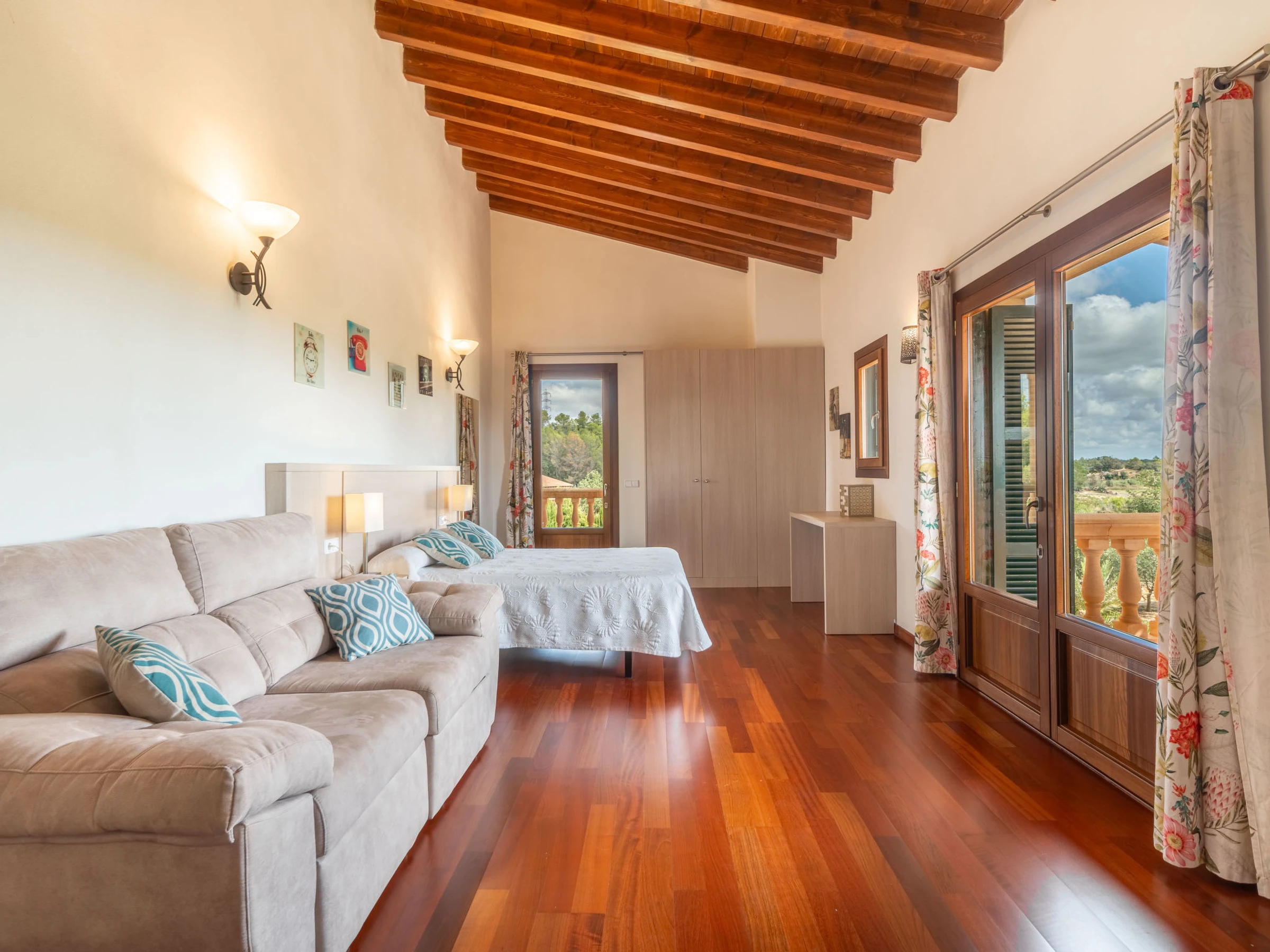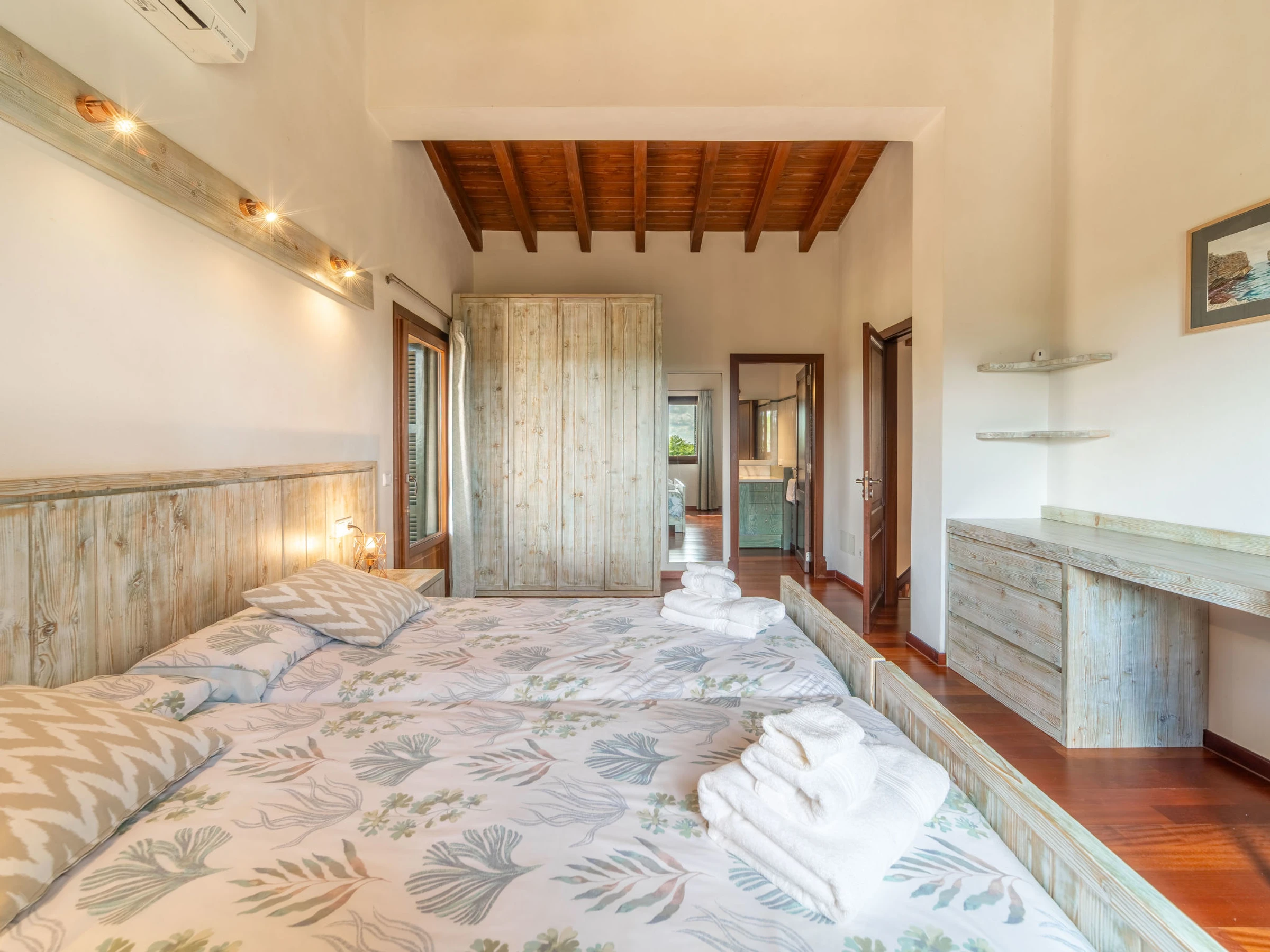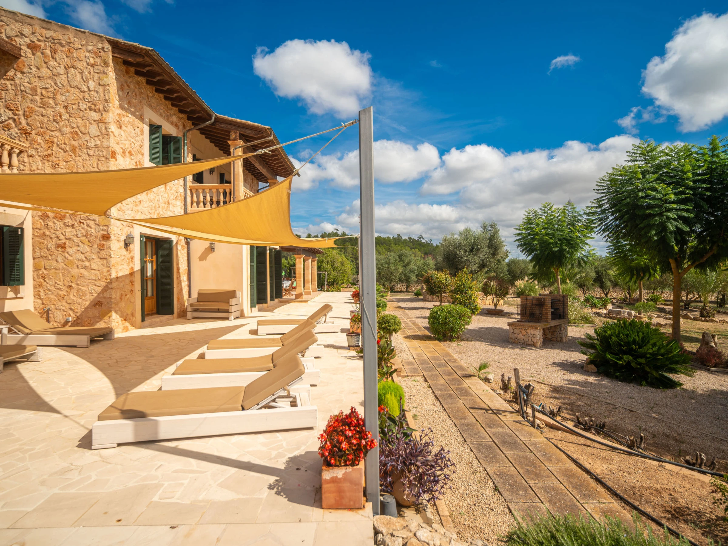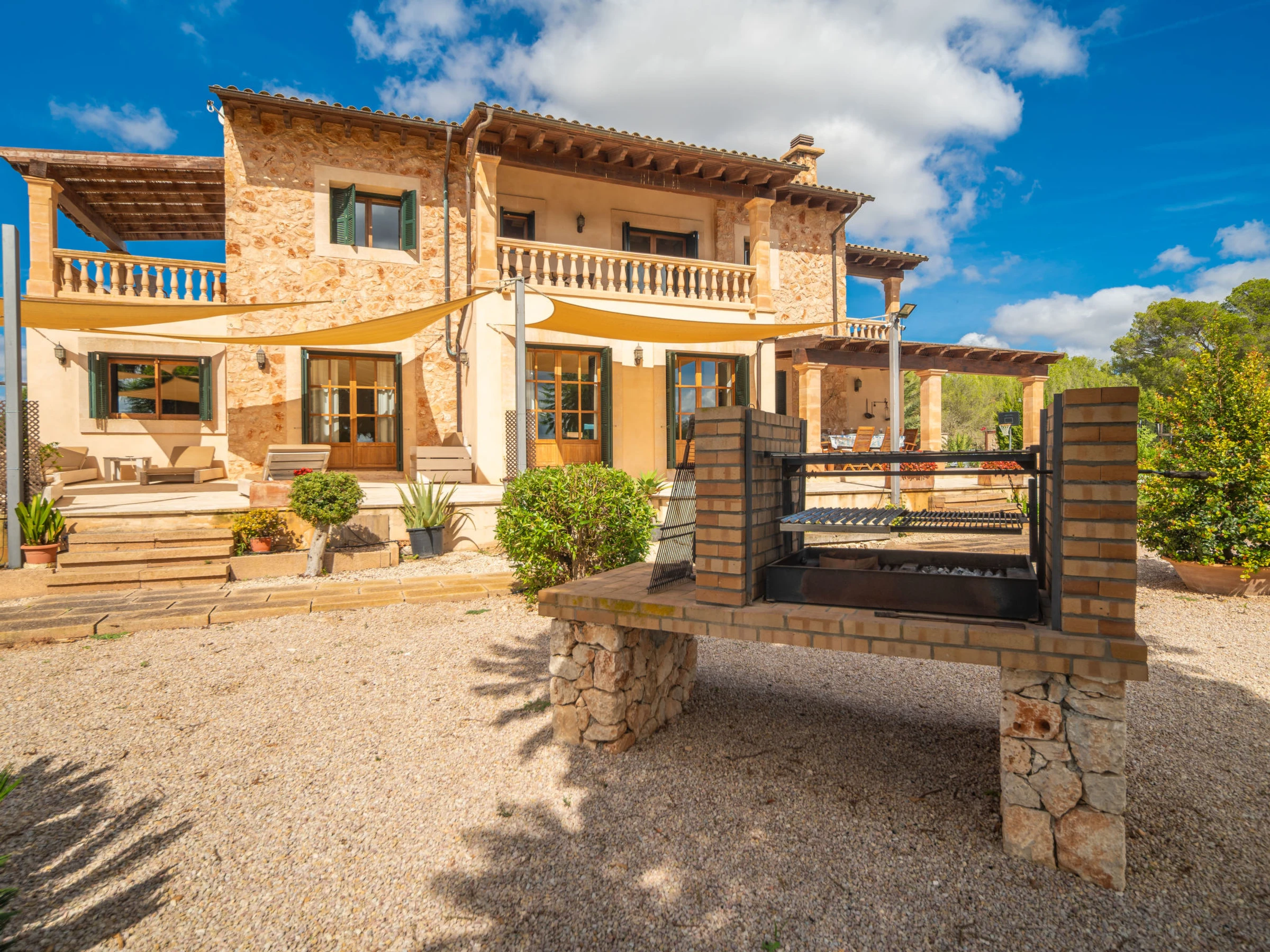 "Son Mainou", villa 5 pièces 270 m2 sur 2 niveaux. Logement idéal pour 4 adultes + 2 enfants. Spacieux et clair, aménagement très confortable et moderne: séjour/salle à manger avec cheminée (uniquement à titre de décoration), TV (satellite), air-conditionné et chauffage à air chaud. Sortie sur le jardinet, sur la piscine. 1 chambre double avec 1 grand-lit (1 x 150 cm, longueur 200 cm), bain/douche/WC, TV (satellite), air-conditionné et chauffage à air chaud. Sortie sur le jardin. Grande cuisine ouverte (four, lave-vaisselle, 4 plaques vitrocéramiques, grille-pain, bouilloire électrique, micro-ondes, cafetière électrique) avec table pour les repas, passe-plat, air-conditionné et chauffage à air chaud. Sortie sur le jardinet. Bains ou douche/WC. À l'étage supérieur: 1 chambre double avec 1 grand-lit (1 x 150 cm, longueur 200 cm), air-conditionné et chauffage à air chaud. 1 grande chambre double avec 1 grand-lit (1 x 150 cm, longueur 200 cm). Sortie sur le balcon. 1 chambre double avec 1 grand-lit (1 x 150 cm, longueur 200 cm), douche/WC, air-conditionné et chauffage à air chaud. Sortie sur le balcon. Sol en pierres naturelles. Jardinet. Meubles de terrasse, barbecue, chaises longues, loggia, place pour s'asseoir. Très belle vue sur les alentours. A disposition: lave-linge, sèche-linge, fer à repasser, chaise haute pour enfant, lit bébé jusqu'à 2 ans, sèche-cheveux. Internet (Connexion WIFI, gratuit). Place de parking près de la maison. Veuillez noter: adapté(e) aux familles. Maison non-fumeur. [hidden]