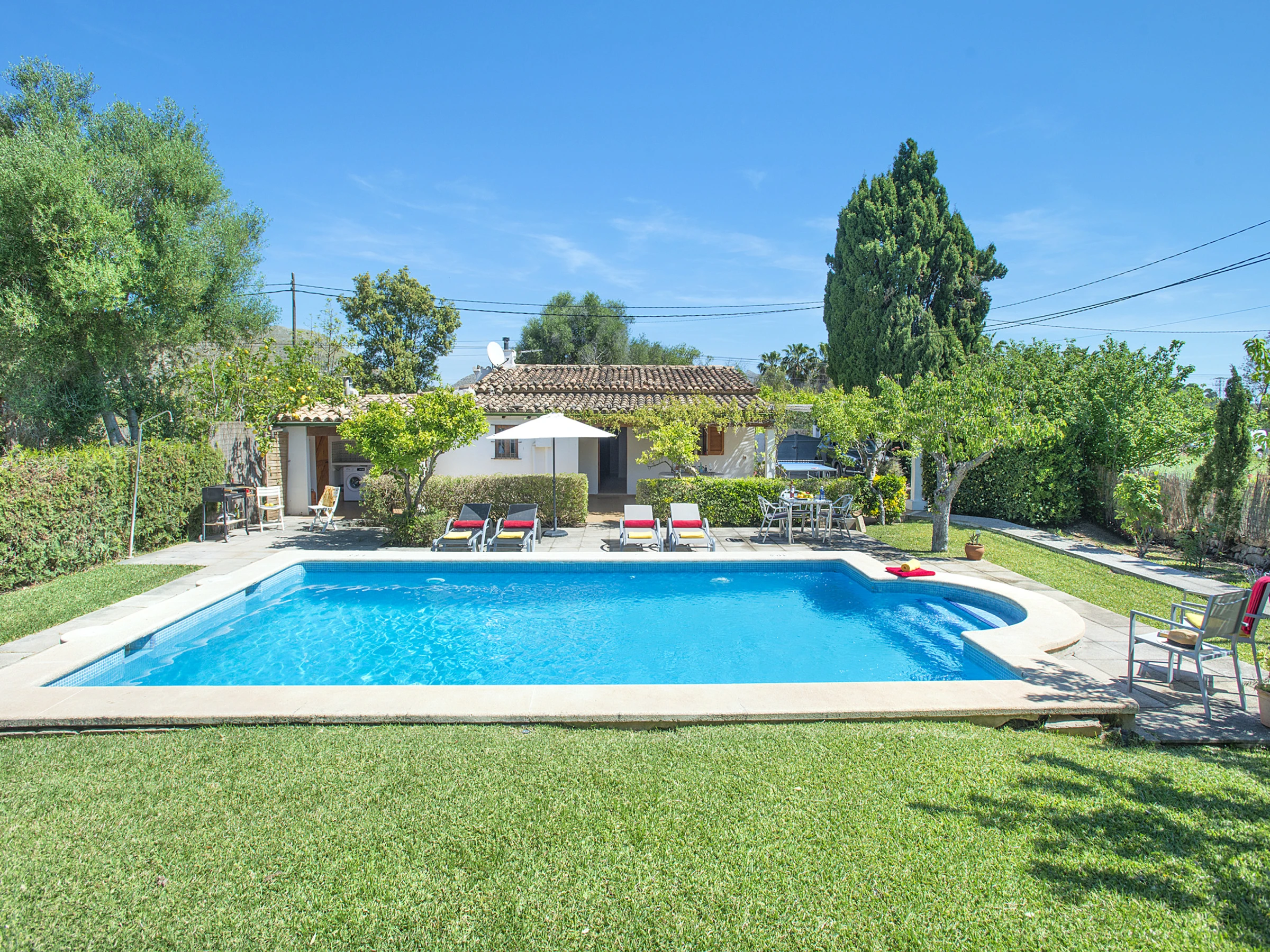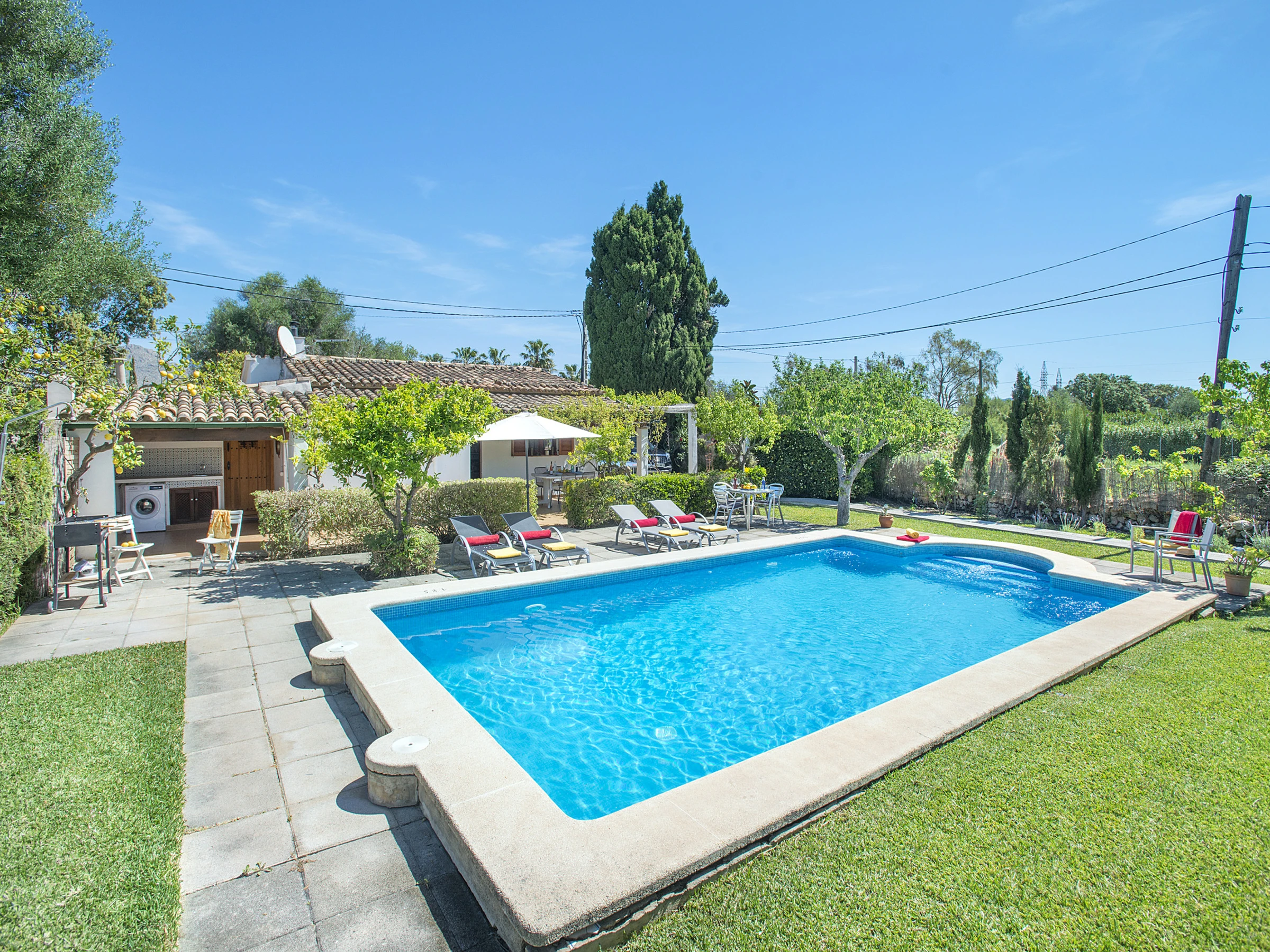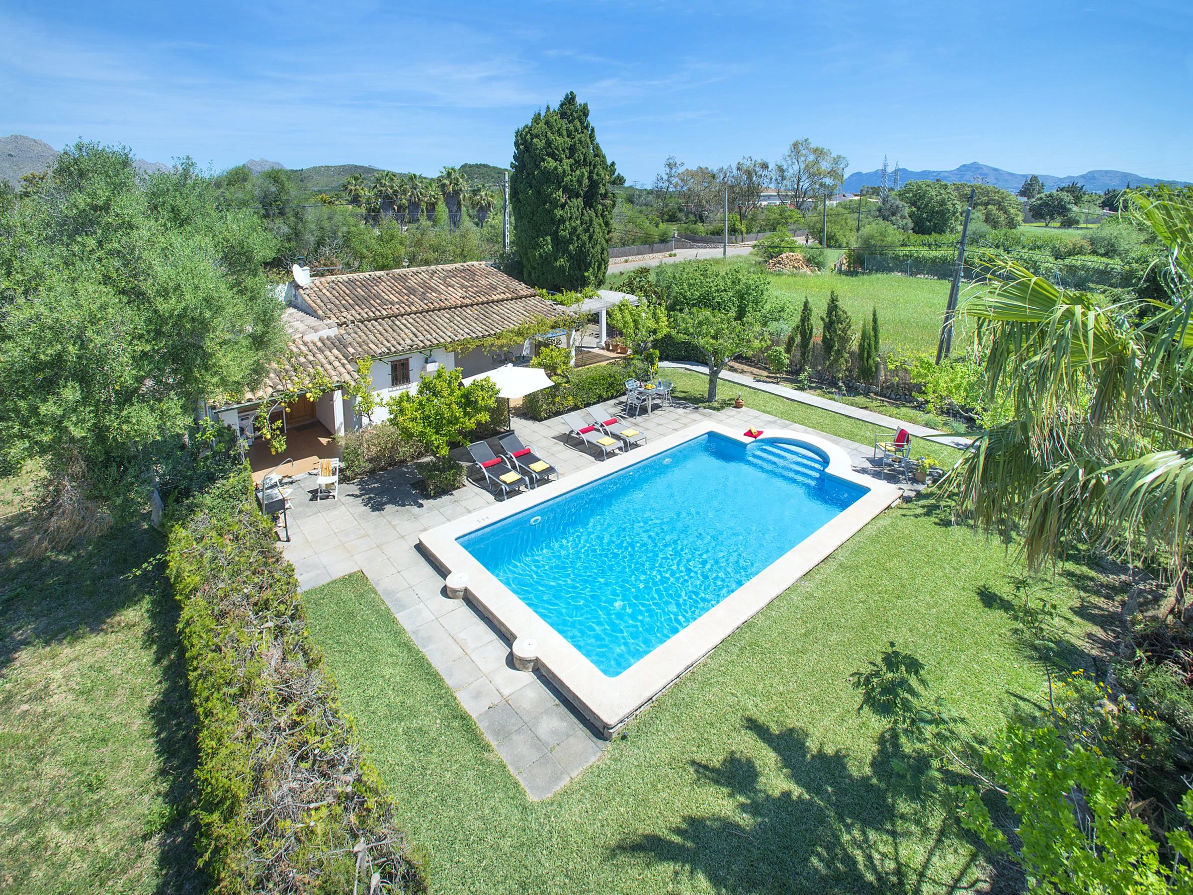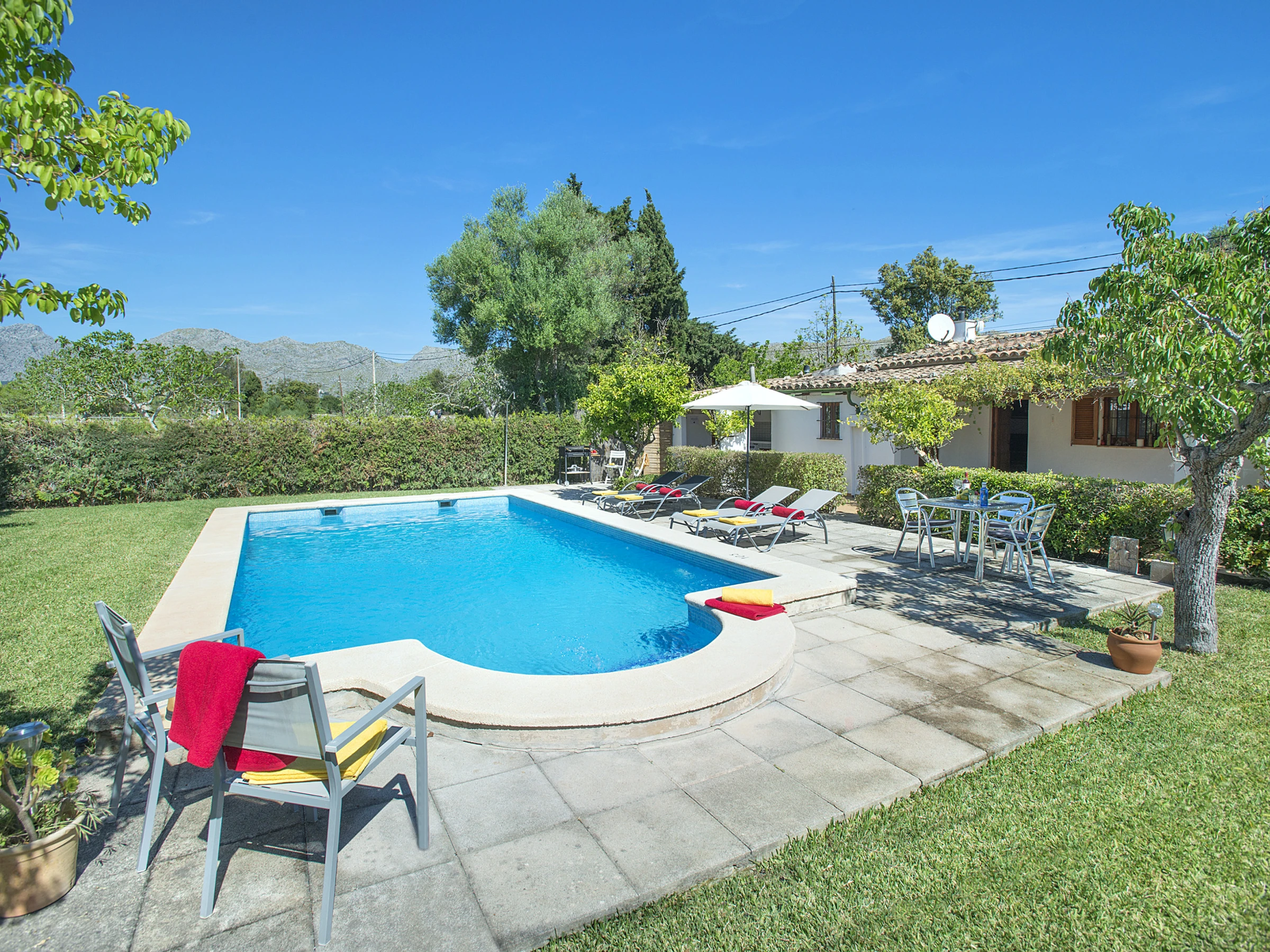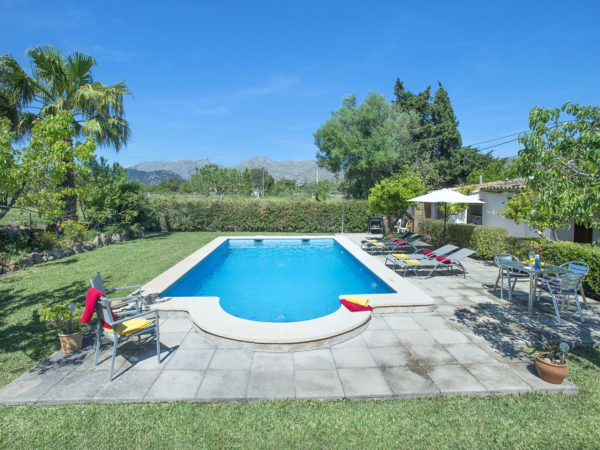 La maison est dans un style rustique typique de Majorque avec une terrasse meublée donnant sur le jardin et la piscine avec son espace gazonné. La terrasse et le jardin offrent une vue sur les montagnes de la Tramuntana et le monastère Puig de María près de Pollensa. La piscine mesure 8 par 4 mètres et n'est pas clôturée, comme c'est typique à Majorque.