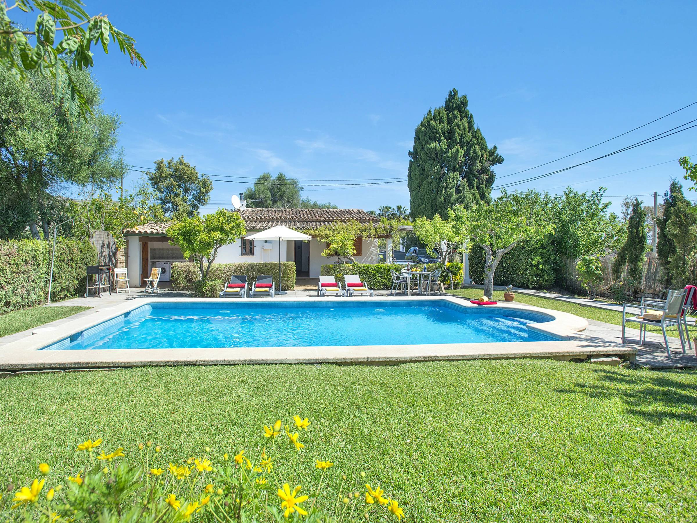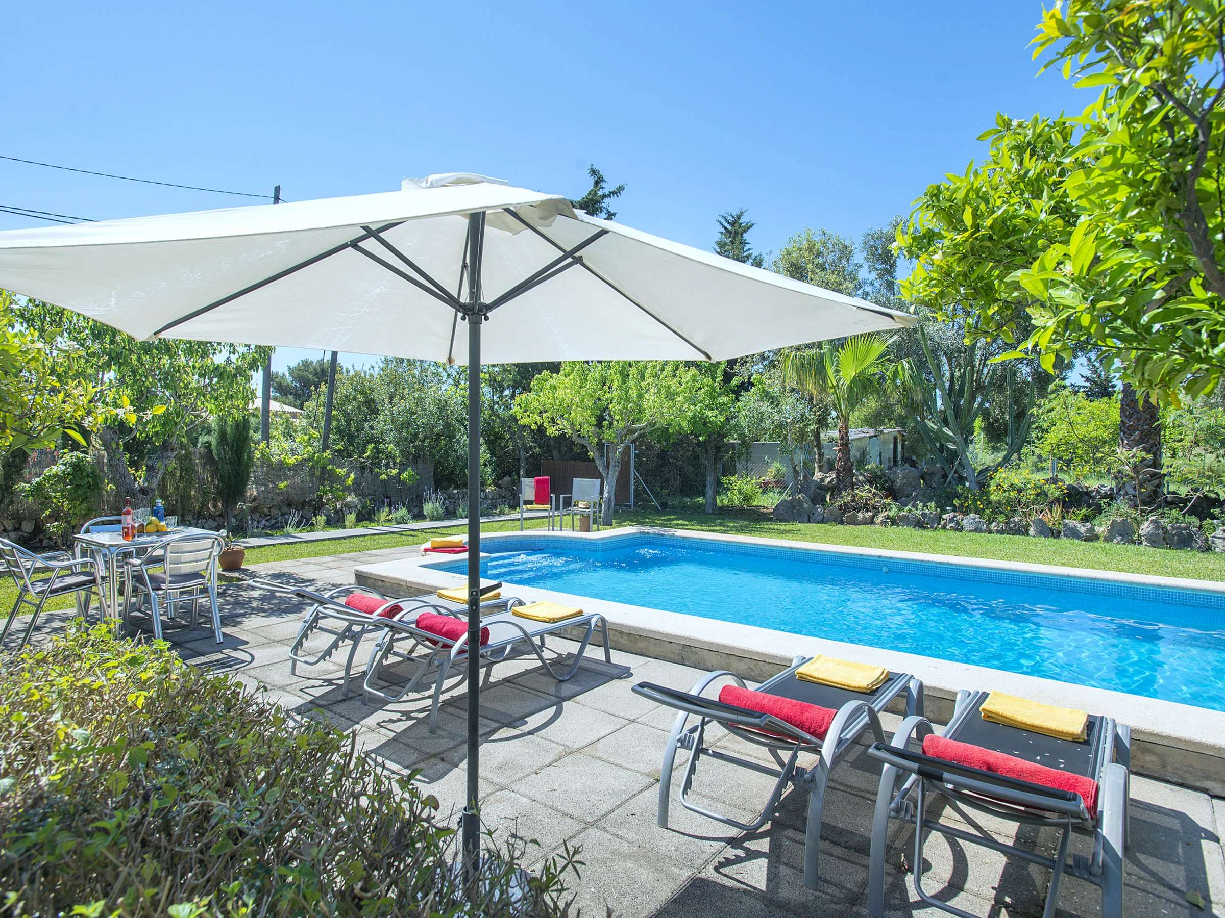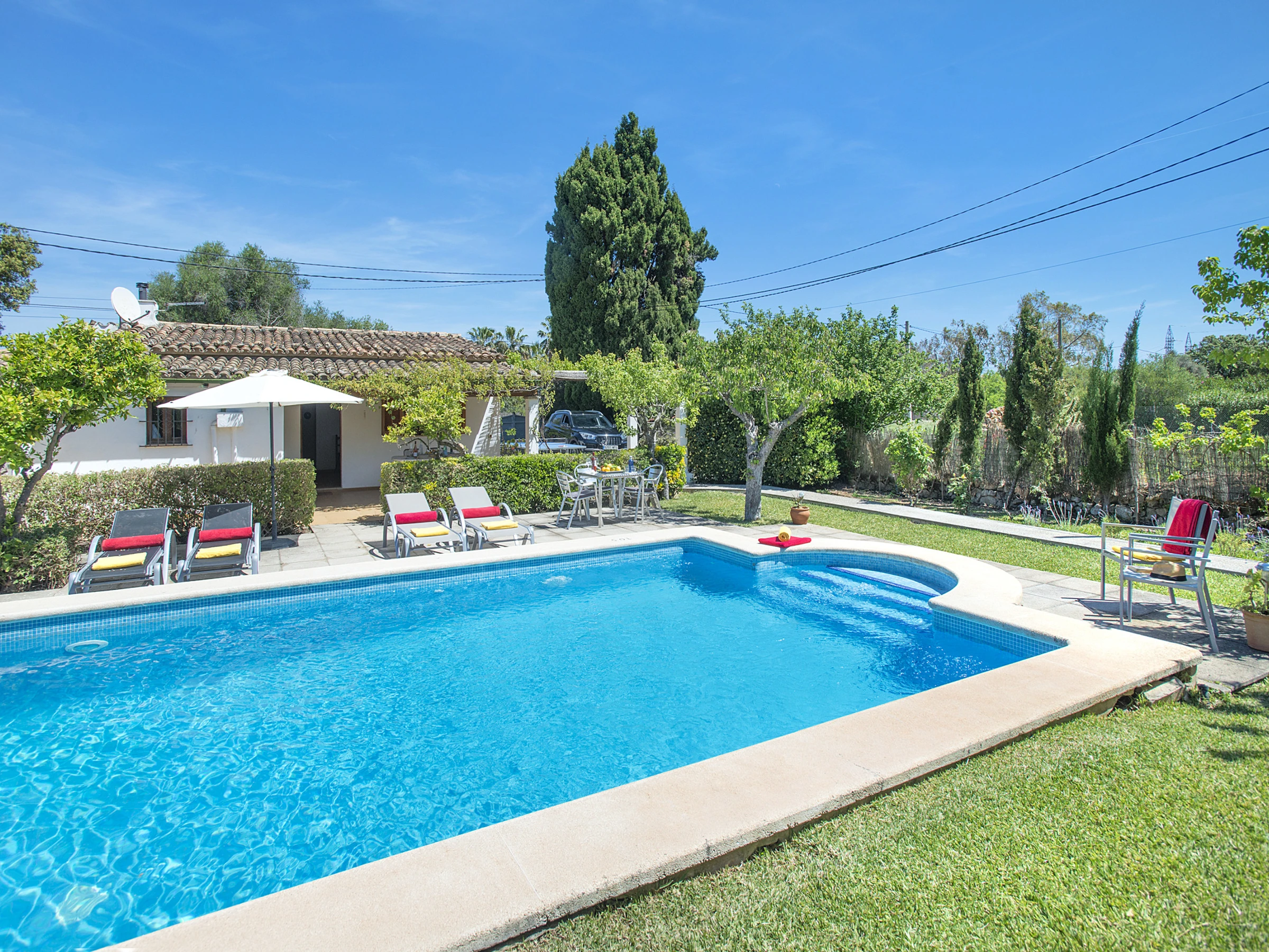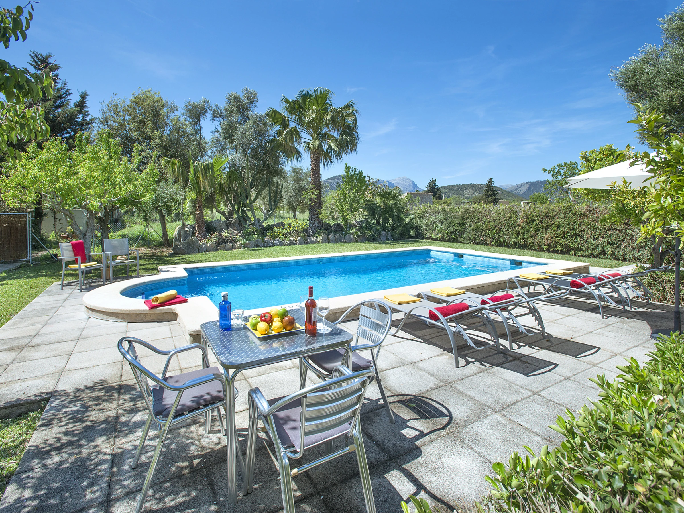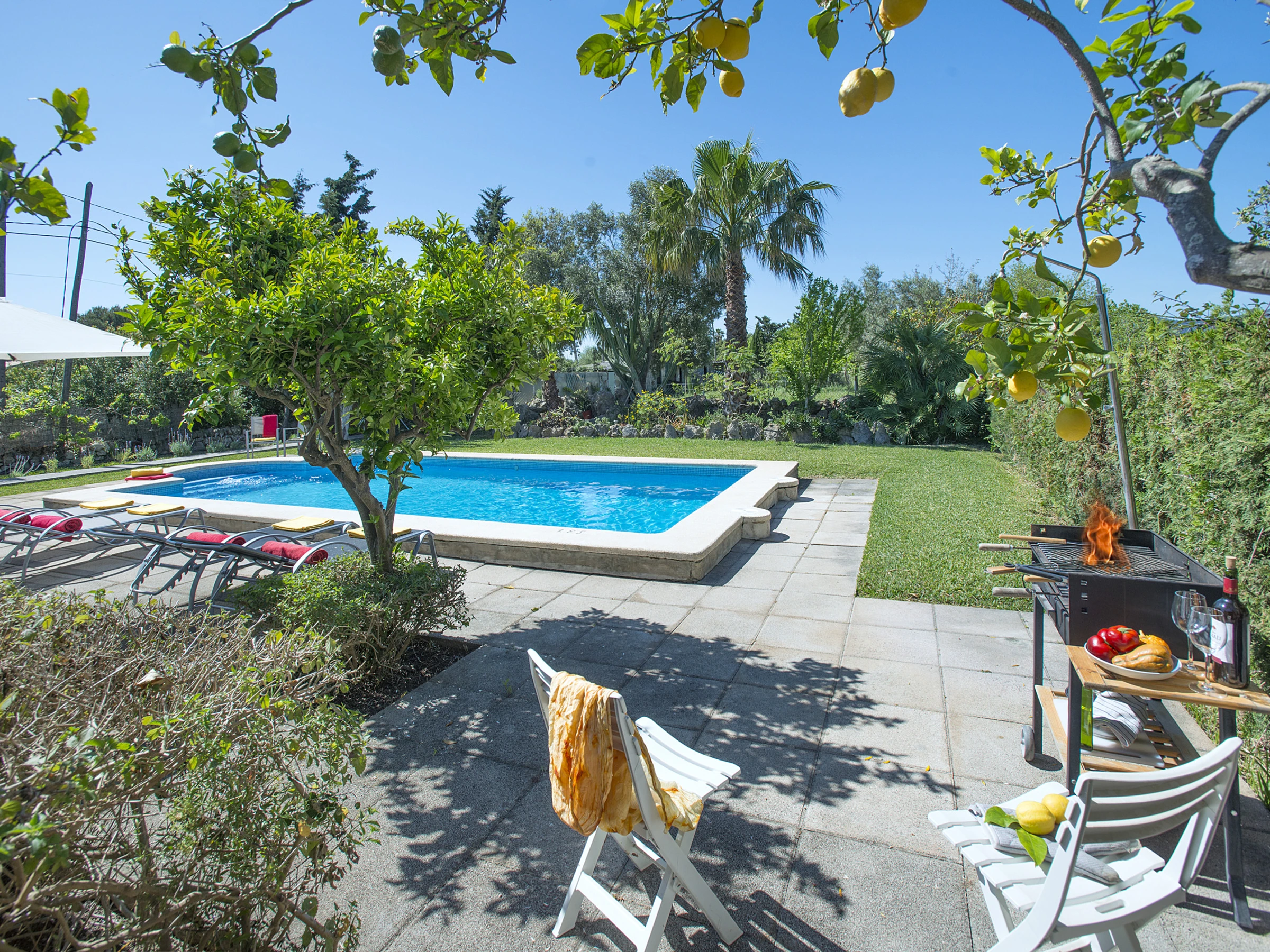 La maison est dans un style rustique typique de Majorque avec une terrasse meublée donnant sur le jardin et la piscine avec son espace gazonné. La terrasse et le jardin offrent une vue sur les montagnes de la Tramuntana et le monastère Puig de María près de Pollensa. La piscine mesure 8 par 4 mètres et n'est pas clôturée, comme c'est typique à Majorque.