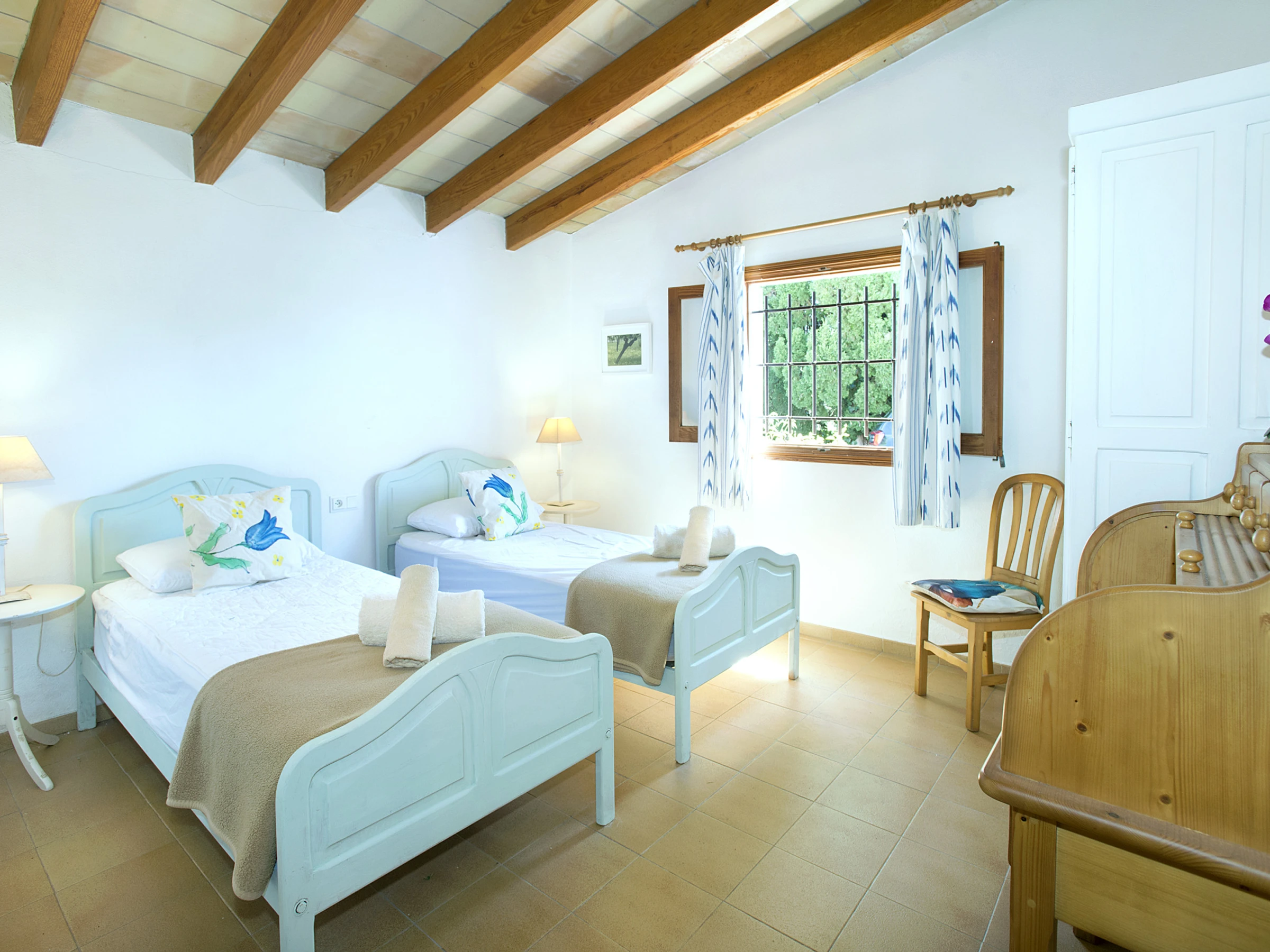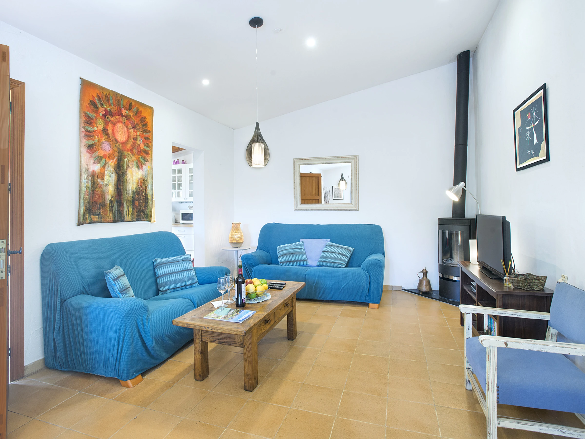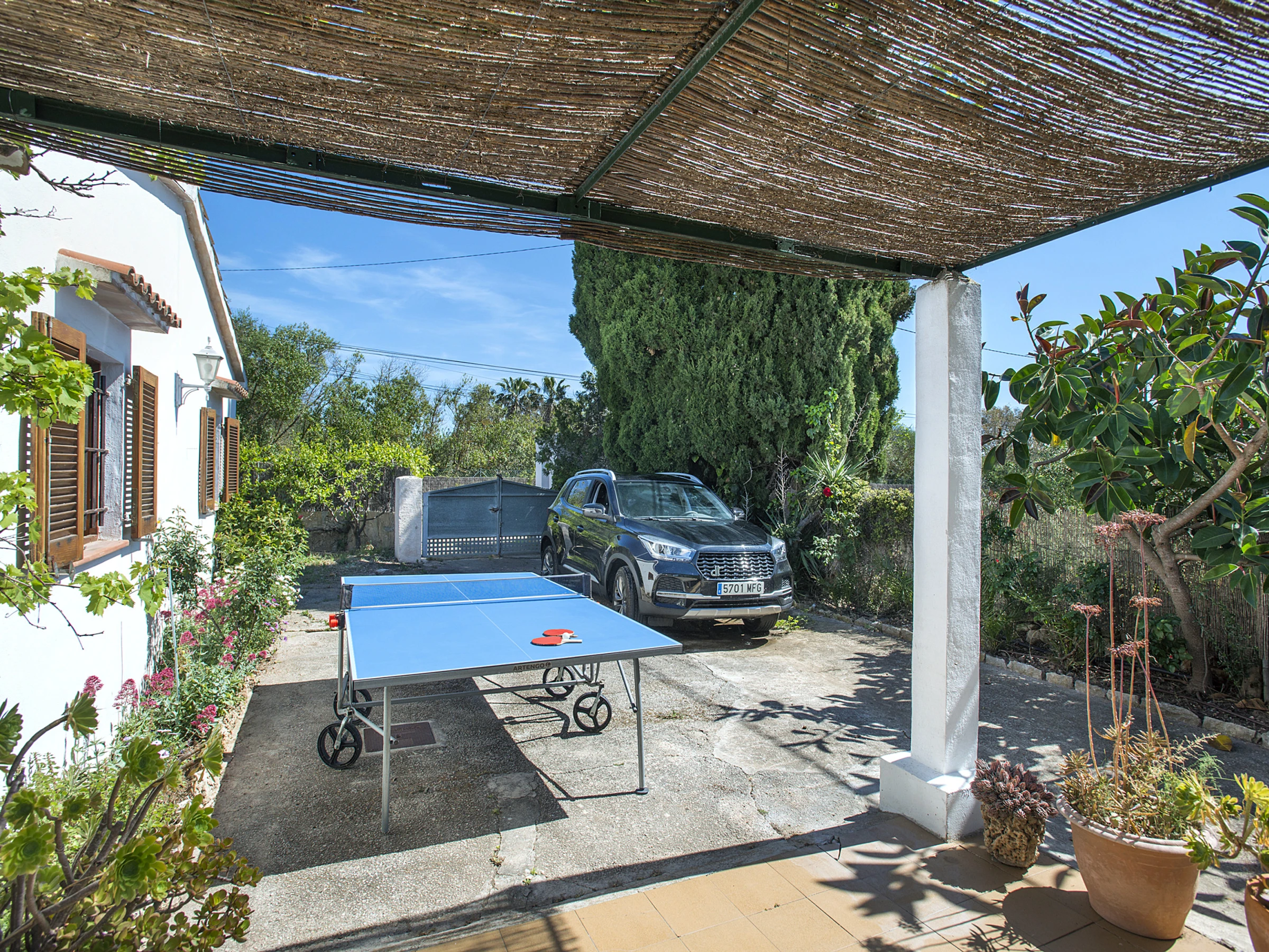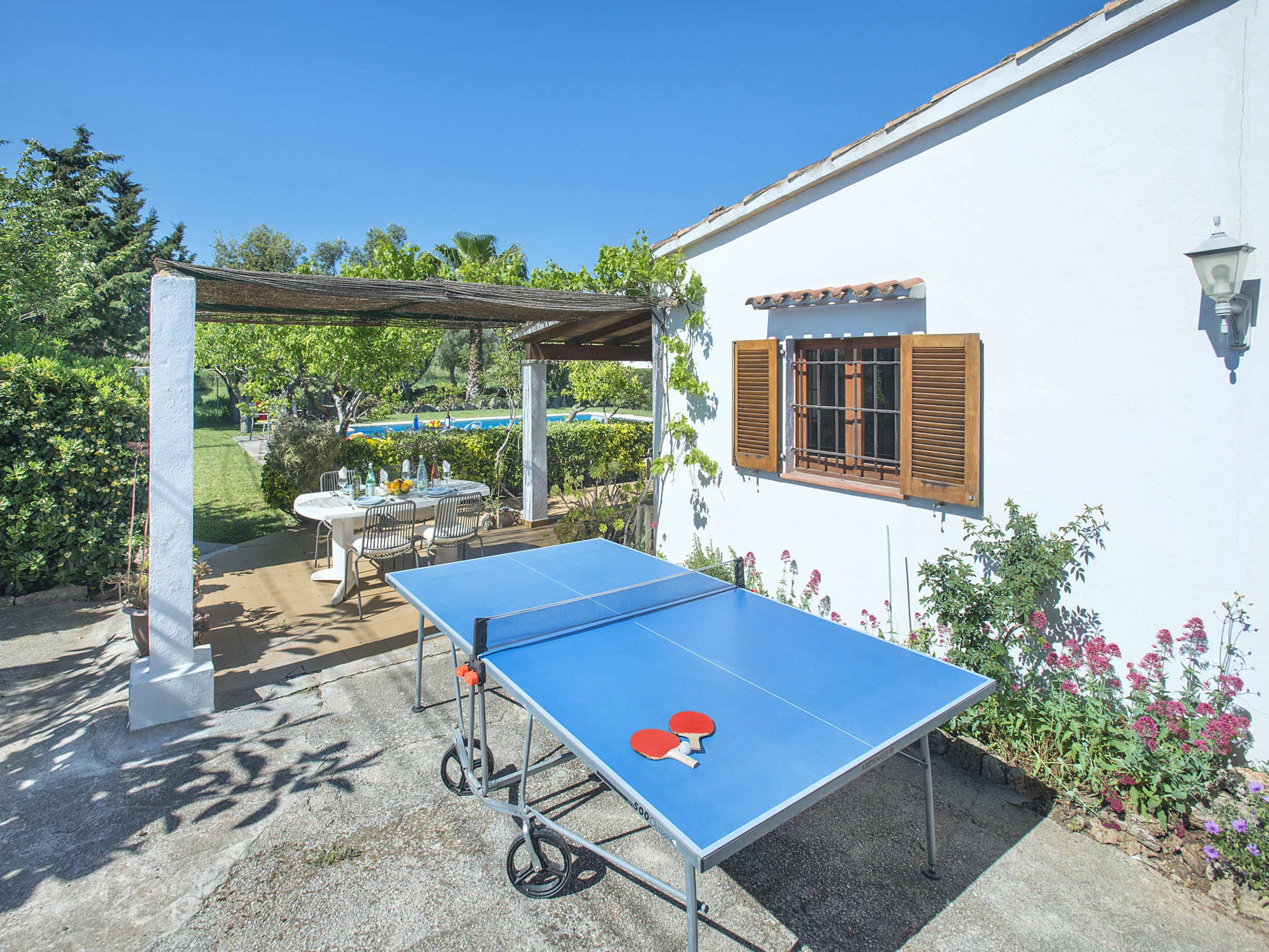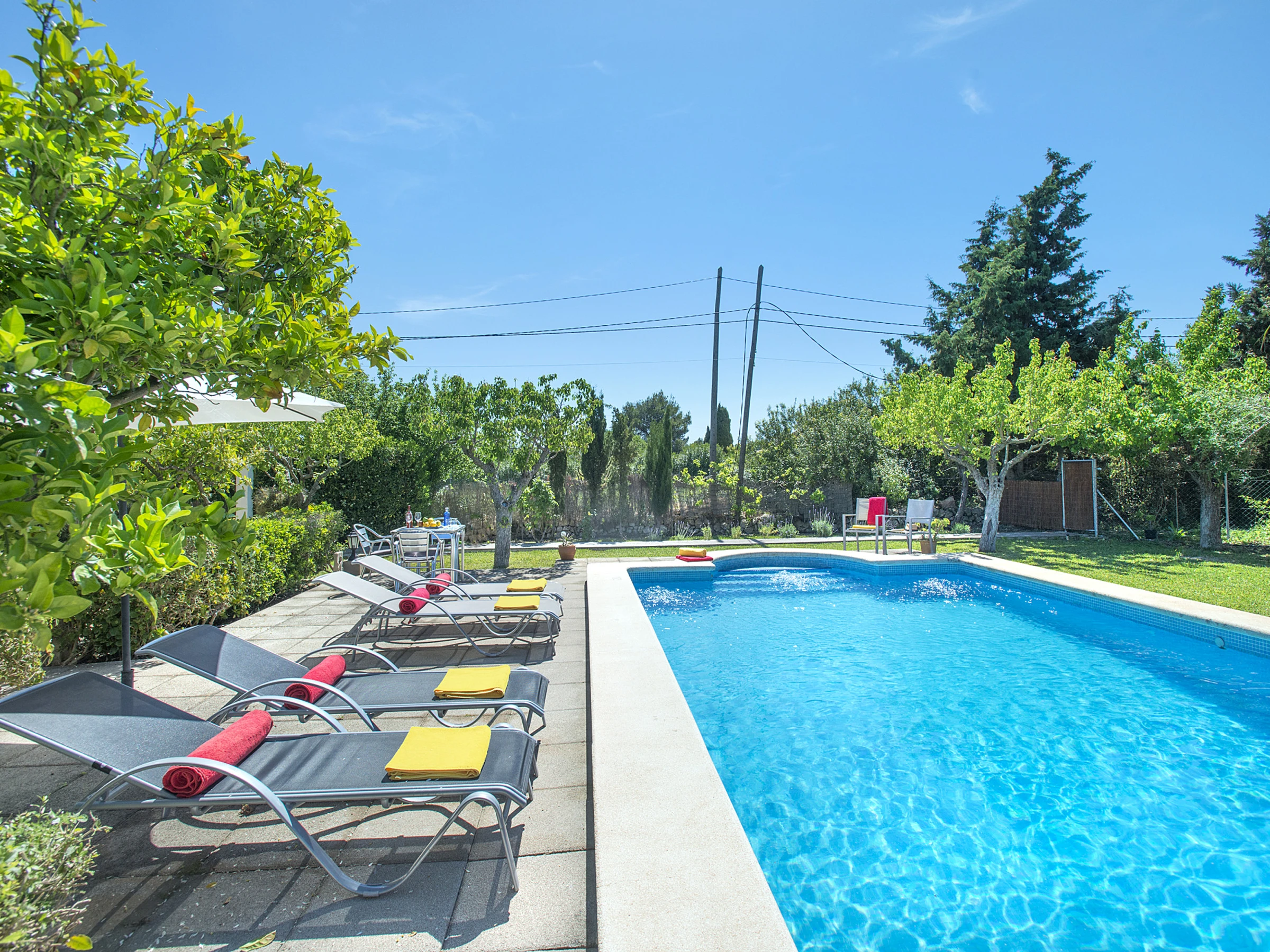 La maison est dans un style rustique typique de Majorque avec une terrasse meublée donnant sur le jardin et la piscine avec son espace gazonné. La terrasse et le jardin offrent une vue sur les montagnes de la Tramuntana et le monastère Puig de María près de Pollensa. La piscine mesure 8 par 4 mètres et n'est pas clôturée, comme c'est typique à Majorque.