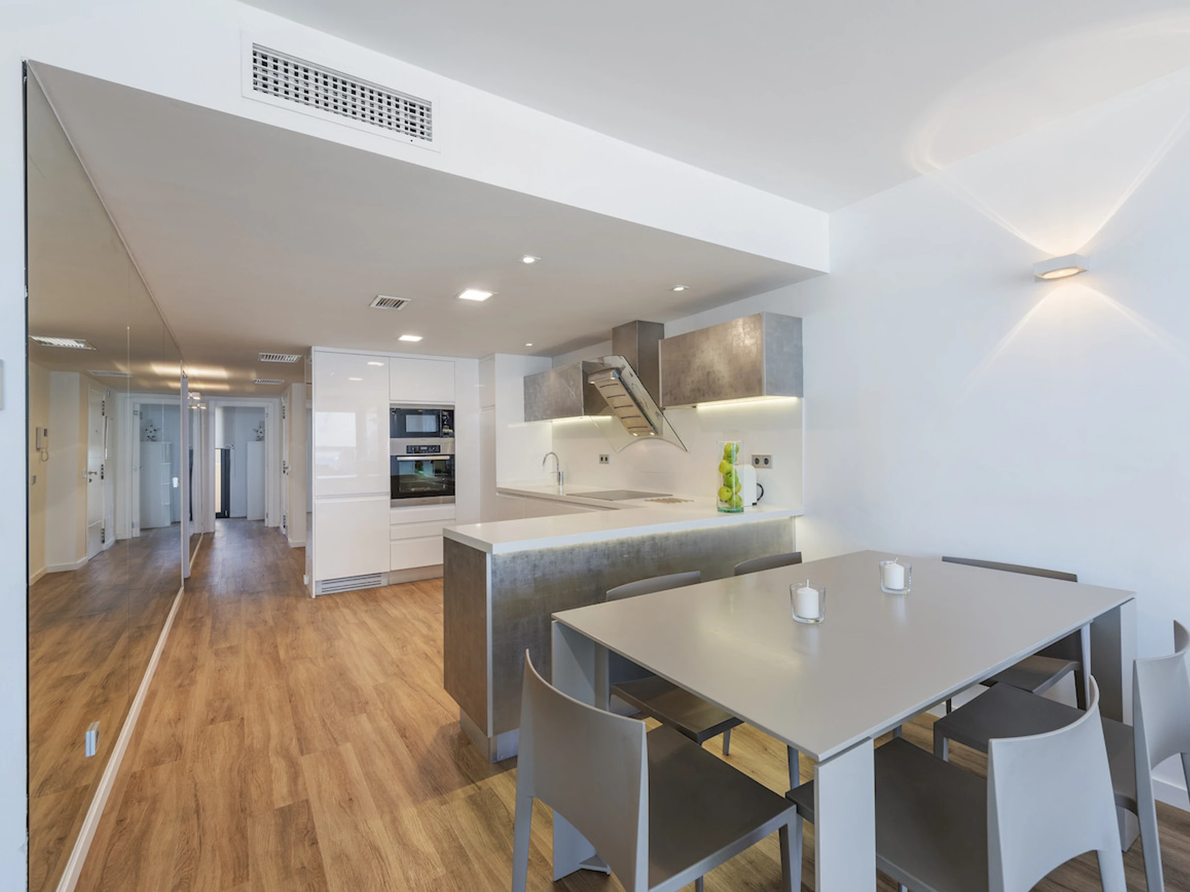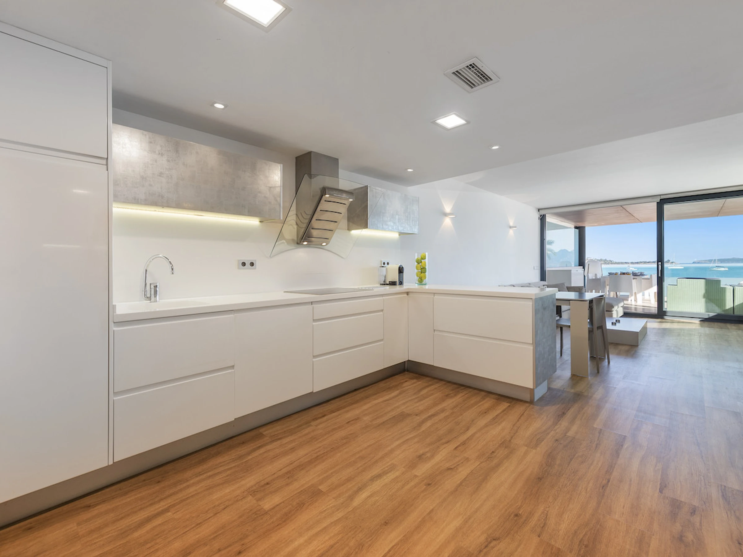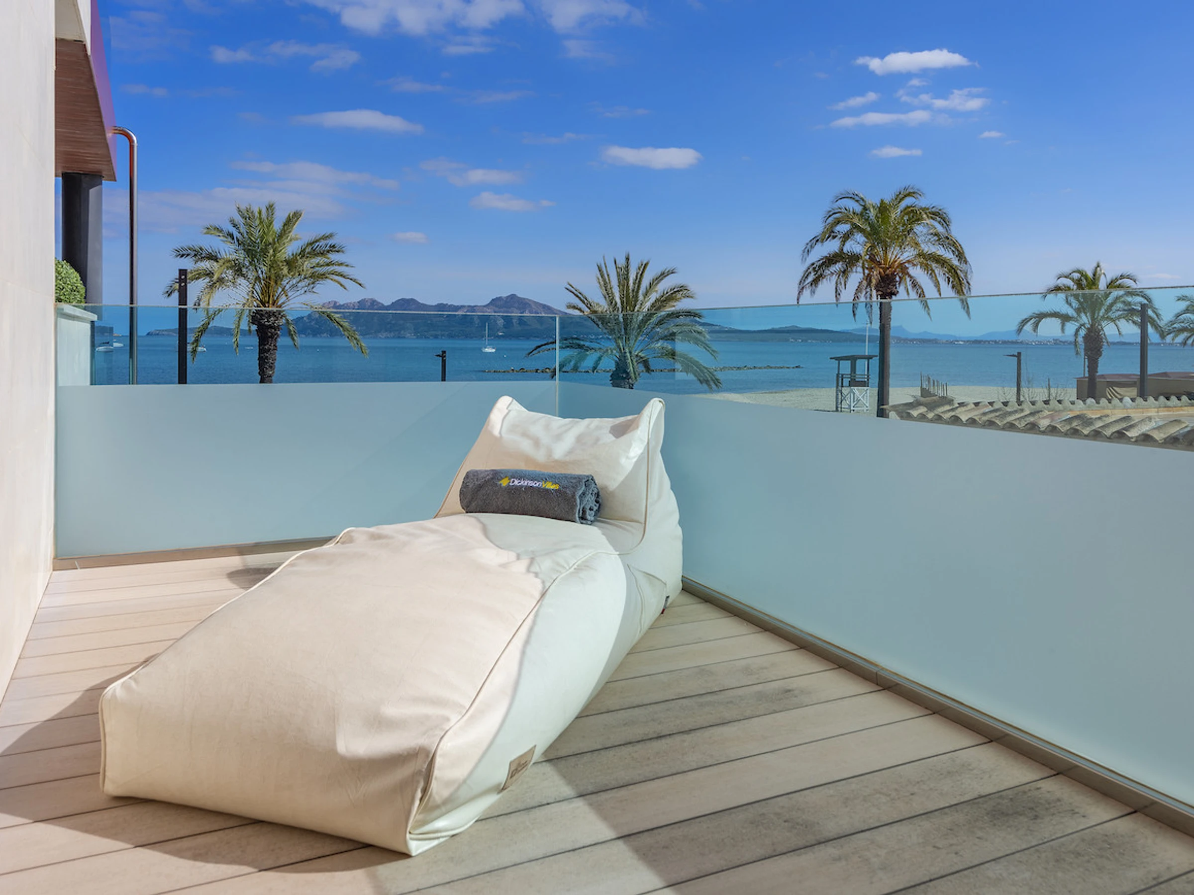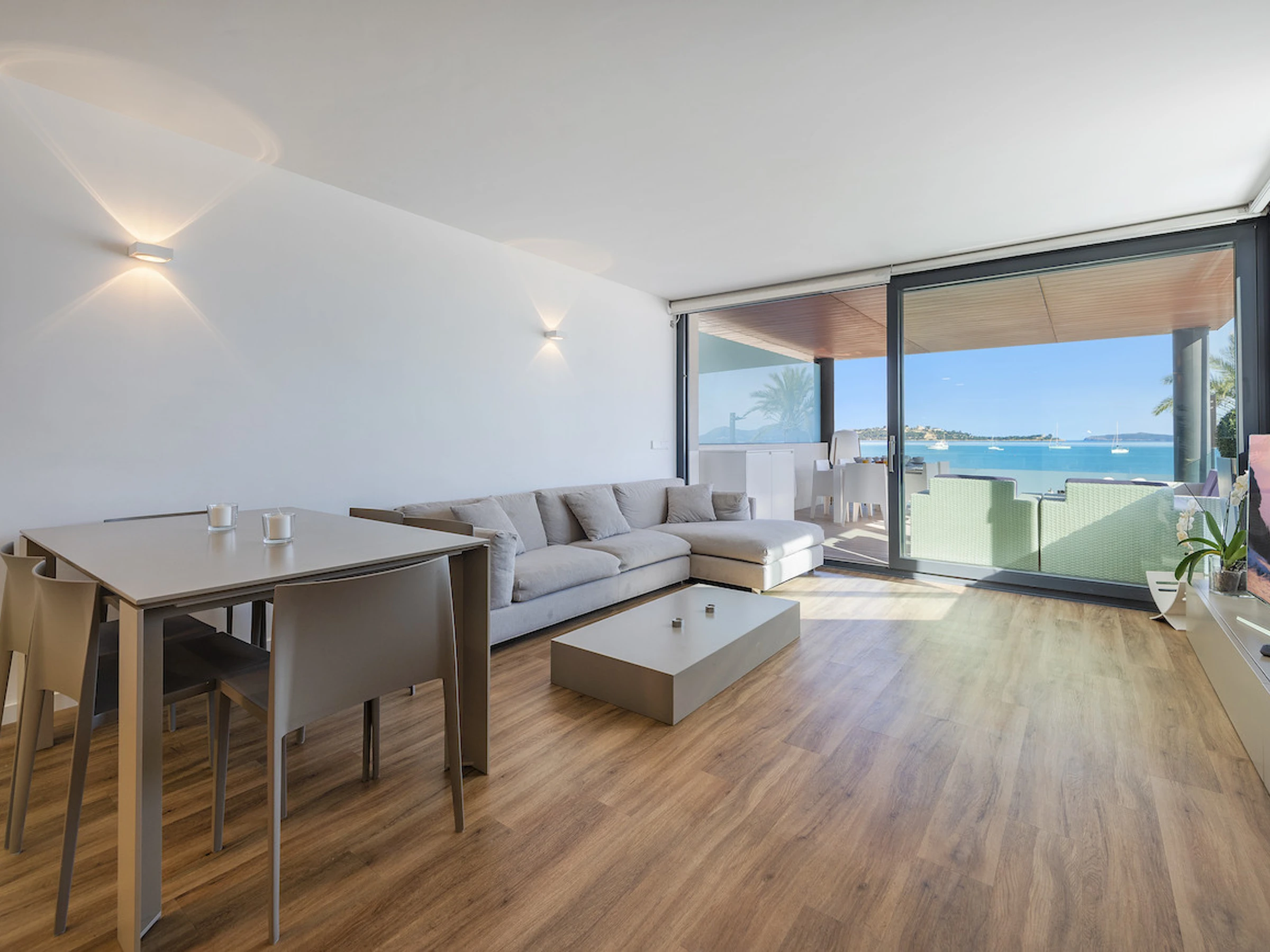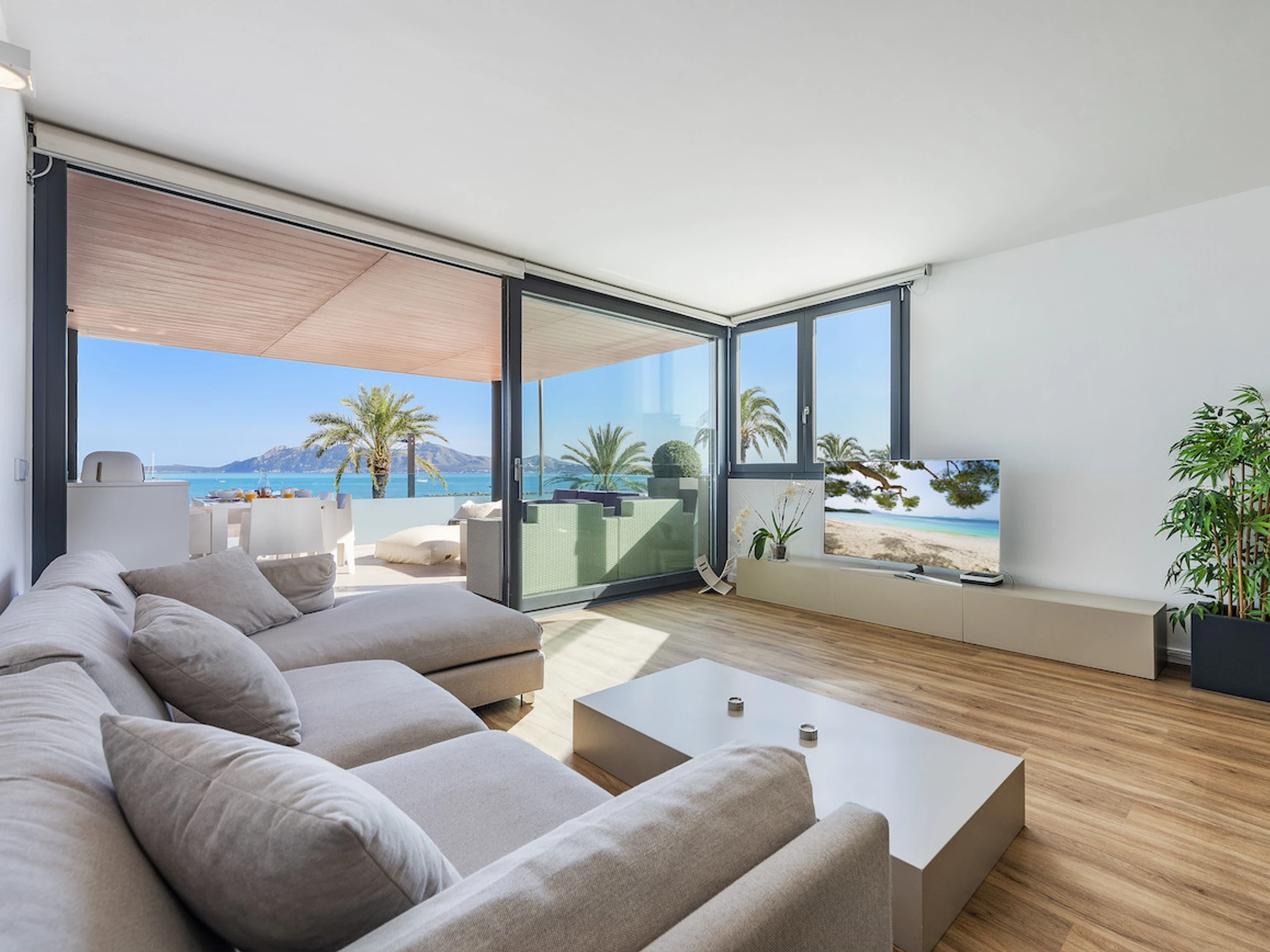 Logement de 100 m² meublé avec goût et moderne, situé en front de plage, avec vue sur la mer et la montagne.