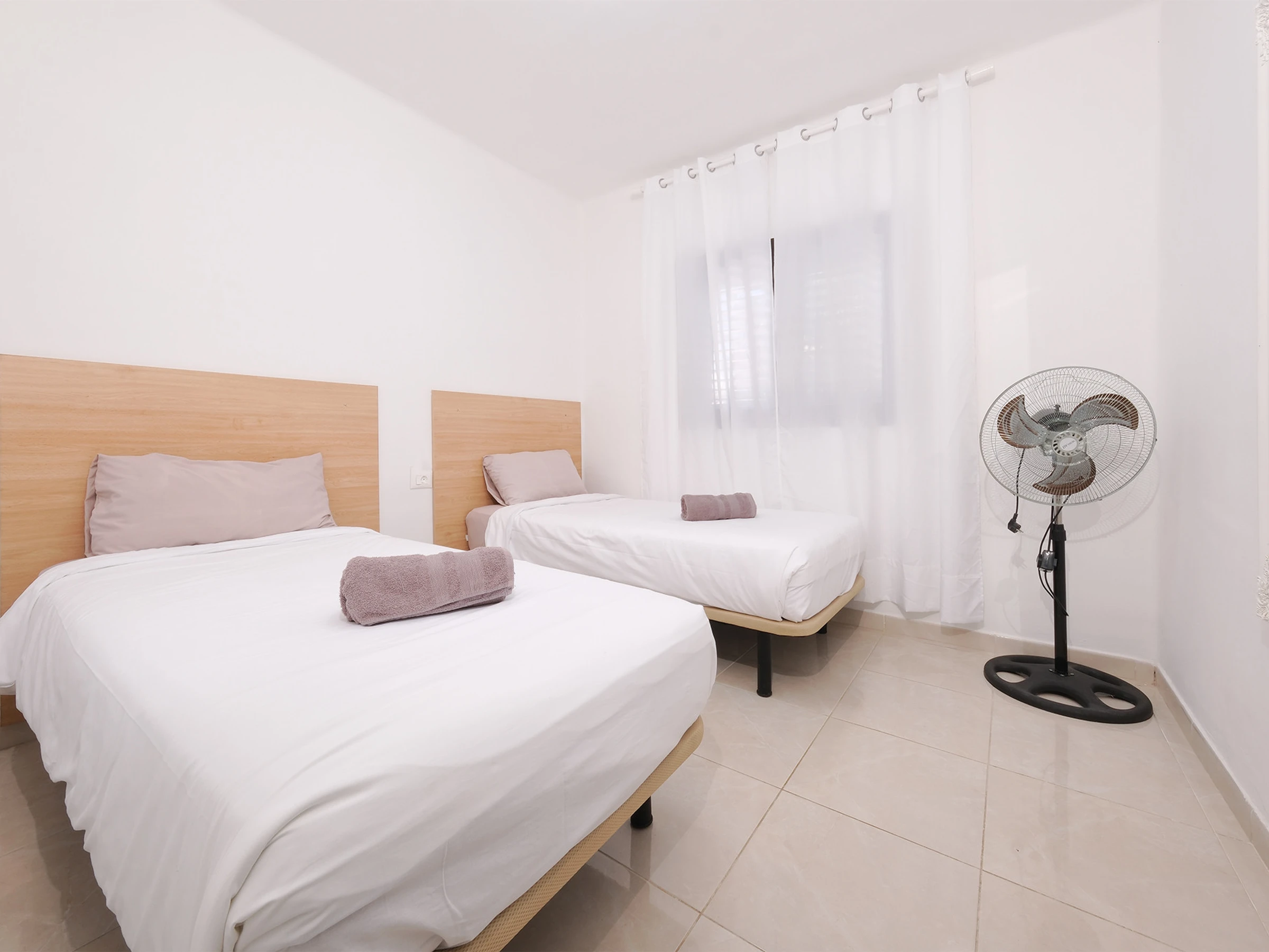 La troisième chambre est meublée avec deux lits simples et dispose d'un ventilateur pour garder la pièce fraîche. Toutes les chambres sont bien éclairées et décorées dans un style chaleureux.