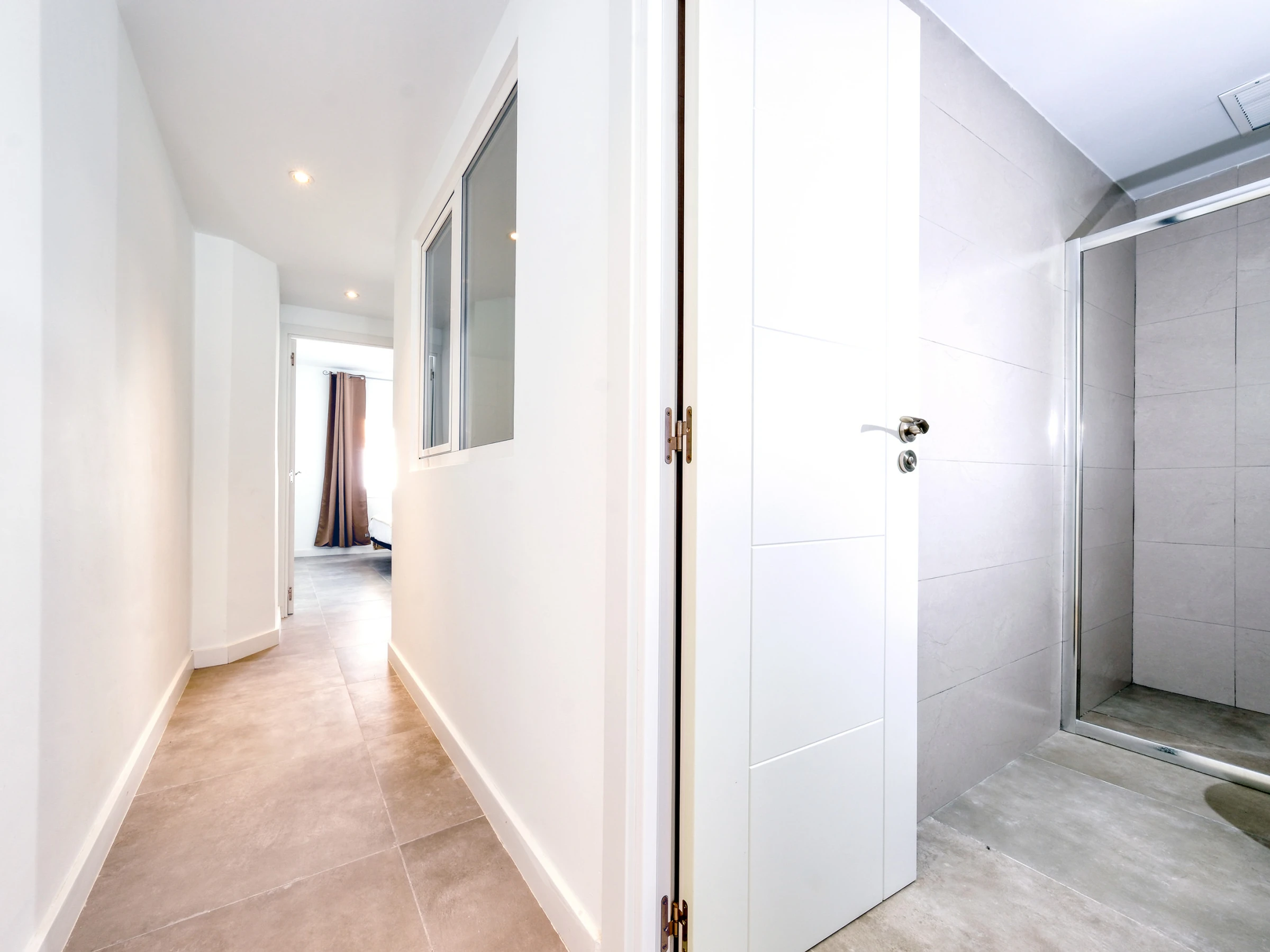 La salle de bain suit la même ligne de modernité et de fonctionnalité, avec une douche spacieuse, un lavabo avec miroir éclairé et un rangement suffisant pour les articles de toilette et un sèche-cheveux. Son design minimaliste apporte une sensation de propreté et de fraîcheur, complétant le style du reste de la résidence.