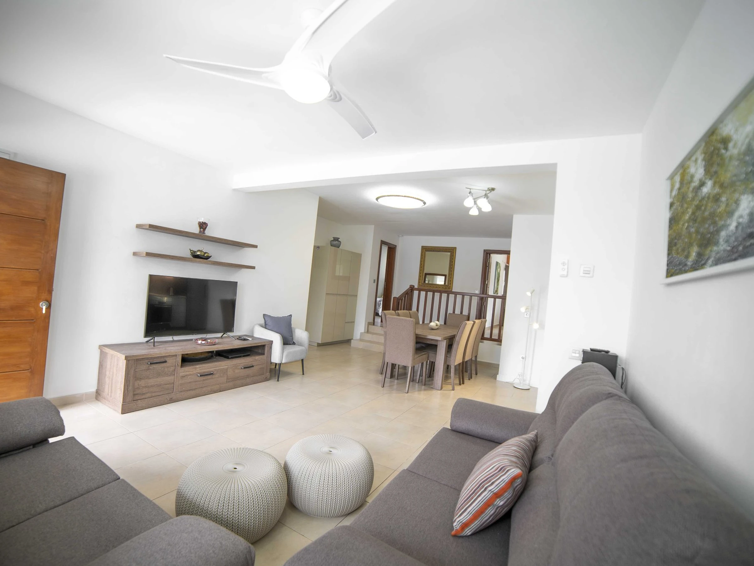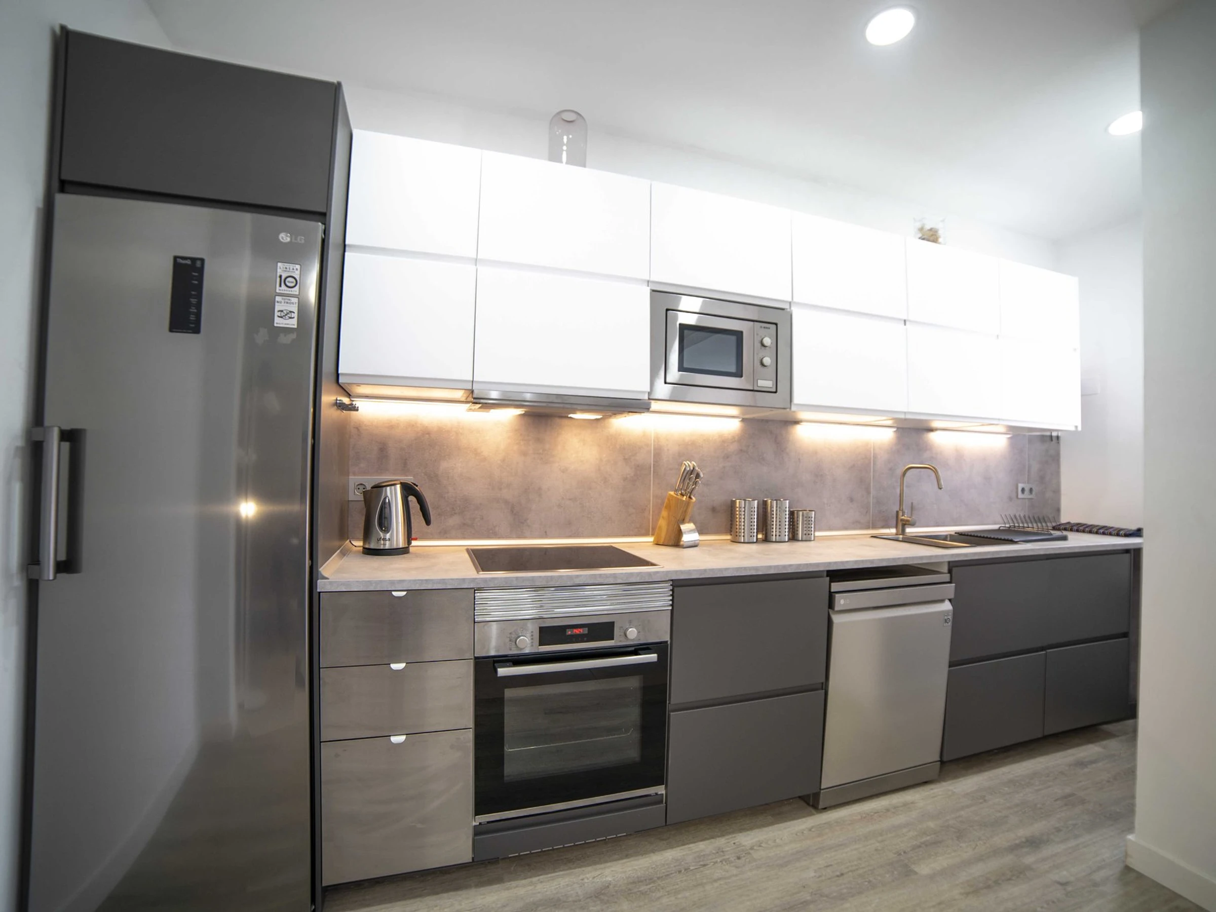 La cuisine, est équipée avec réfrigérateur, micro-ondes, four, congélateur, lave-vaisselle, cafetière, grille pain et bouilloire.