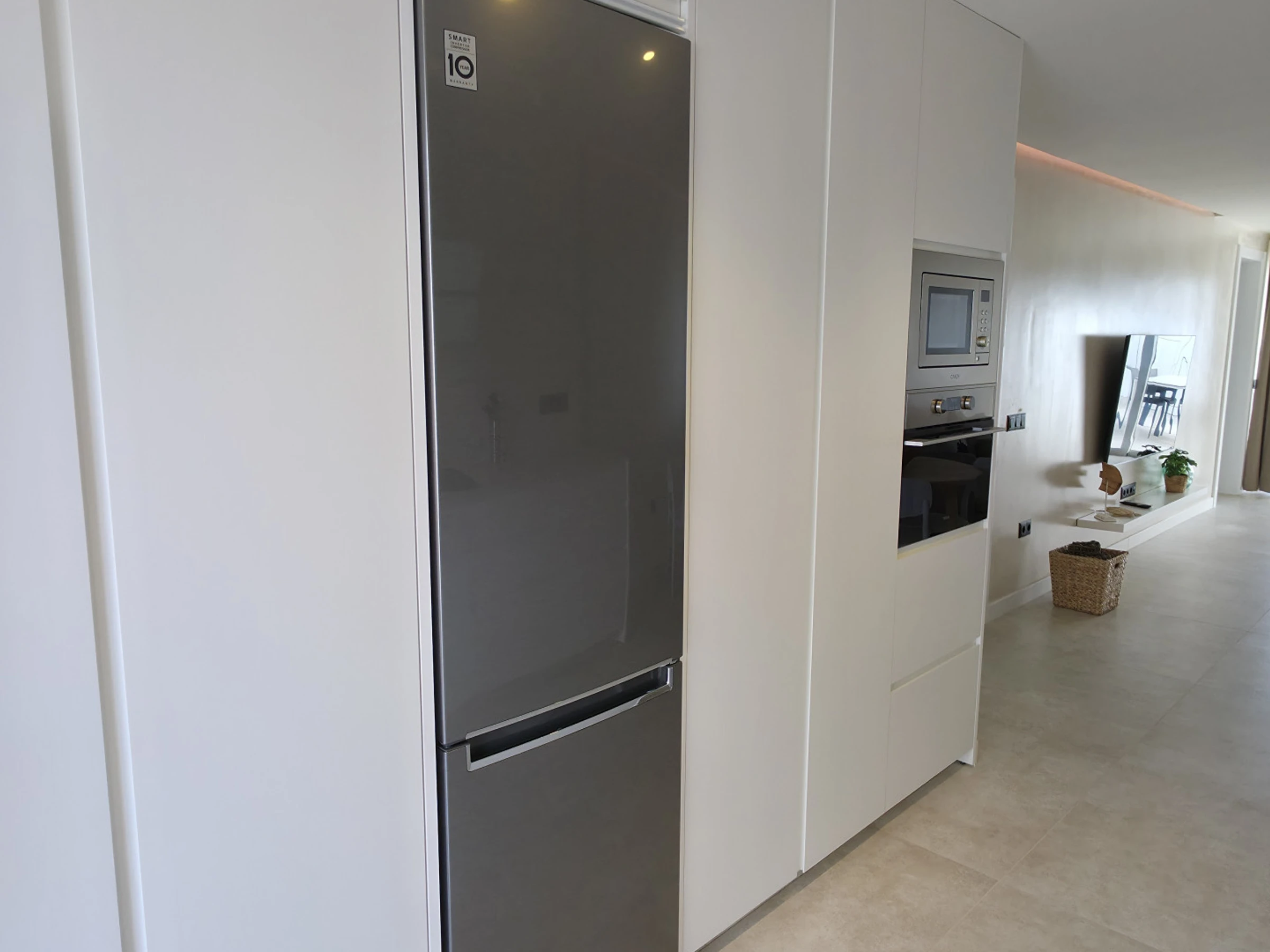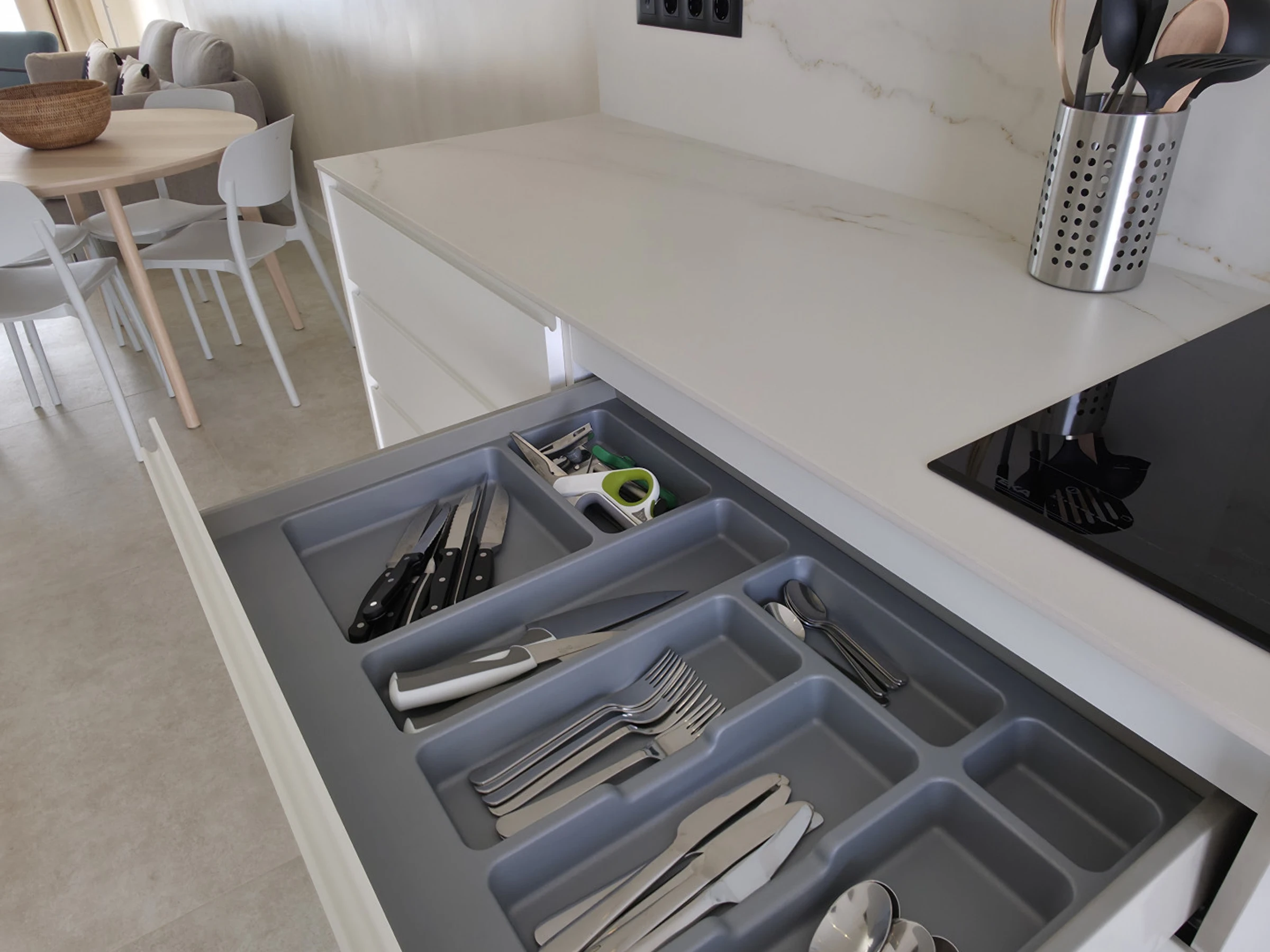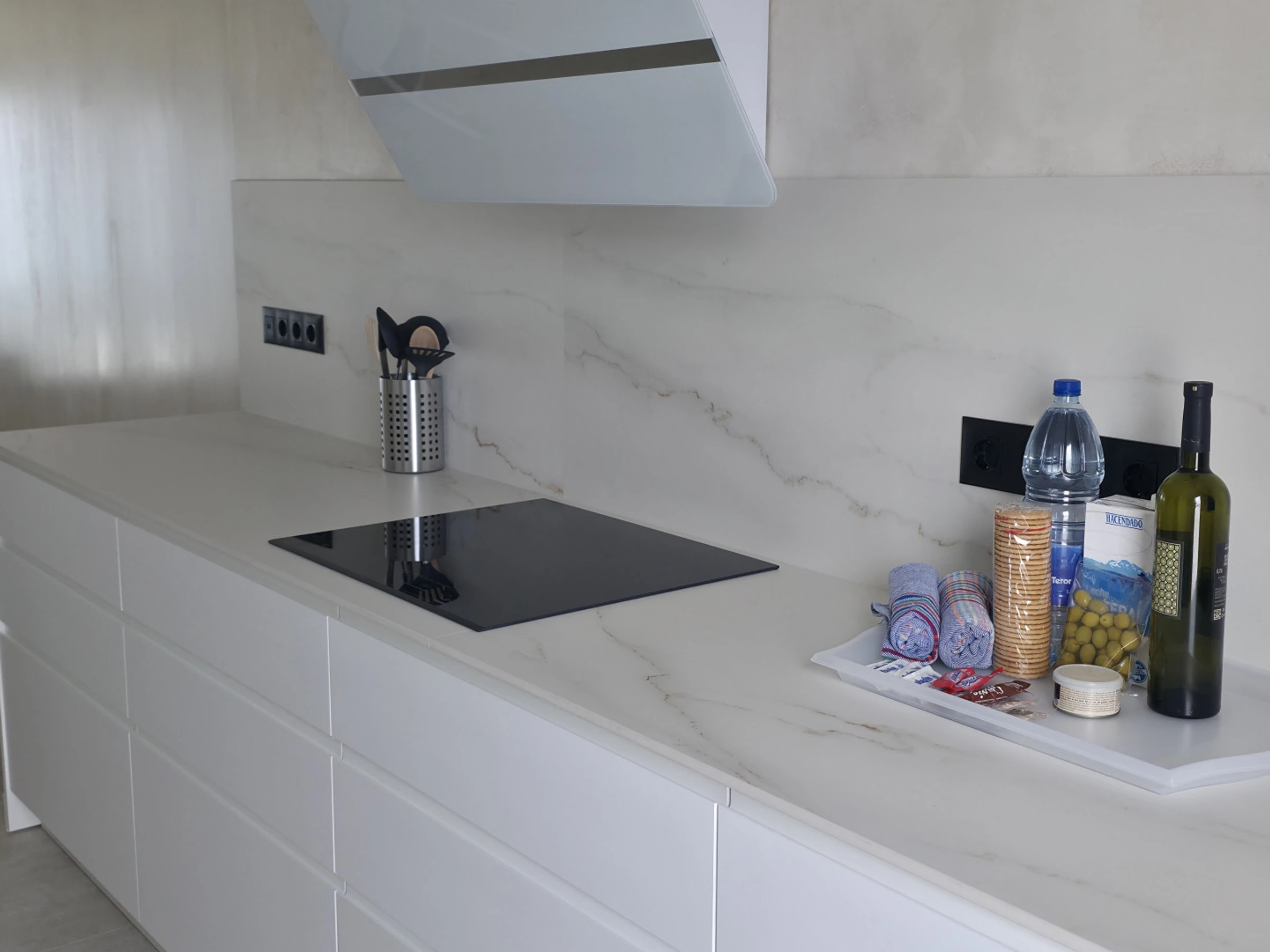 La cuisine indépendante, à induction, est équipée avec réfrigérateur, micro-ondes, four, congélateur, lave-vaisselle, cafetière, grille pain, bouilloire et presse-agrumes.