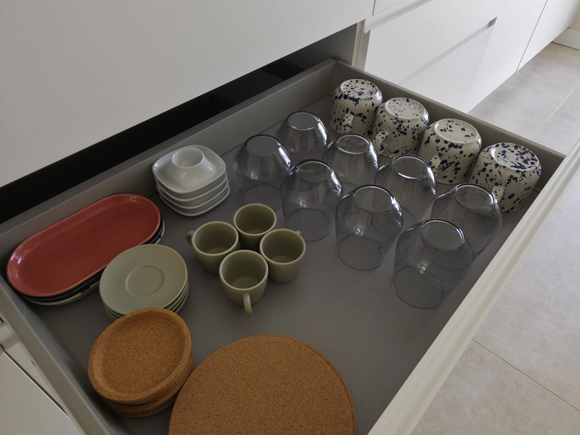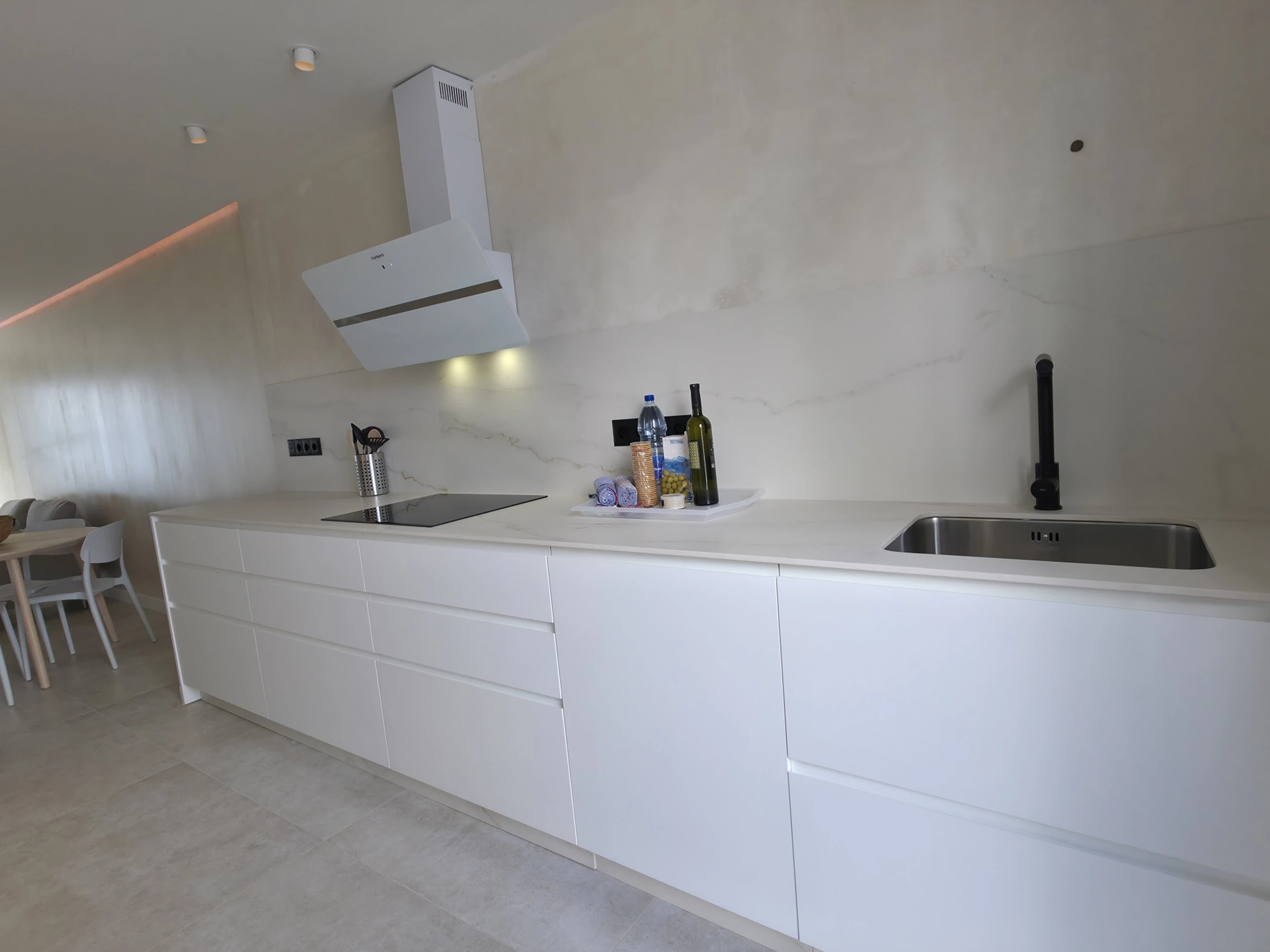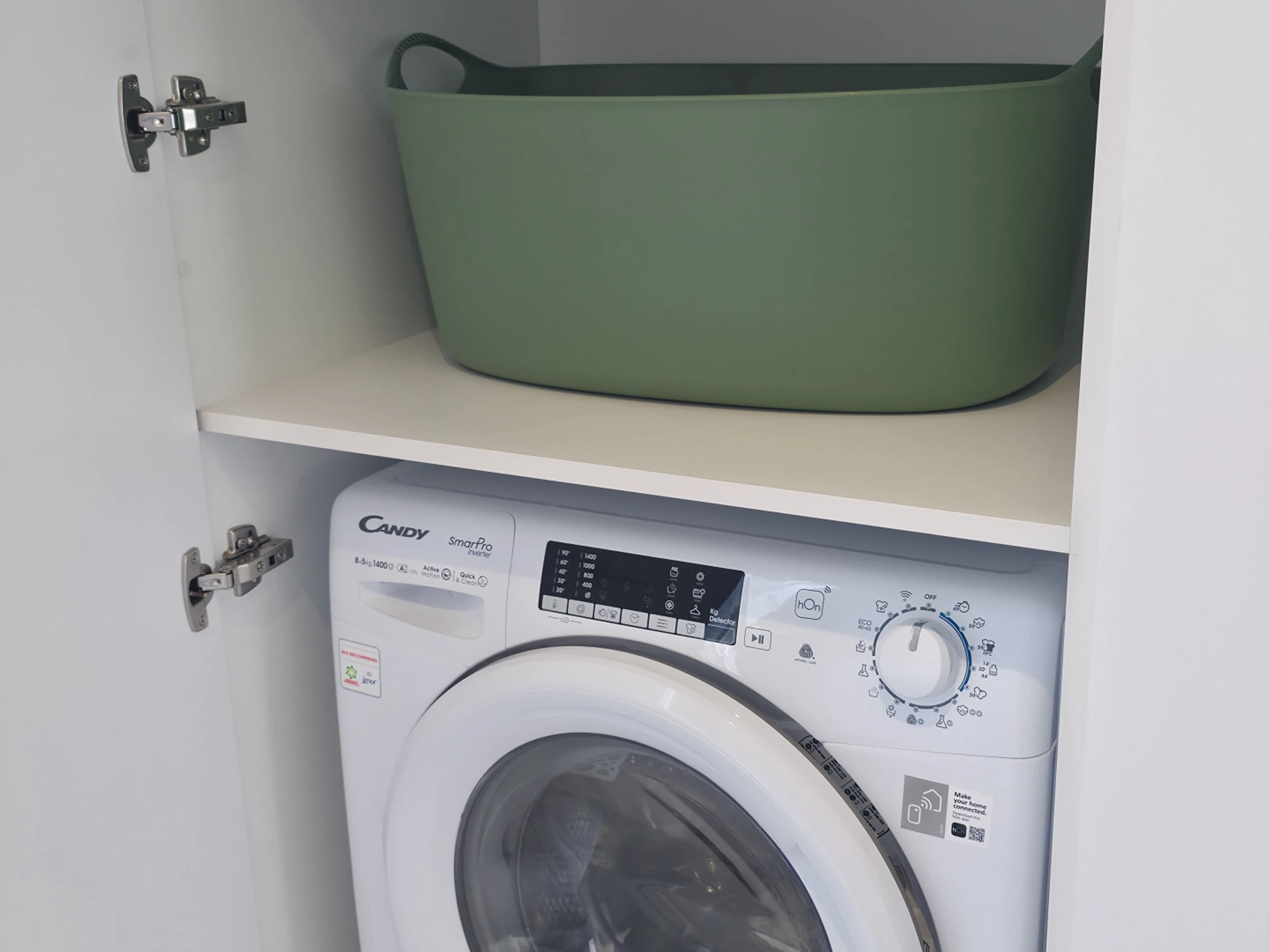 La cuisine indépendante, à induction, est équipée avec réfrigérateur, micro-ondes, four, congélateur, lave-vaisselle, cafetière, grille pain, bouilloire et presse-agrumes.