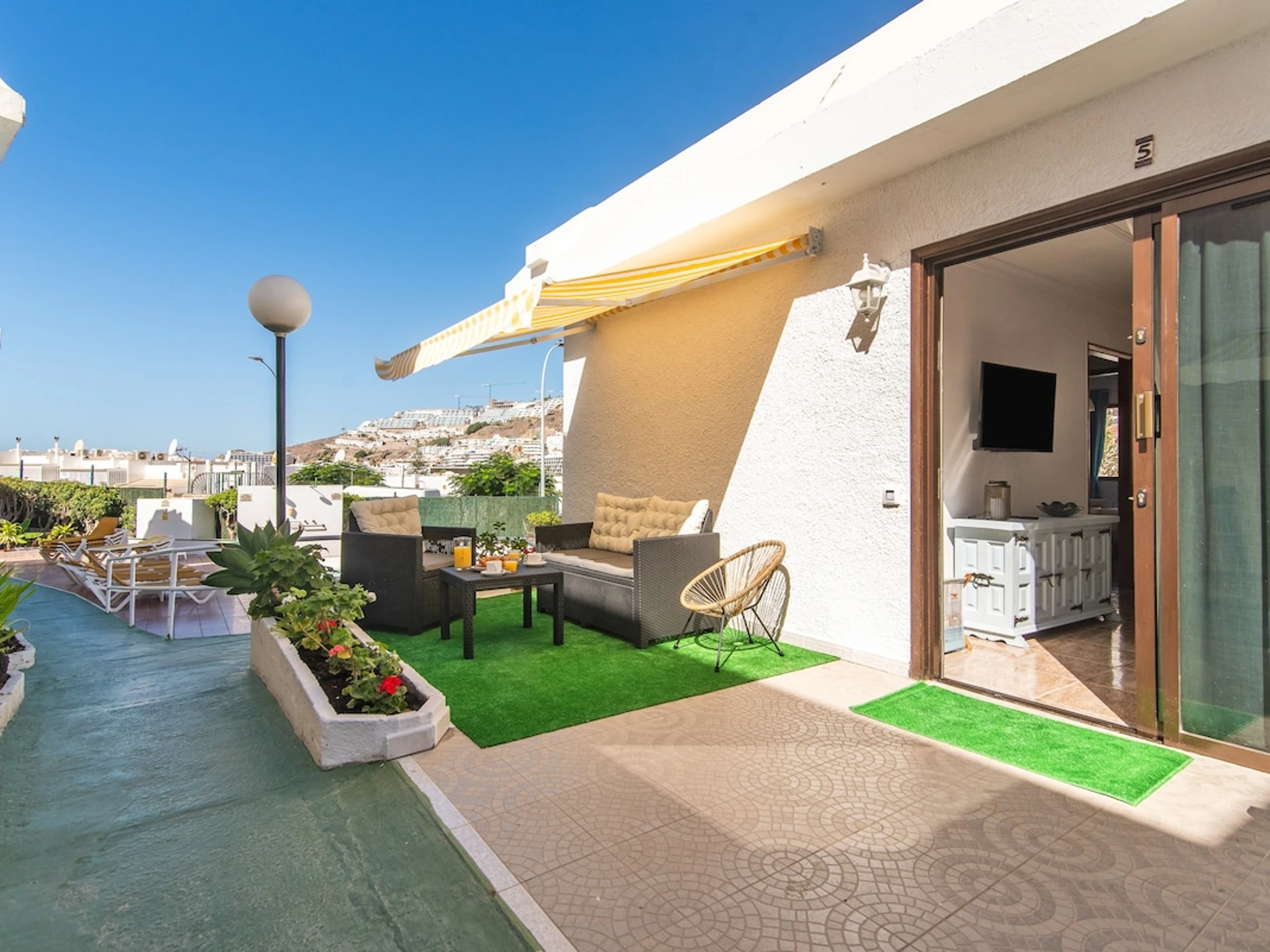 Elle dispose de terrasse, lave-linge, fer à repasser, sèche-cheveux, TV.
