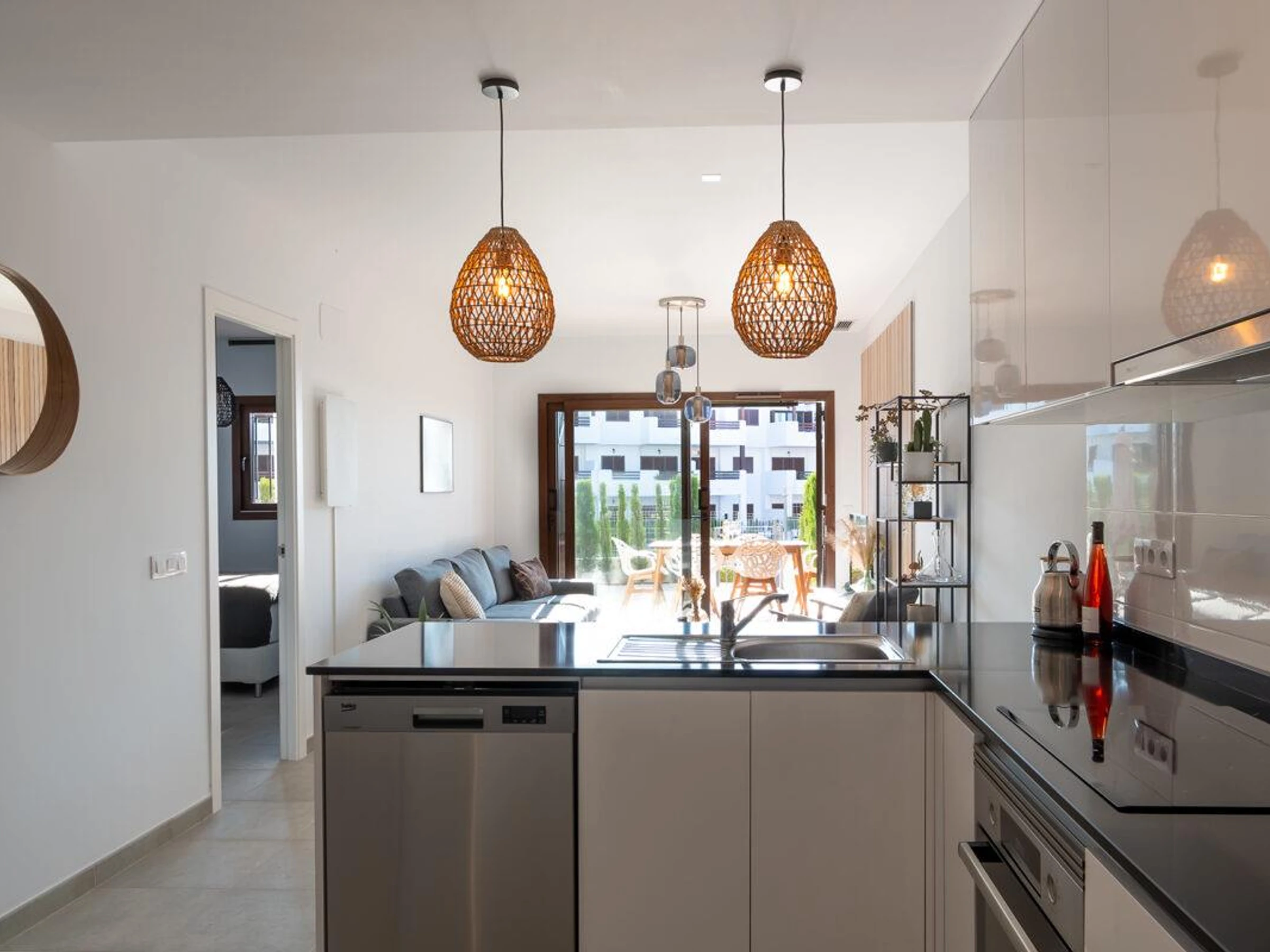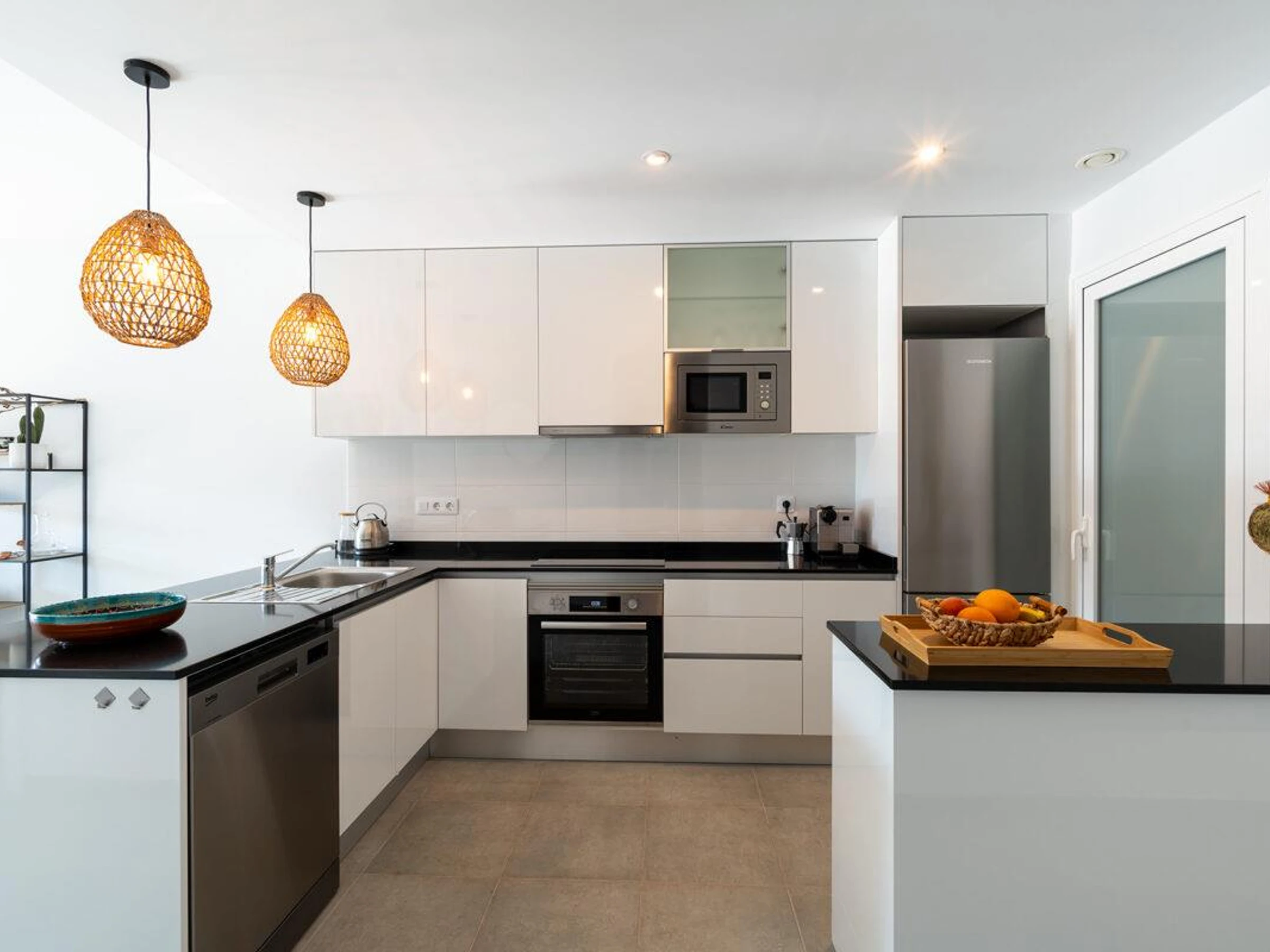 La cuisine, est équipée avec micro-ondes, four, congélateur, lave-vaisselle, cafetière et grille pain.
