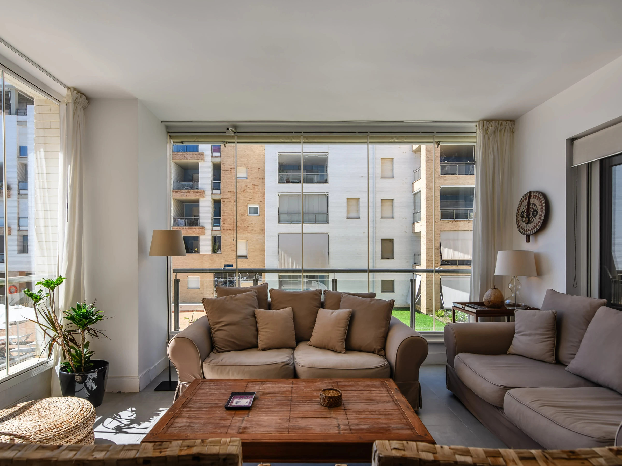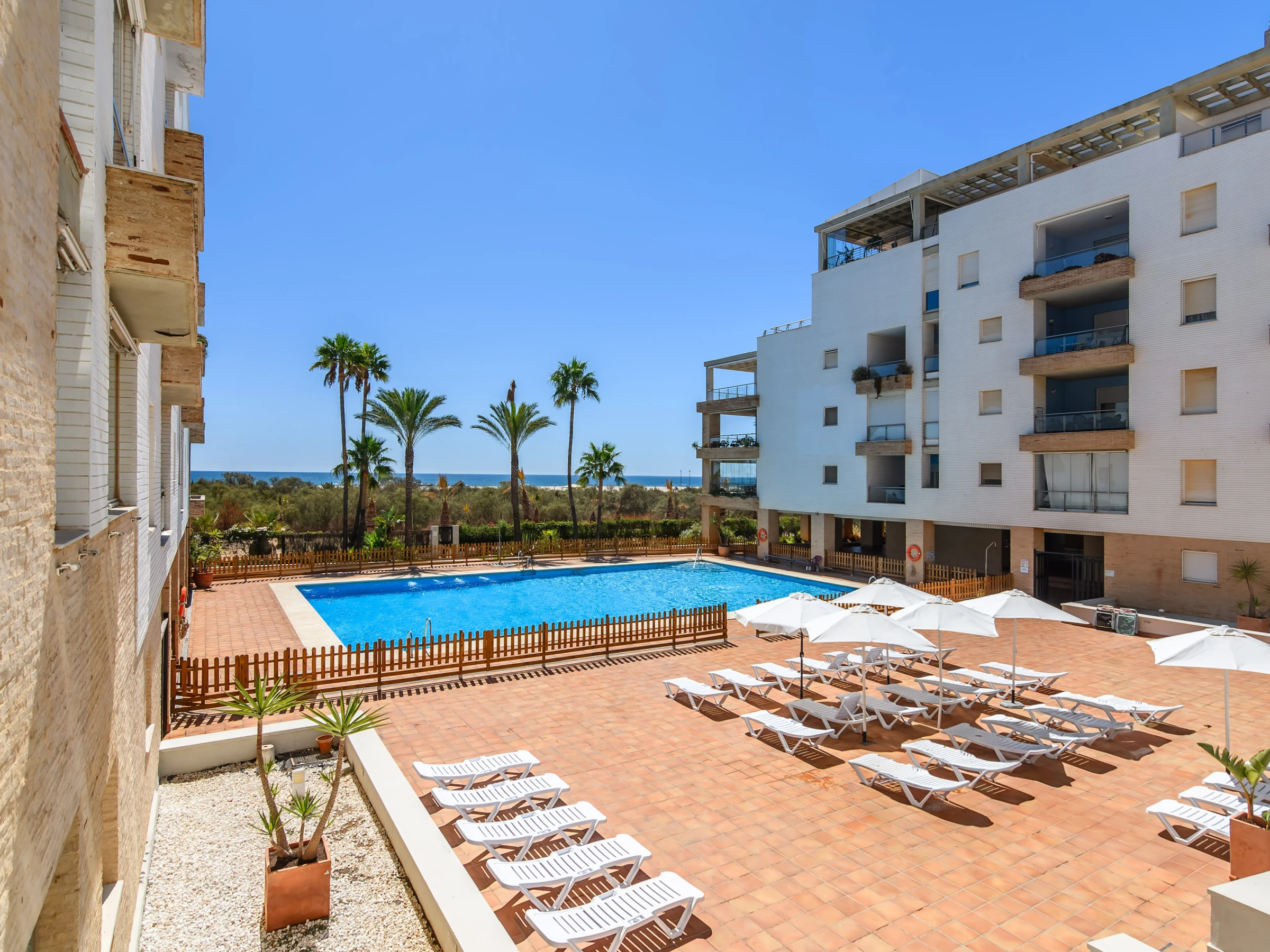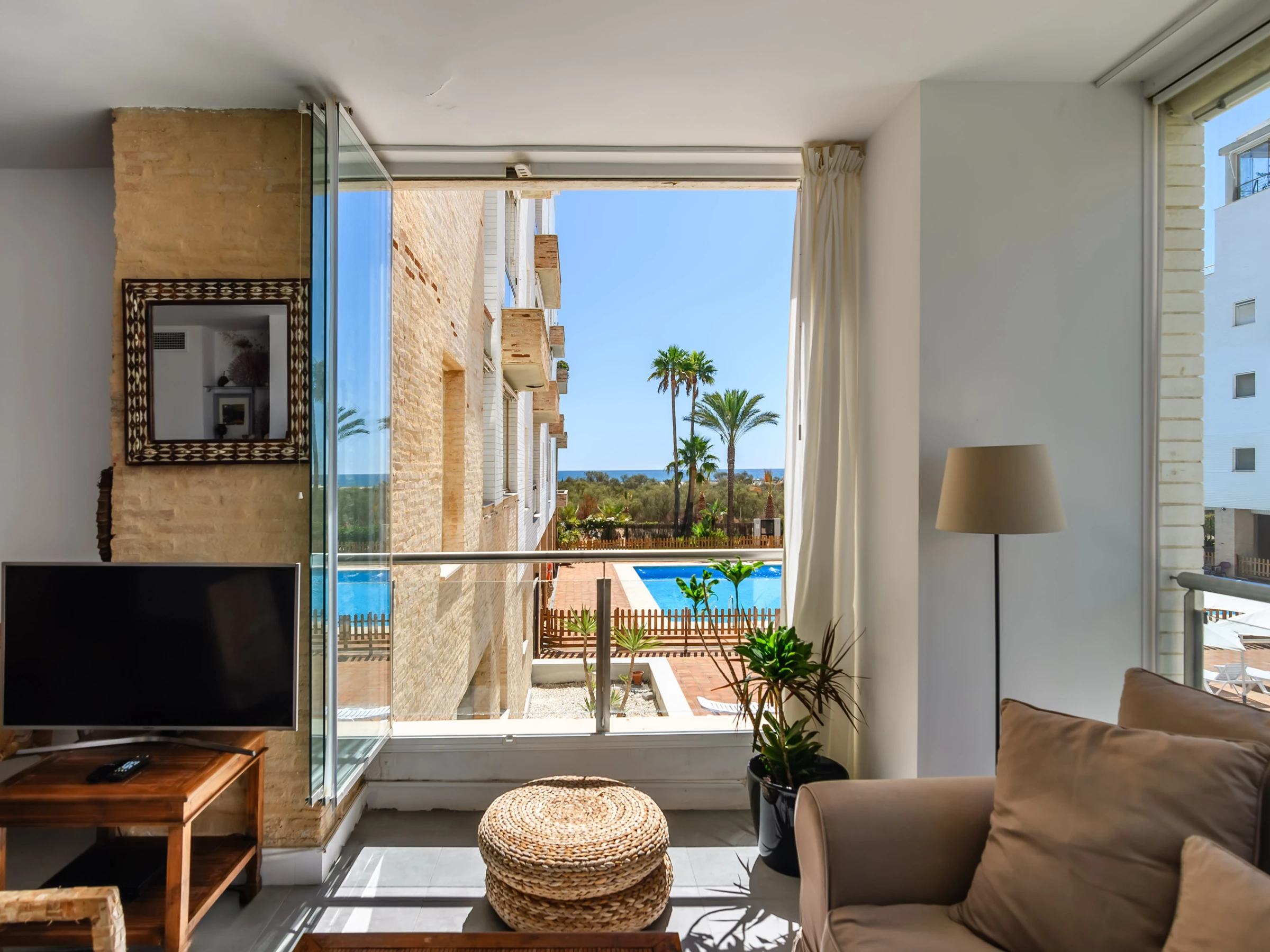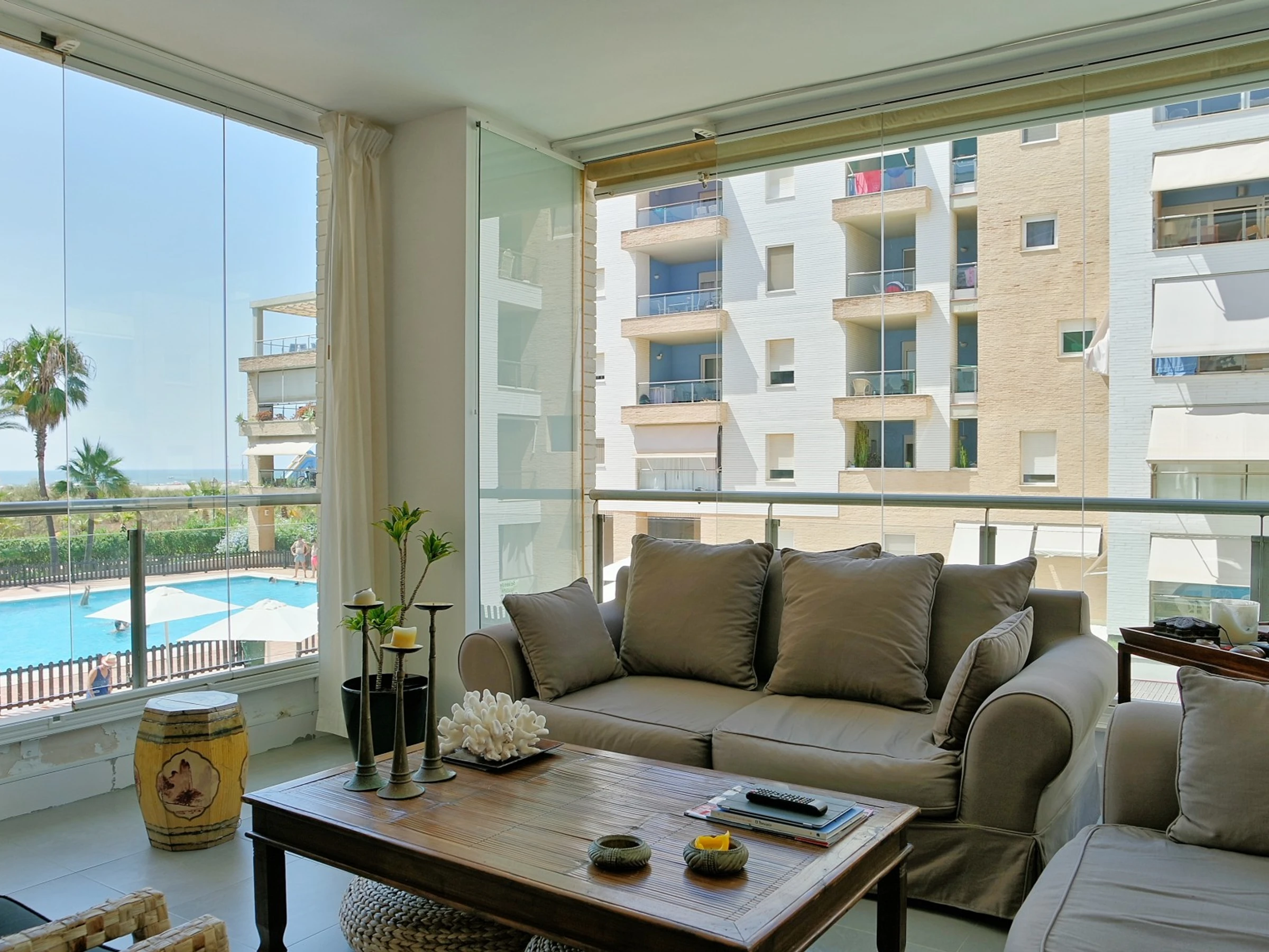 Logement de 80 m² meublé avec goût et vaste, situé en front de plage, avec vue sur la mer et la piscine.