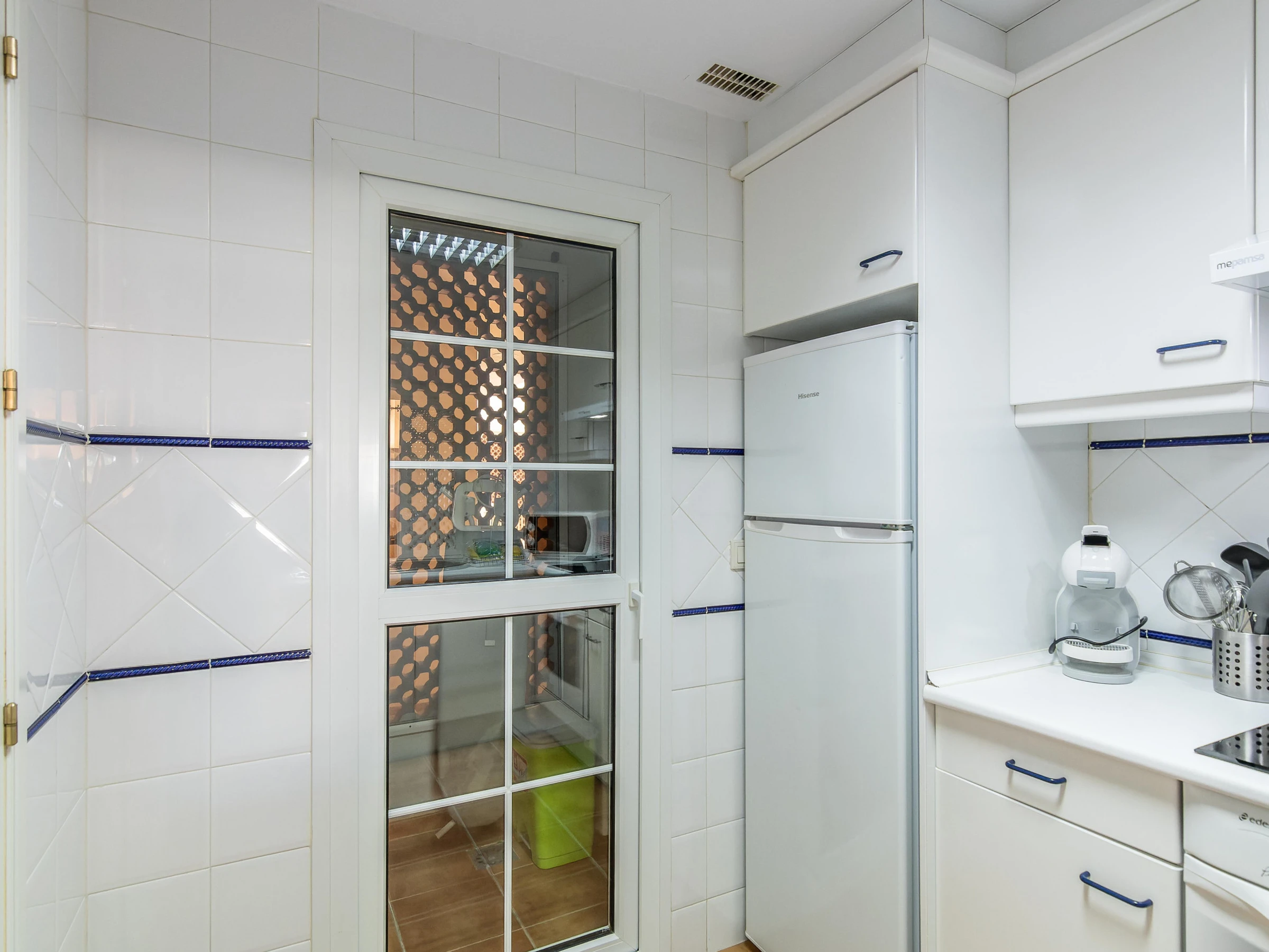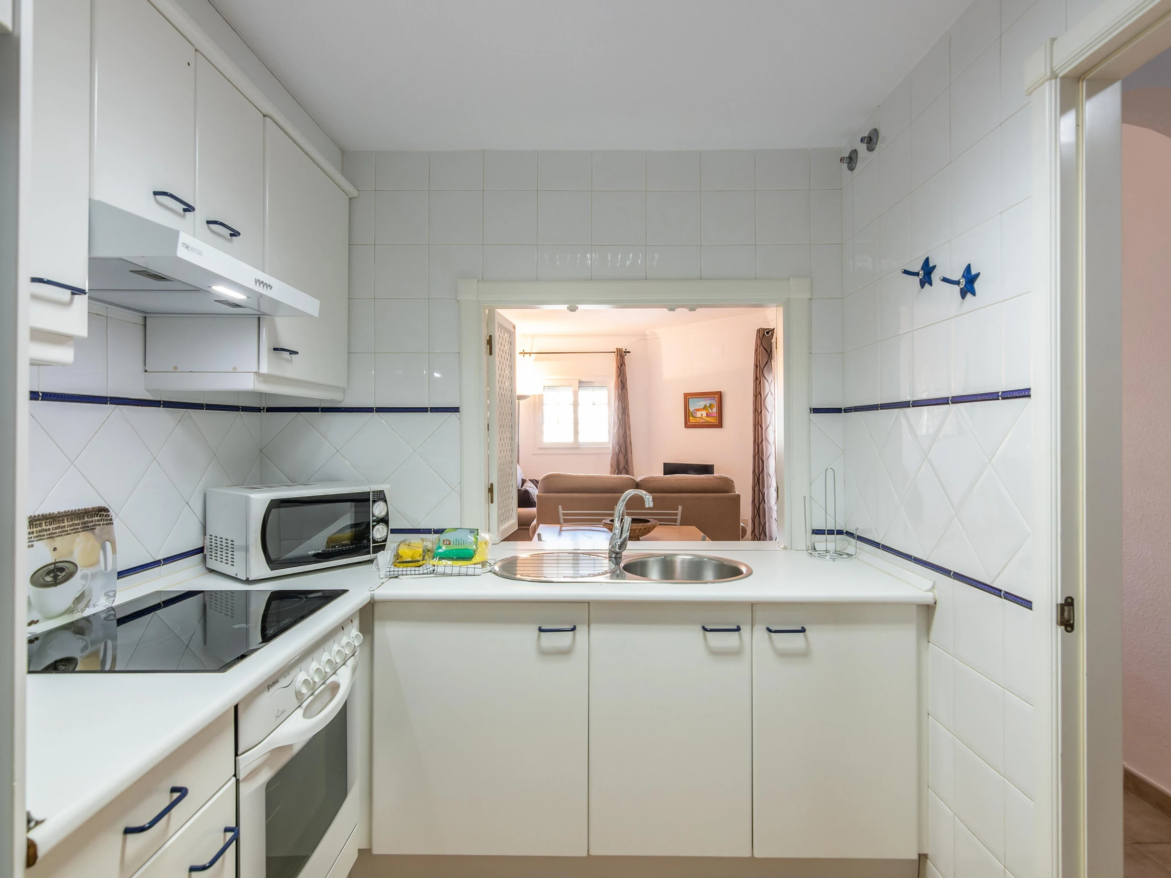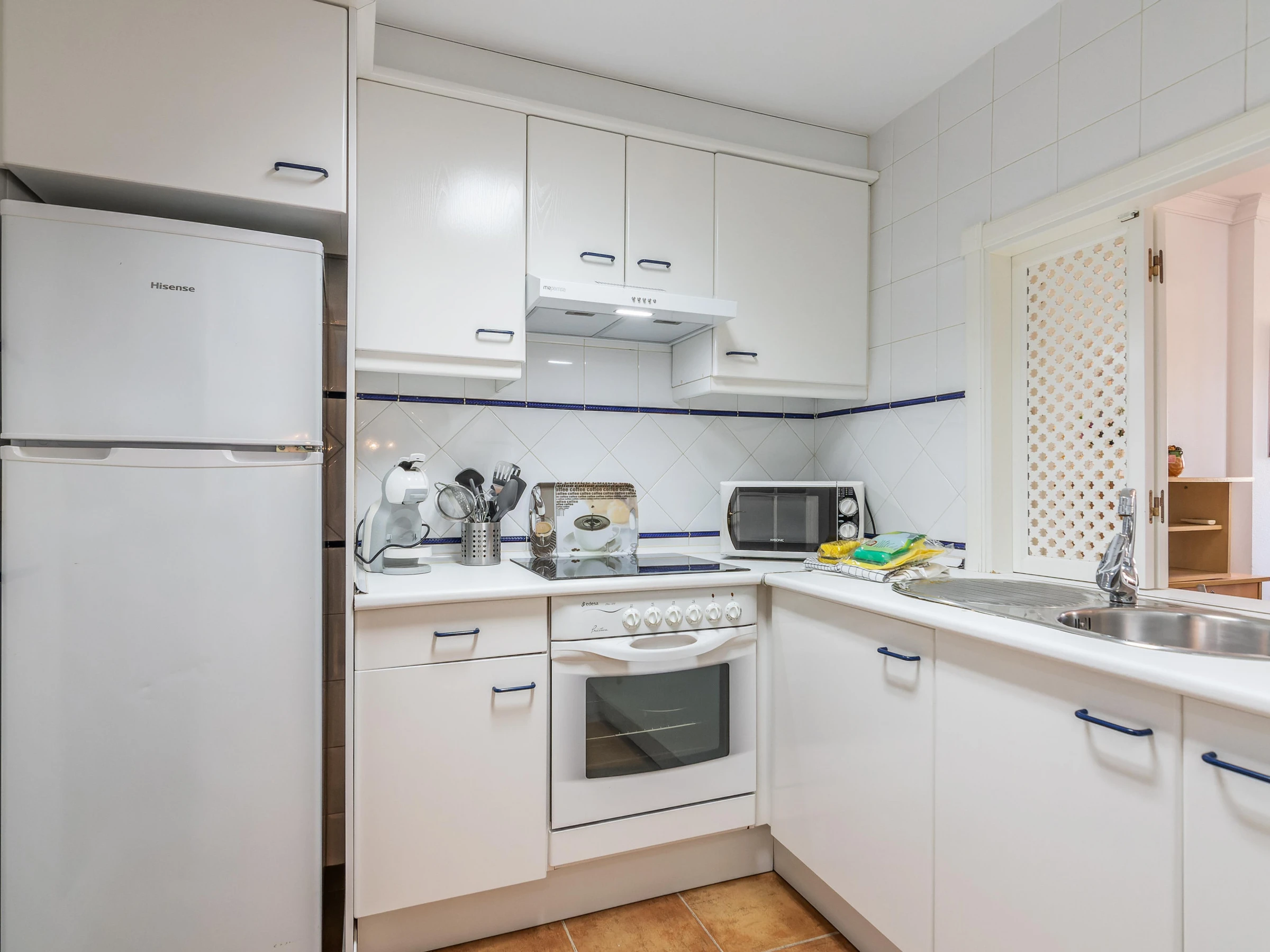 La cuisine indépendante, à vitrocéramique, est équipée avec réfrigérateur, micro-ondes, four, congélateur, vaisselle/couverts, ustensiles/cuisine, cafetière, grille pain et presse-agrumes.
