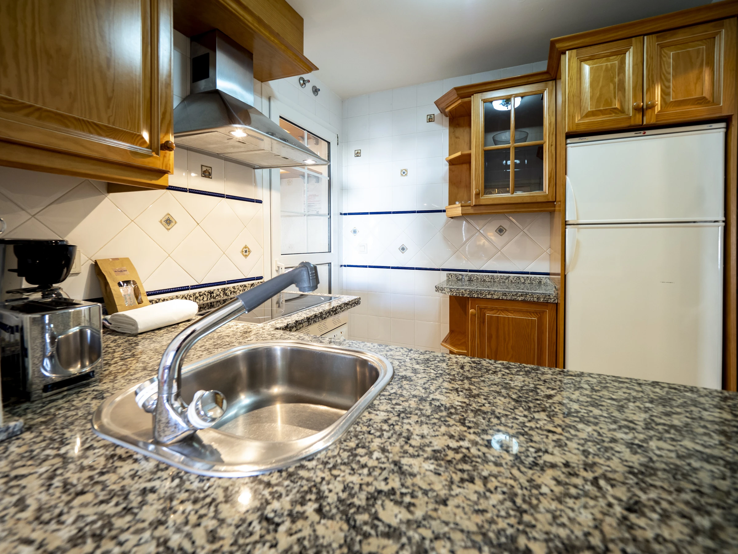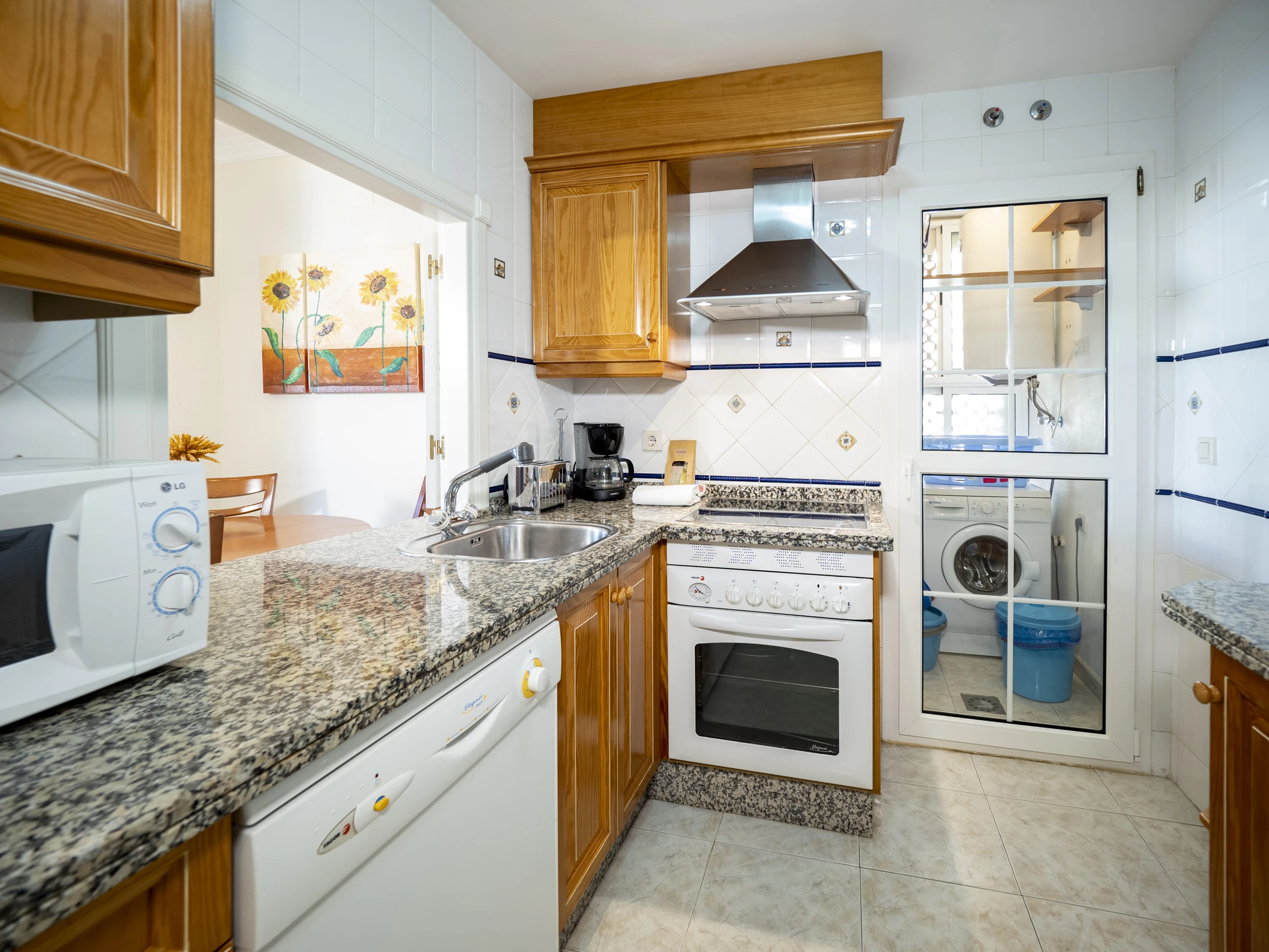 La cuisine indépendante, à vitrocéramique, est équipée avec réfrigérateur, micro-ondes, four, congélateur, lave-vaisselle, vaisselle/couverts, ustensiles/cuisine, cafetière, grille pain et presse-agrumes.