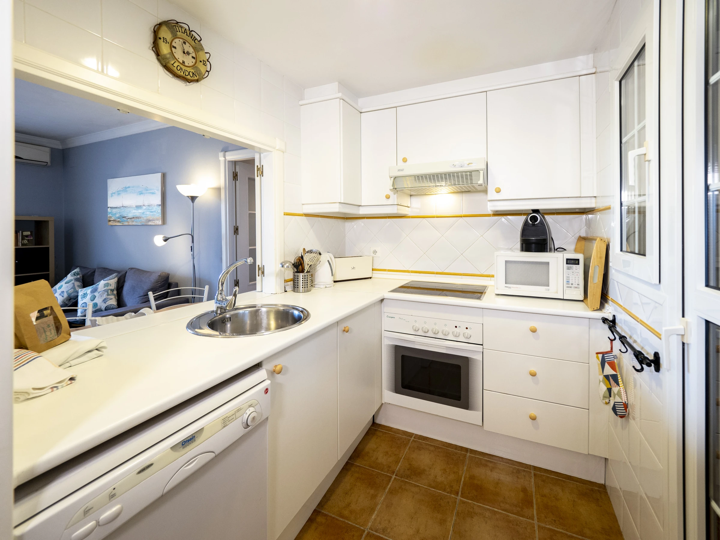 La cuisine indépendante, à vitrocéramique, est équipée avec réfrigérateur, micro-ondes, four, congélateur, lave-vaisselle, vaisselle/couverts, ustensiles/cuisine, cafetière, grille pain et presse-agrumes.