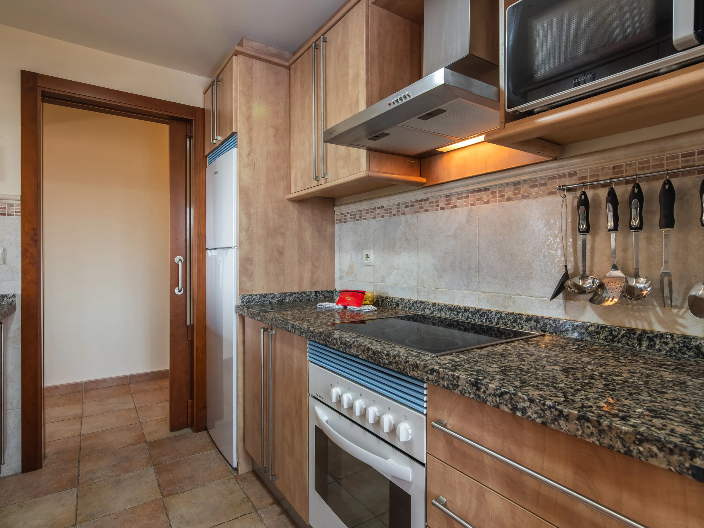La cuisine indépendante, à vitrocéramique, est équipée avec réfrigérateur, micro-ondes, four, congélateur, lave-vaisselle, vaisselle/couverts, ustensiles/cuisine, cafetière, grille pain, bouilloire et presse-agrumes.