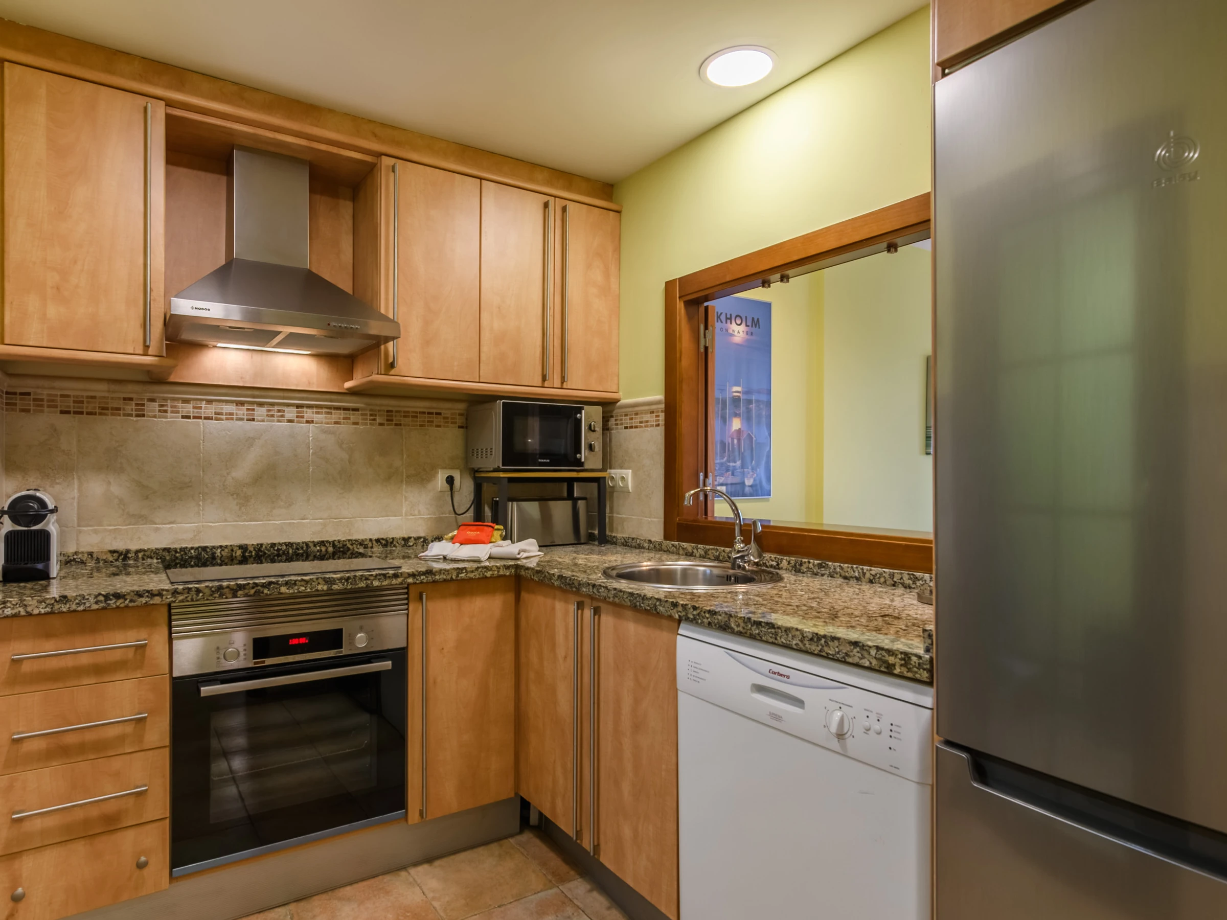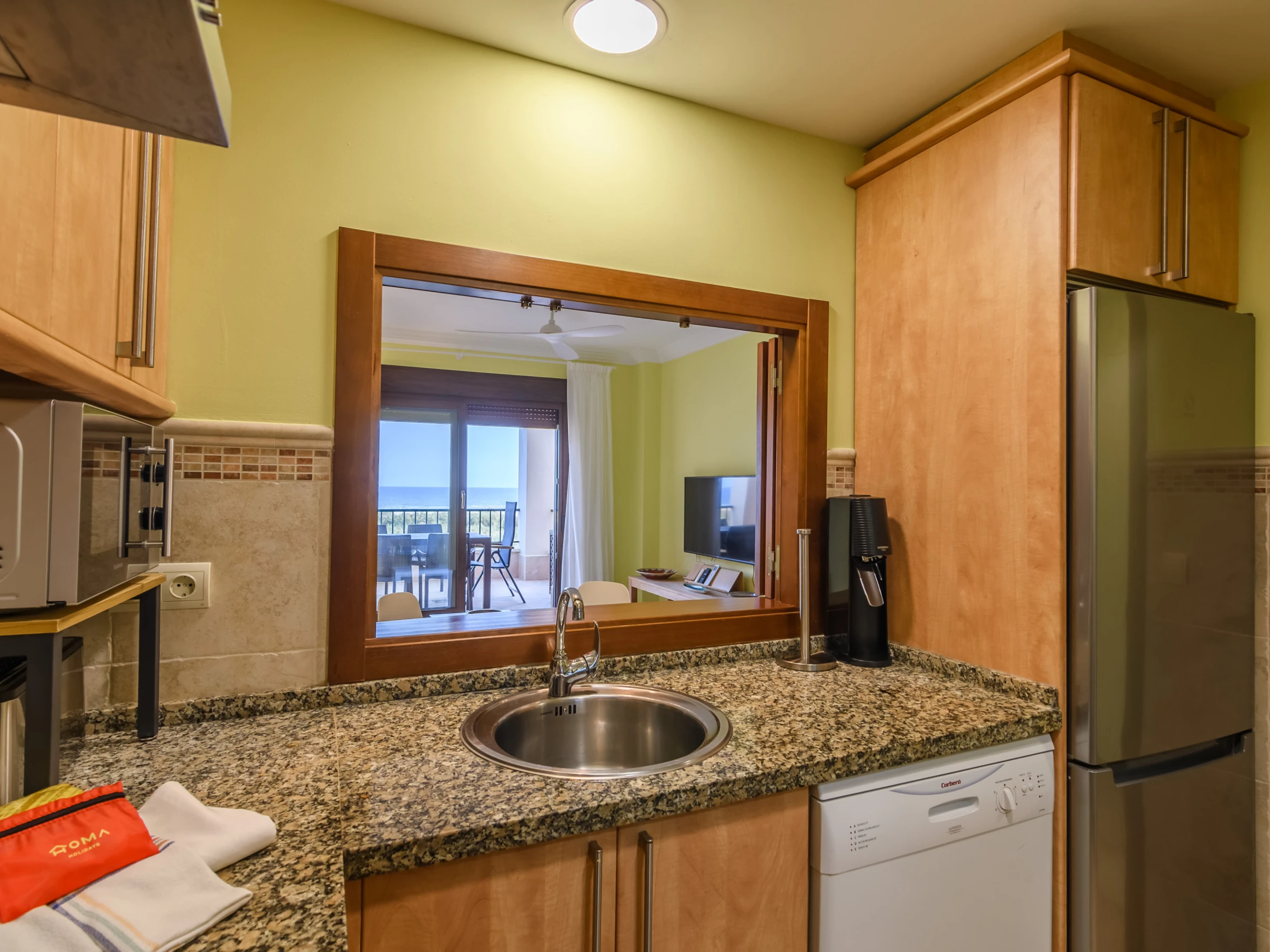 La cuisine américaine, à induction, est équipée avec réfrigérateur, micro-ondes, four, congélateur, lave-vaisselle, vaisselle/couverts, ustensiles/cuisine, cafetière, grille pain, bouilloire et presse-agrumes.