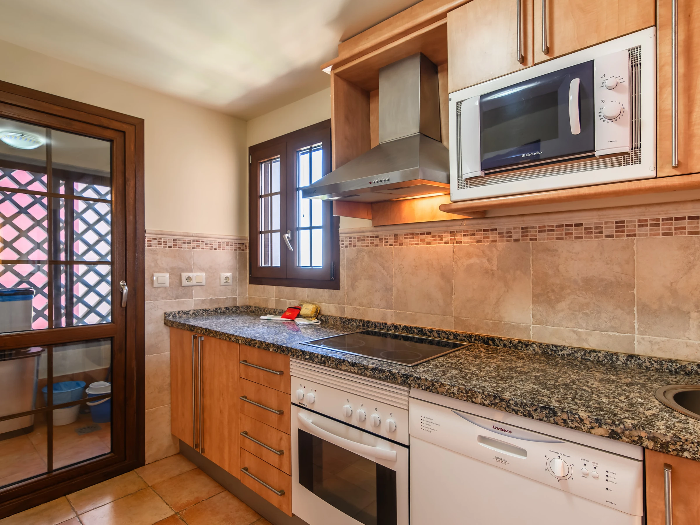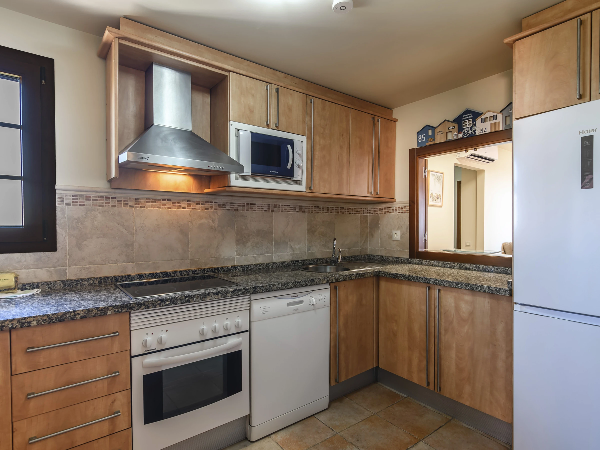 La cuisine indépendante, à vitrocéramique, est équipée avec réfrigérateur, micro-ondes, four, congélateur, lave-vaisselle, vaisselle/couverts, ustensiles/cuisine, cafetière, grille pain et presse-agrumes.