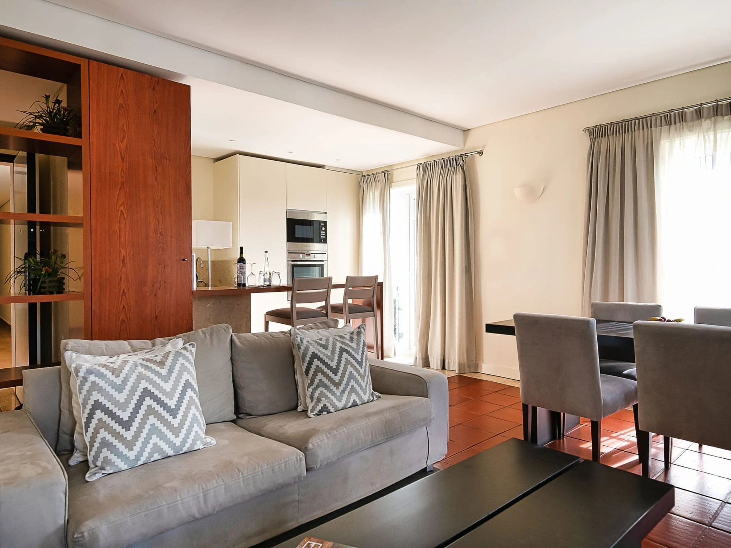 La cuisine, est équipée avec réfrigérateur, micro-ondes, four, congélateur, lave-vaisselle, cafetière, grille pain et bouilloire.