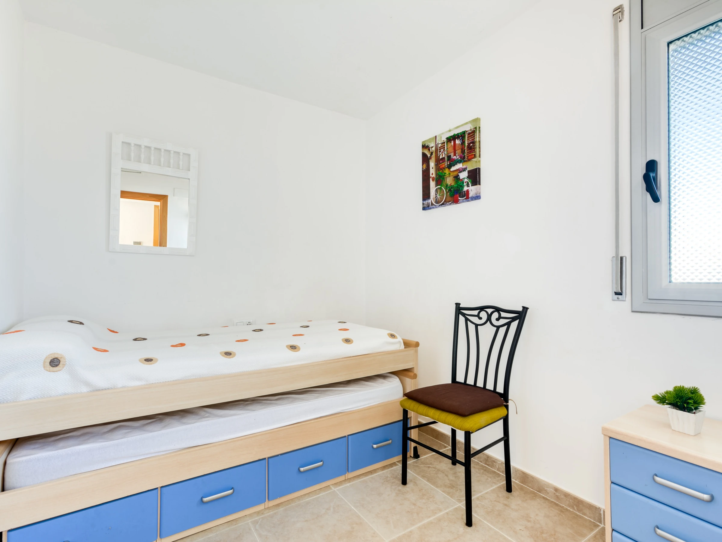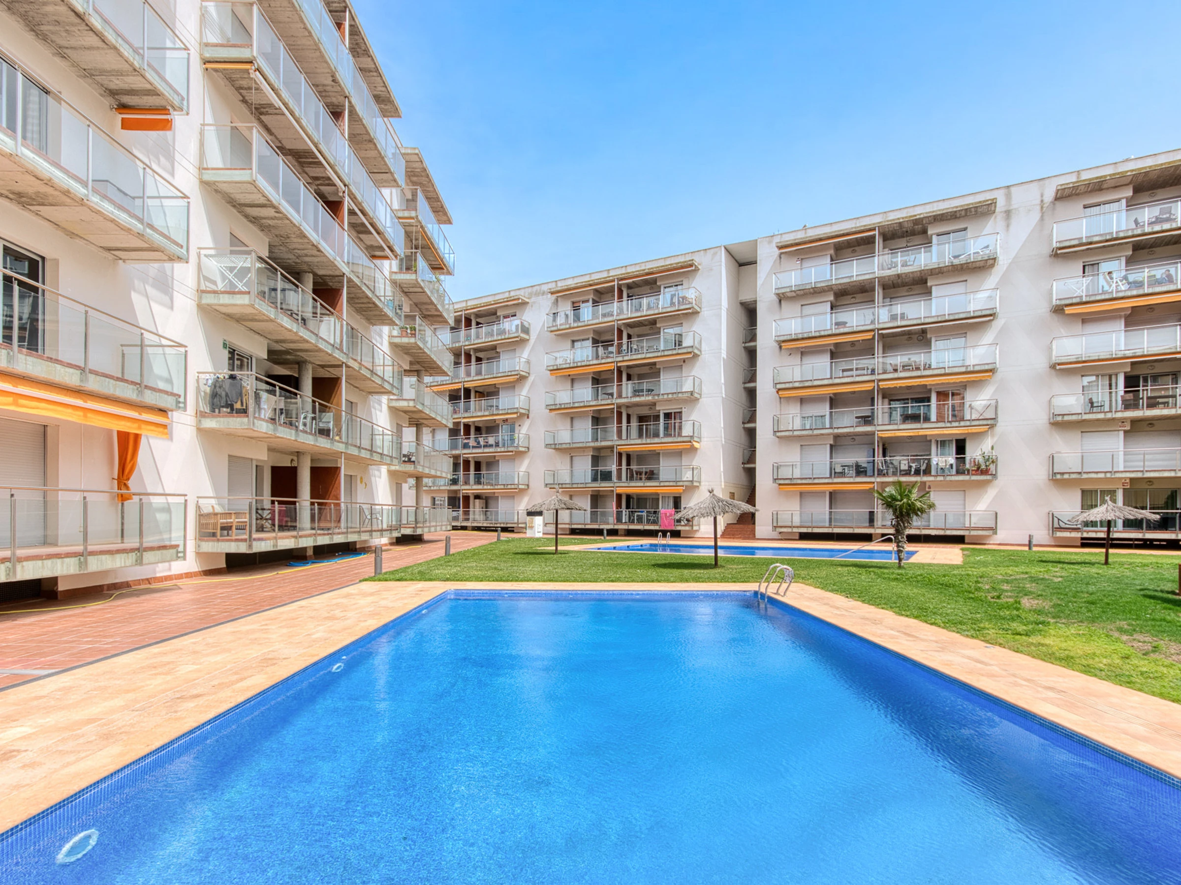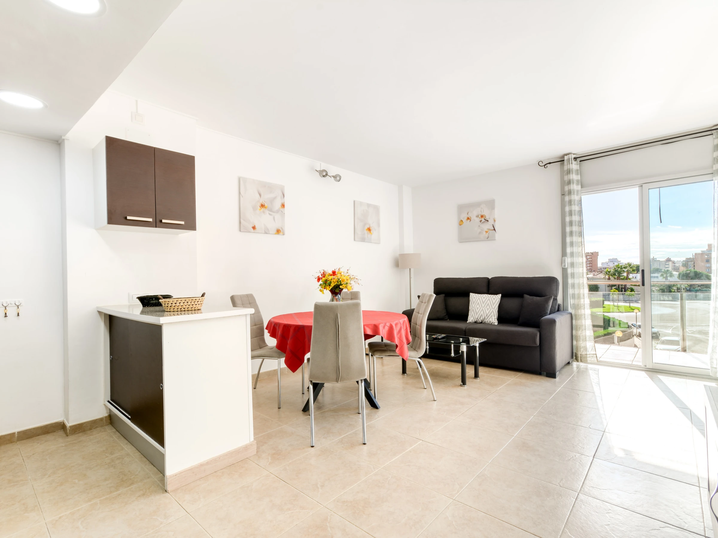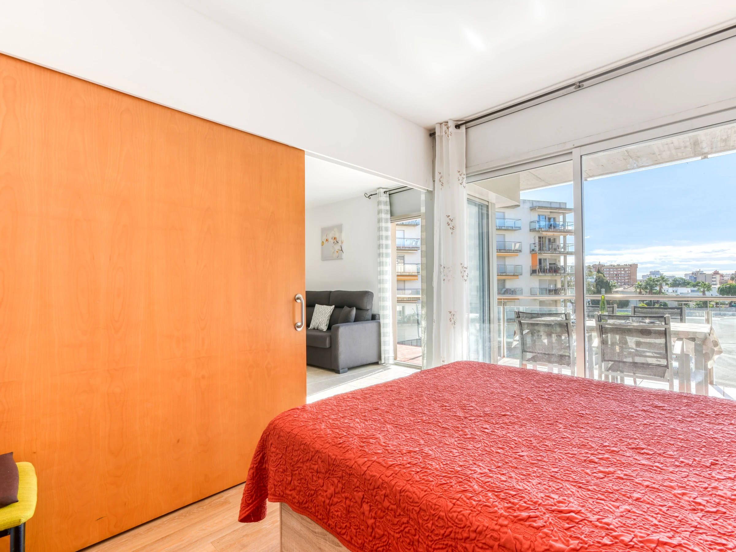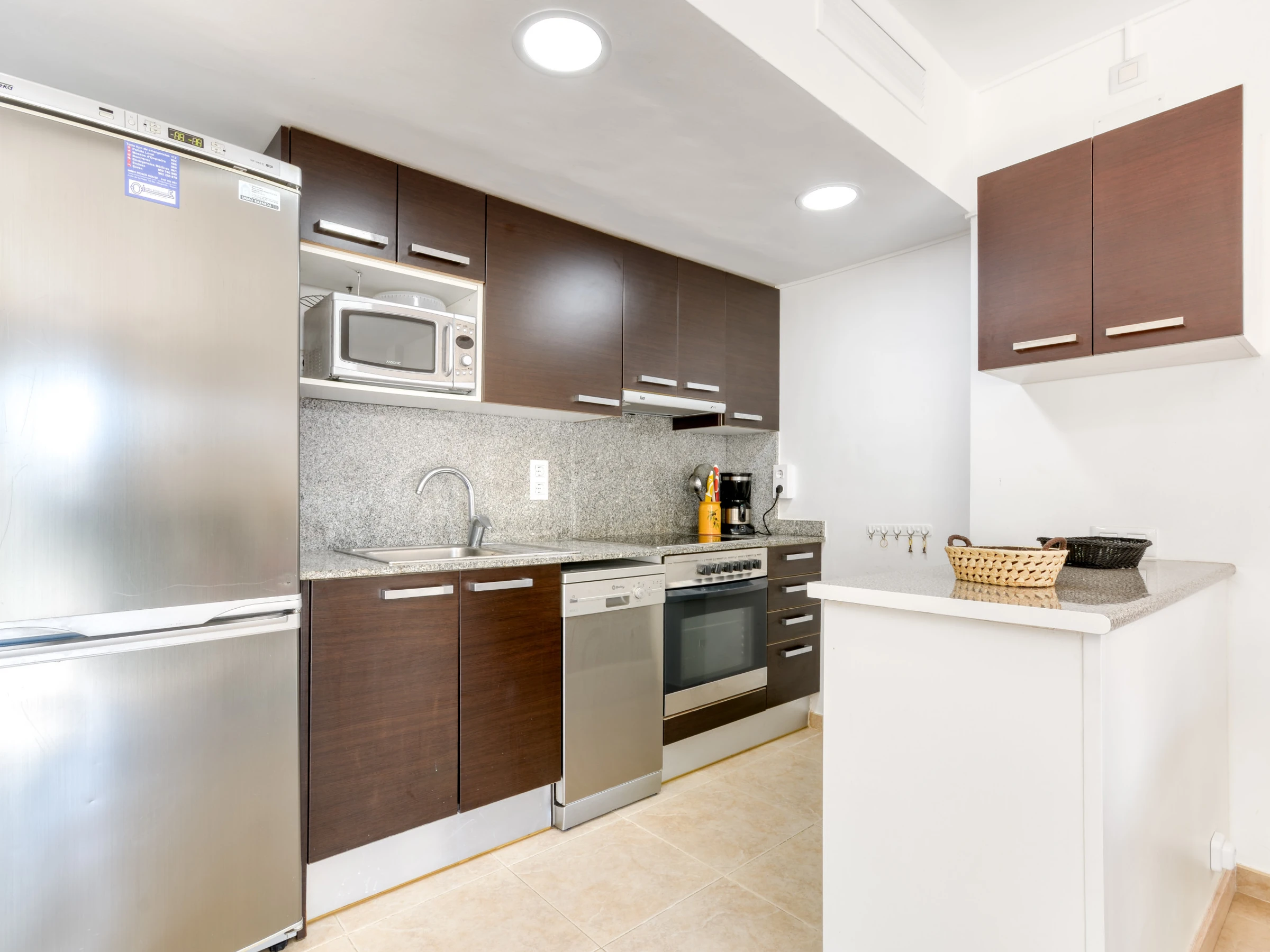 Ce confortable appartement de deux chambres récemment construit est adapté pour 4 personnes et a une superficie de 53 m². Les chambres sont agréables et confortables. L'une est équipée d'un lit double, tandis que la seconde est équipée pour deux lits de 0.90. Le salon-salle à manger moderne et confortable comprend un canapé, du mobilier de salon, une télévision satélite et une table à manger avec des chaises. La cuisine ouverte est équipée de plaques vitrocéramique, réfrigérateur, micro-ondes, four, lave-linge, lave-vaisselle, vaisselle, couverts, ustensiles de cuisine, cafetière. Il y a une salle de bain avec douche. De plus, le logement est équipé des installations suivantes: ascenseur, salon de jardin, terrasse, fer à repasser, pompe à chaleur, climatisation, piscine commune, parking couvert dans le même bâtiment.