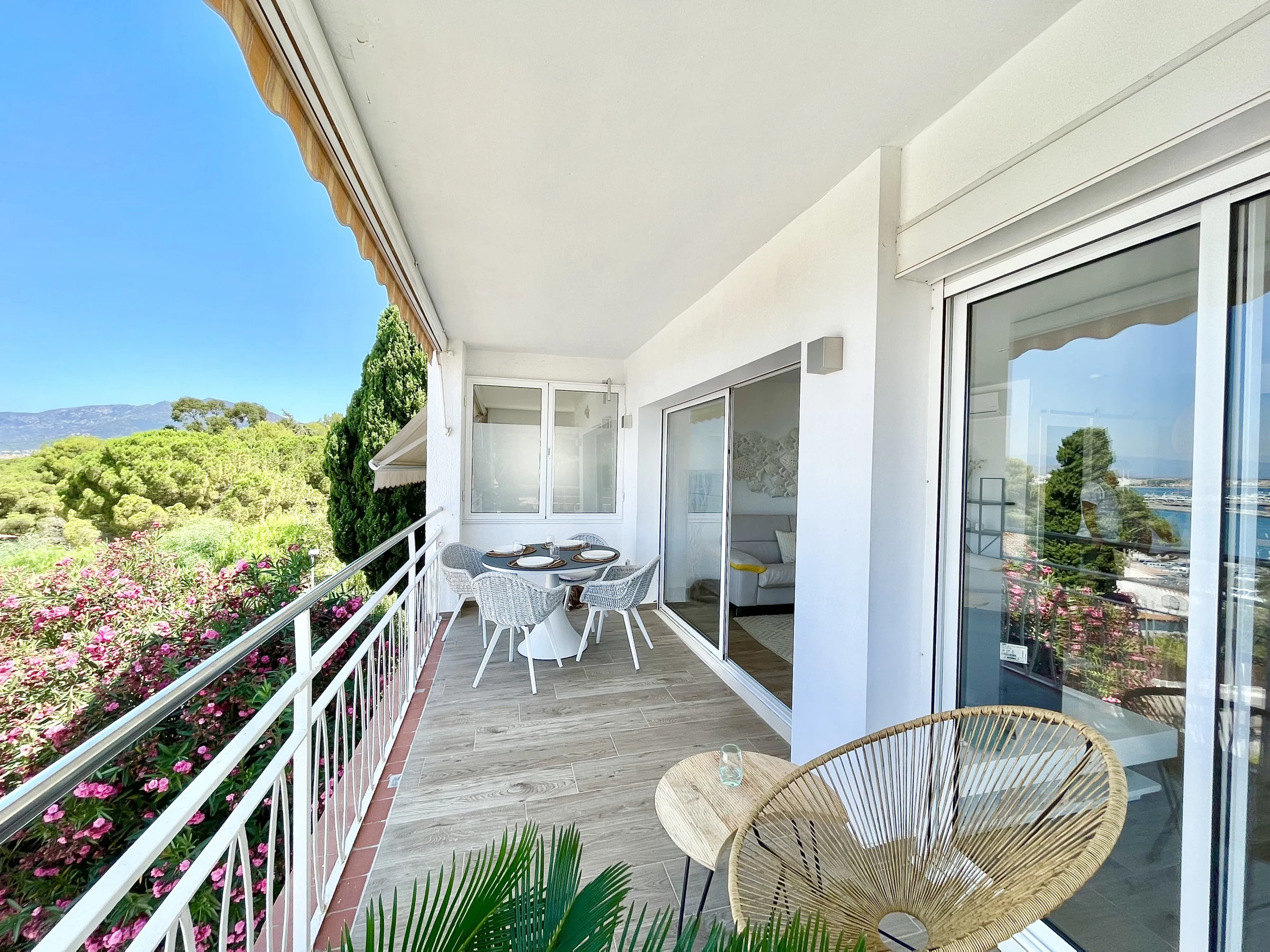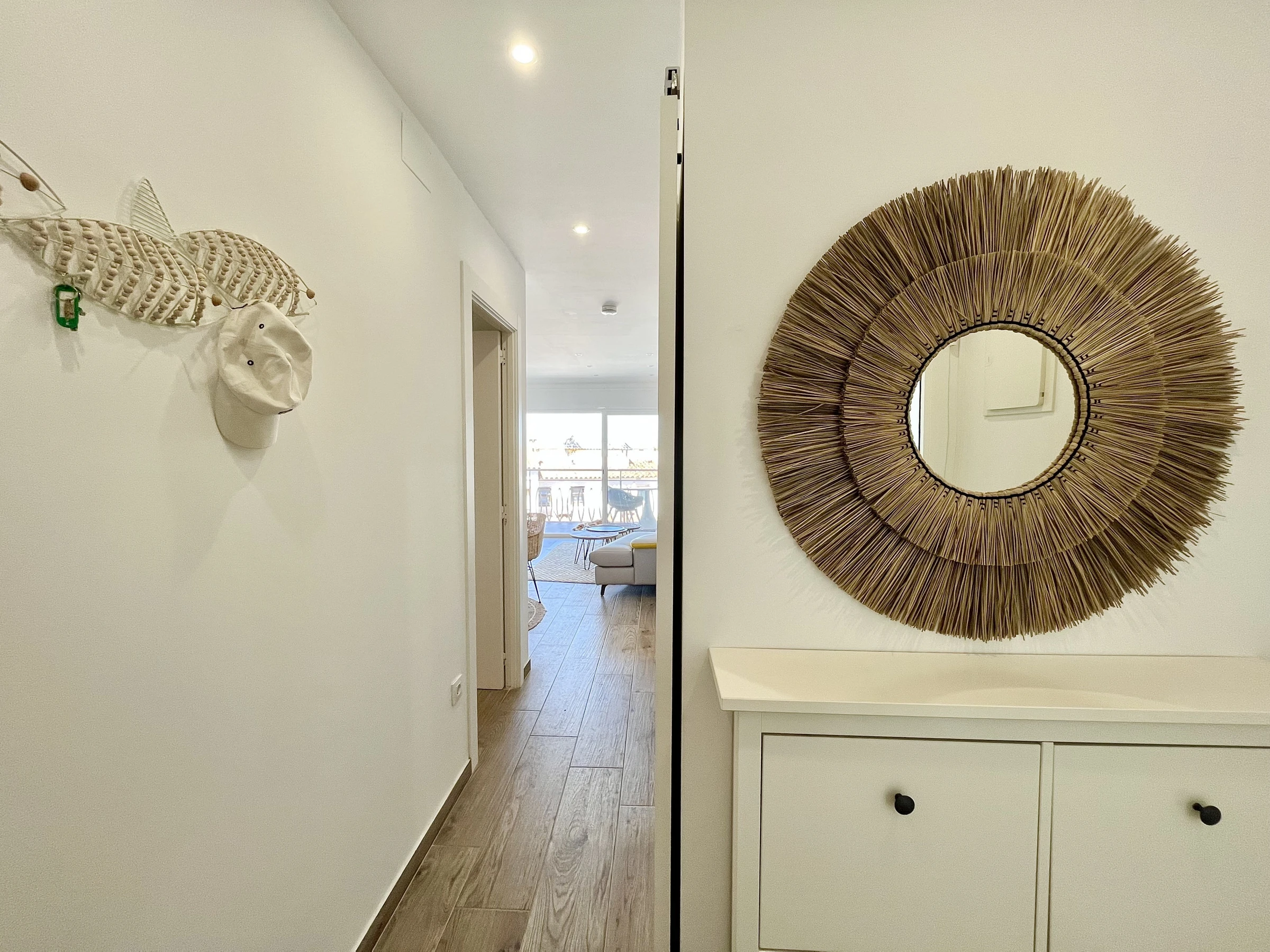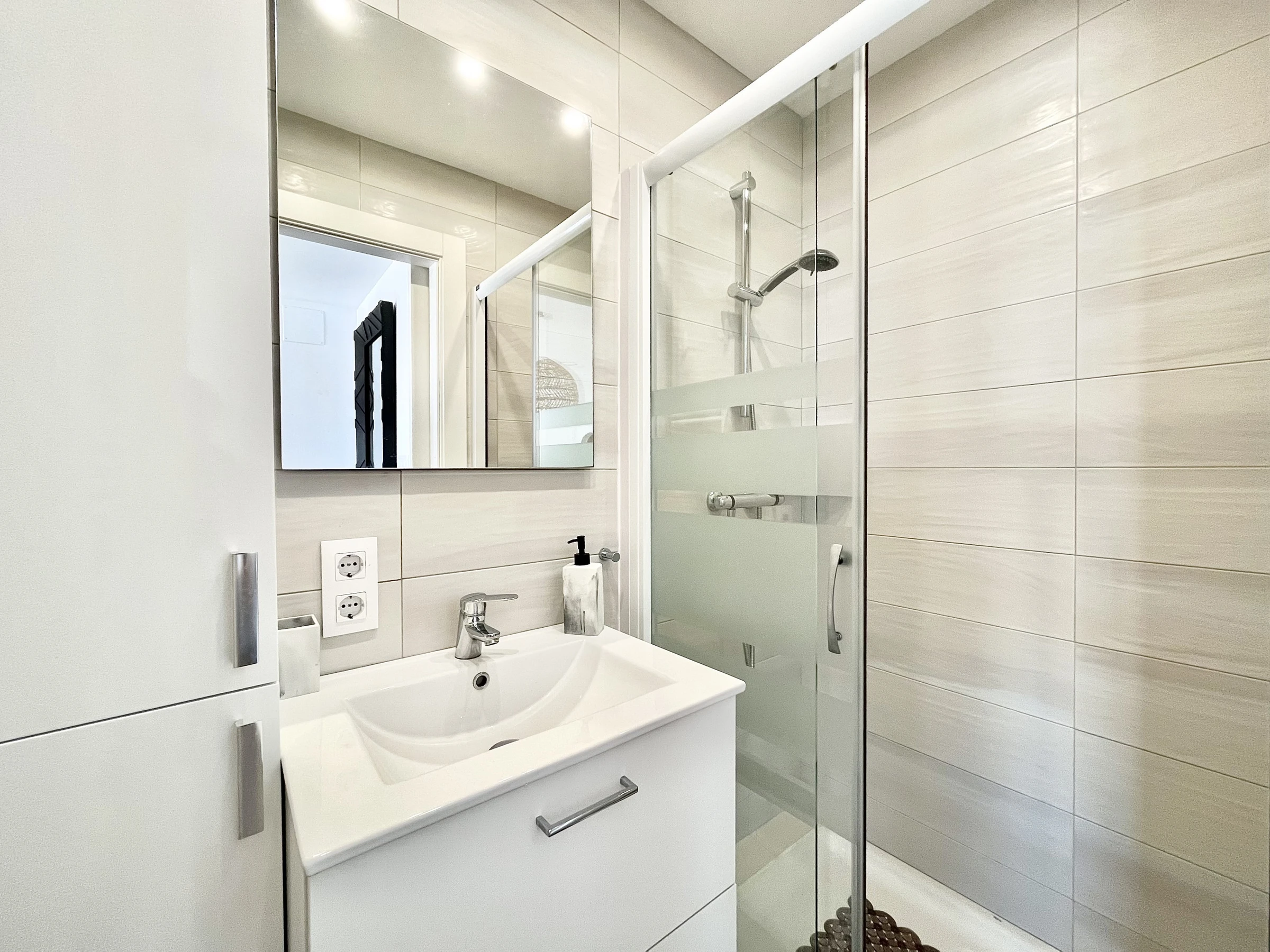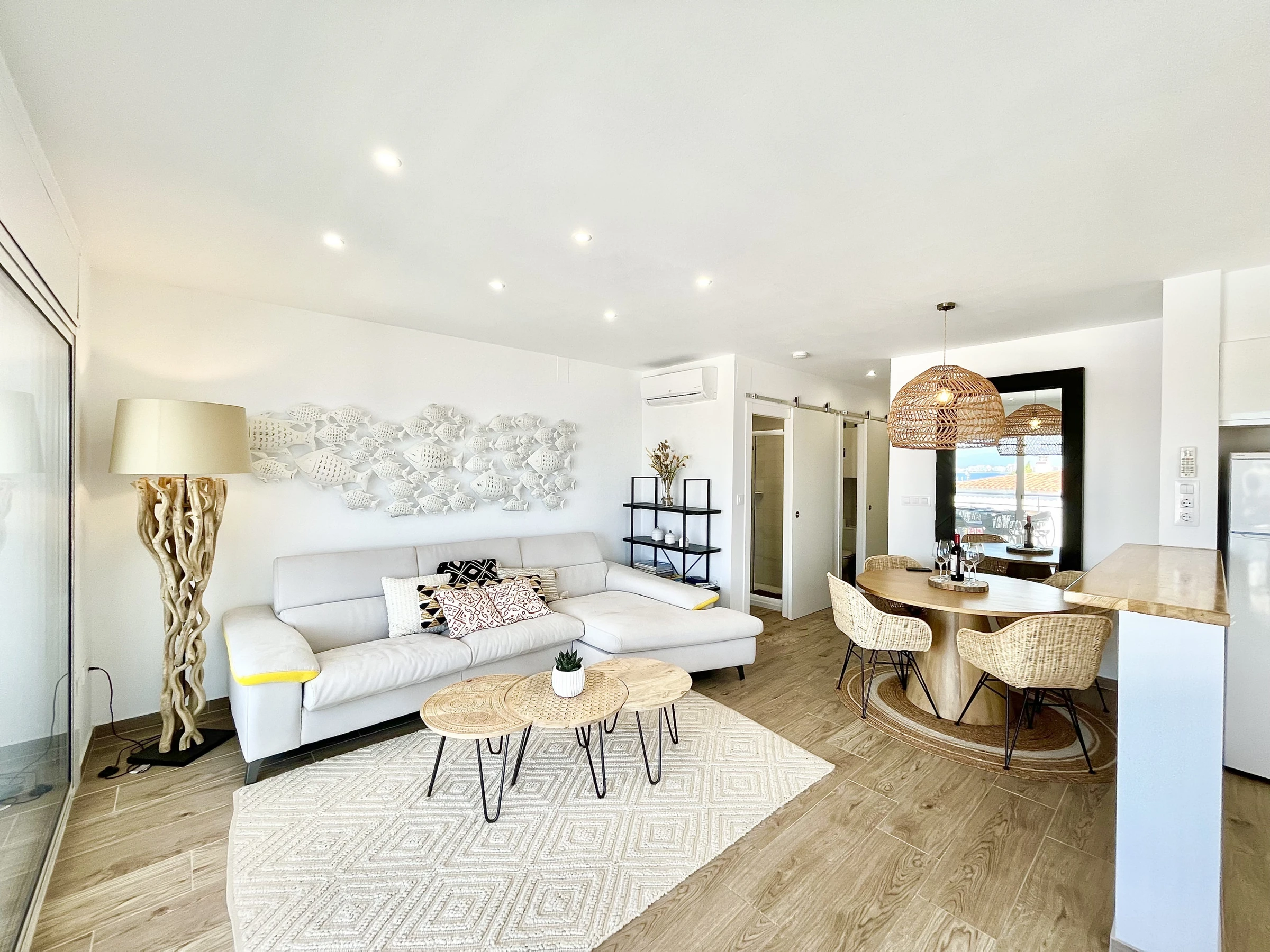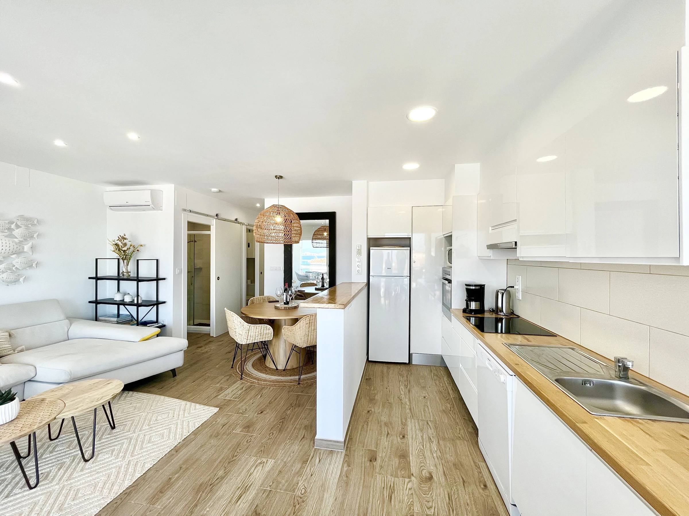 Le logement de 56 m² est décoré dans un style moderne et élégant, avec vue sur la mer et une grande terrasse de 21 m². Il dispose de la climatisation, d'un accès internet (wifi) et d'un parking extérieur dans le même bâtiment pour plus de confort. La cuisine américaine est équipée d'une plaque à induction, réfrigérateur, micro-onde, four, congélateur, lave-linge, cafetière, grille-pain et ustensiles de cuisine.