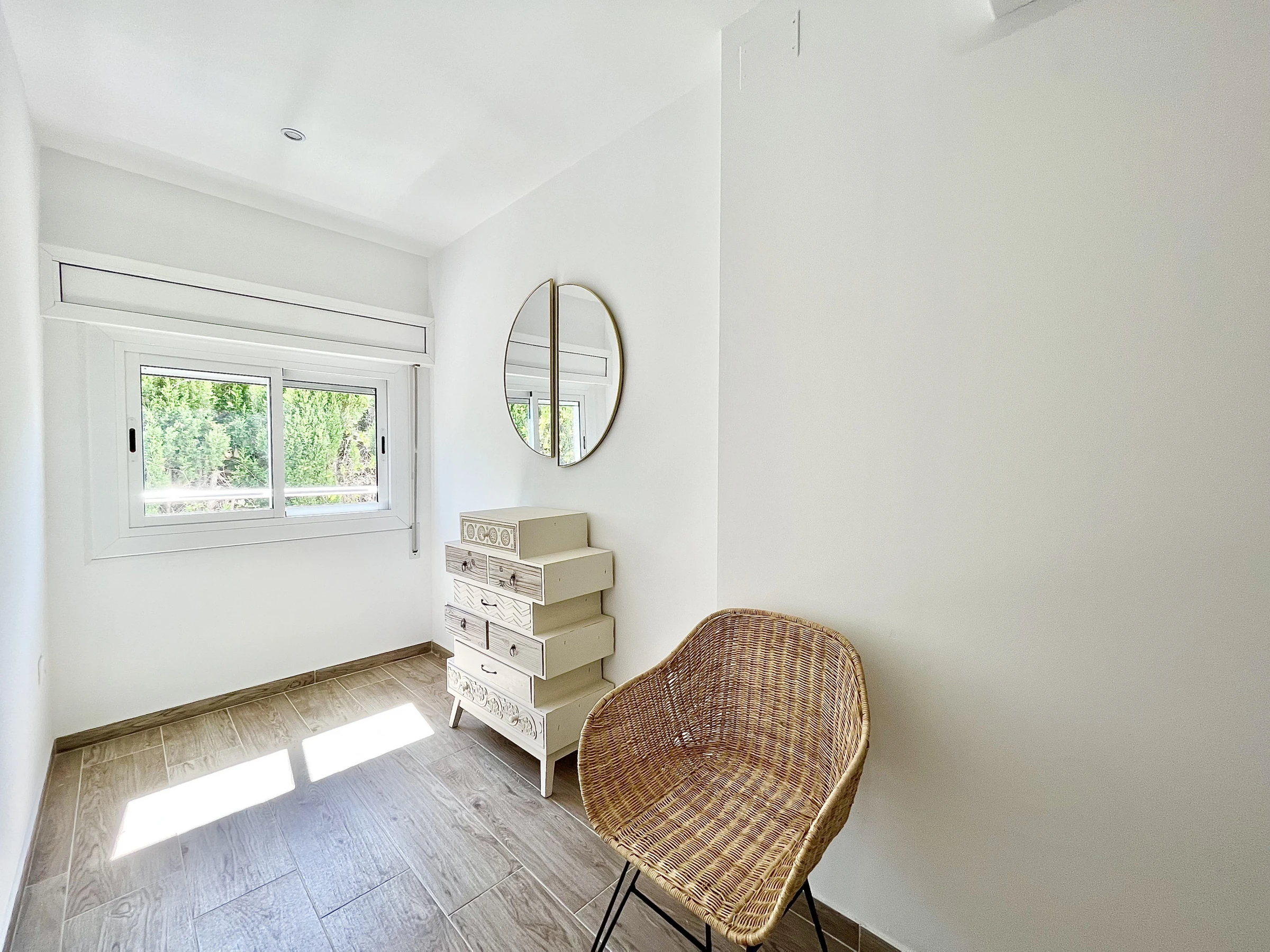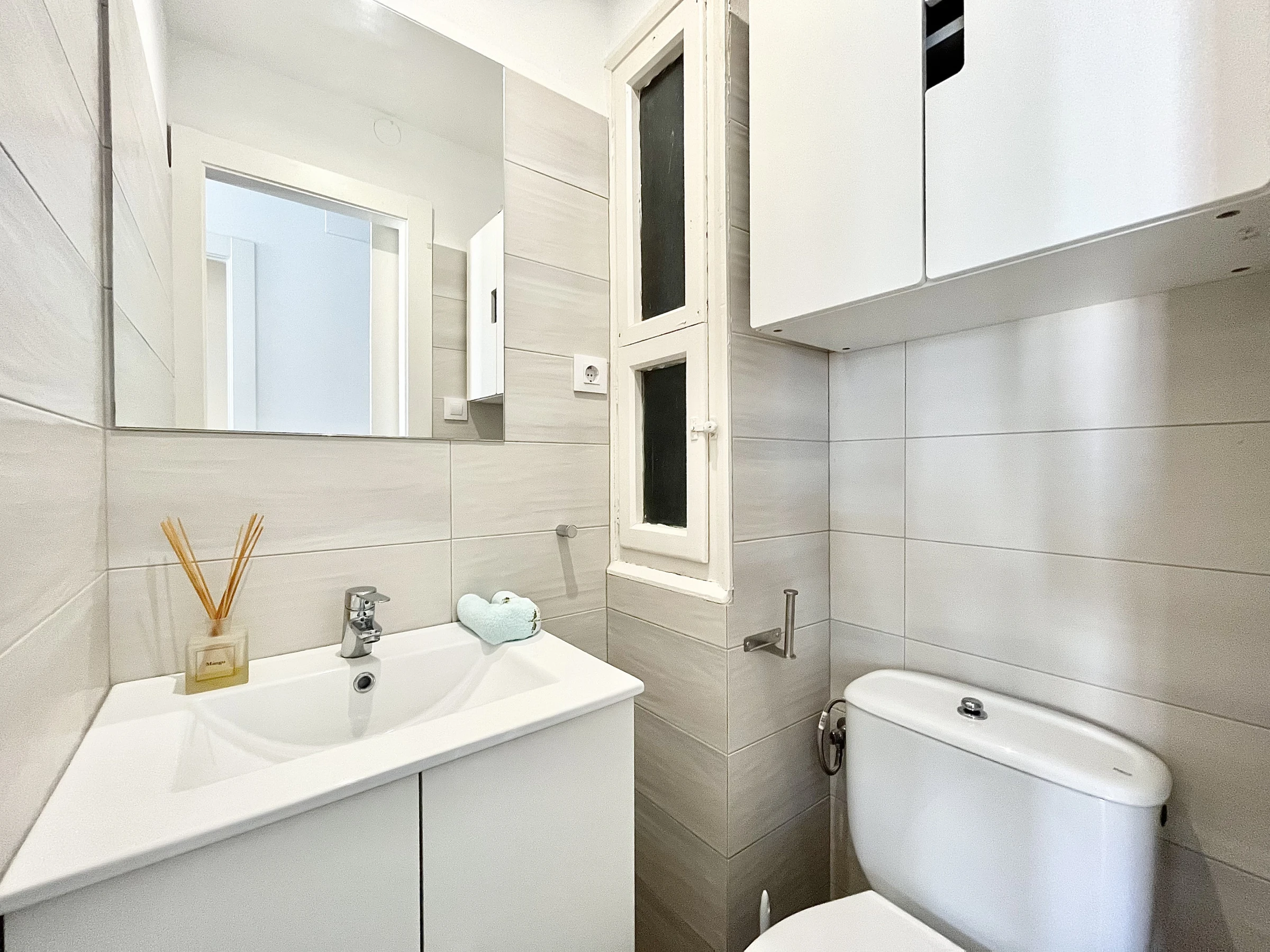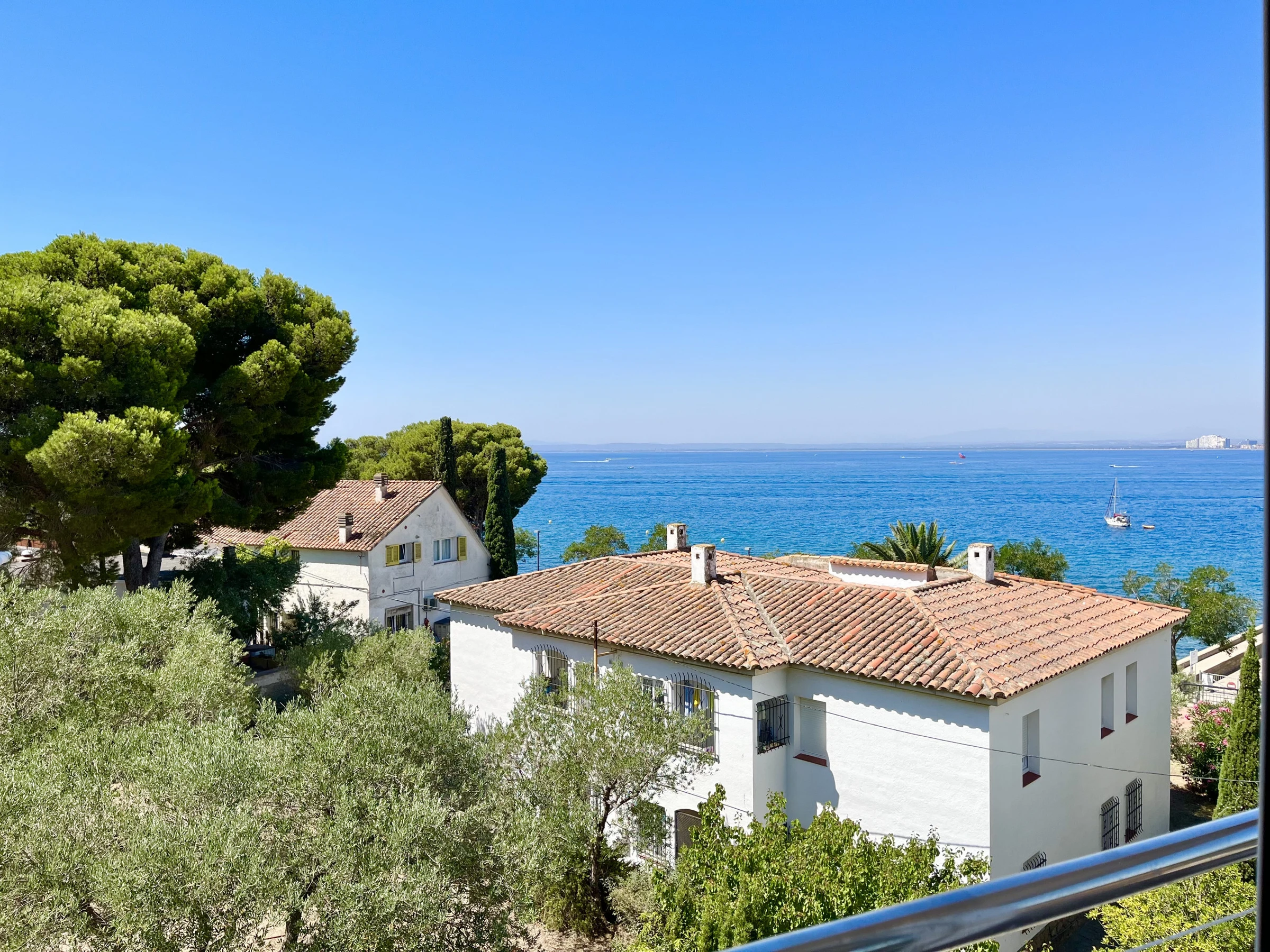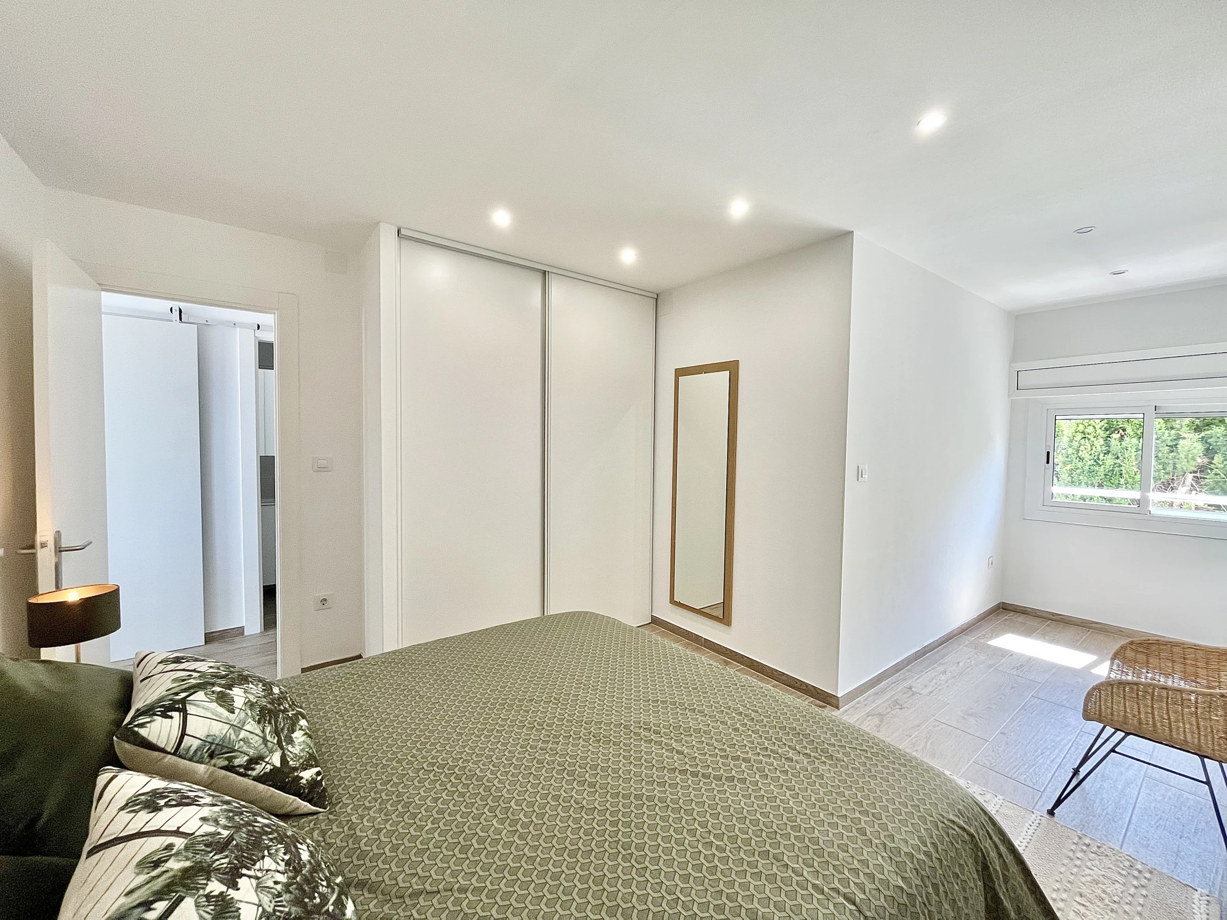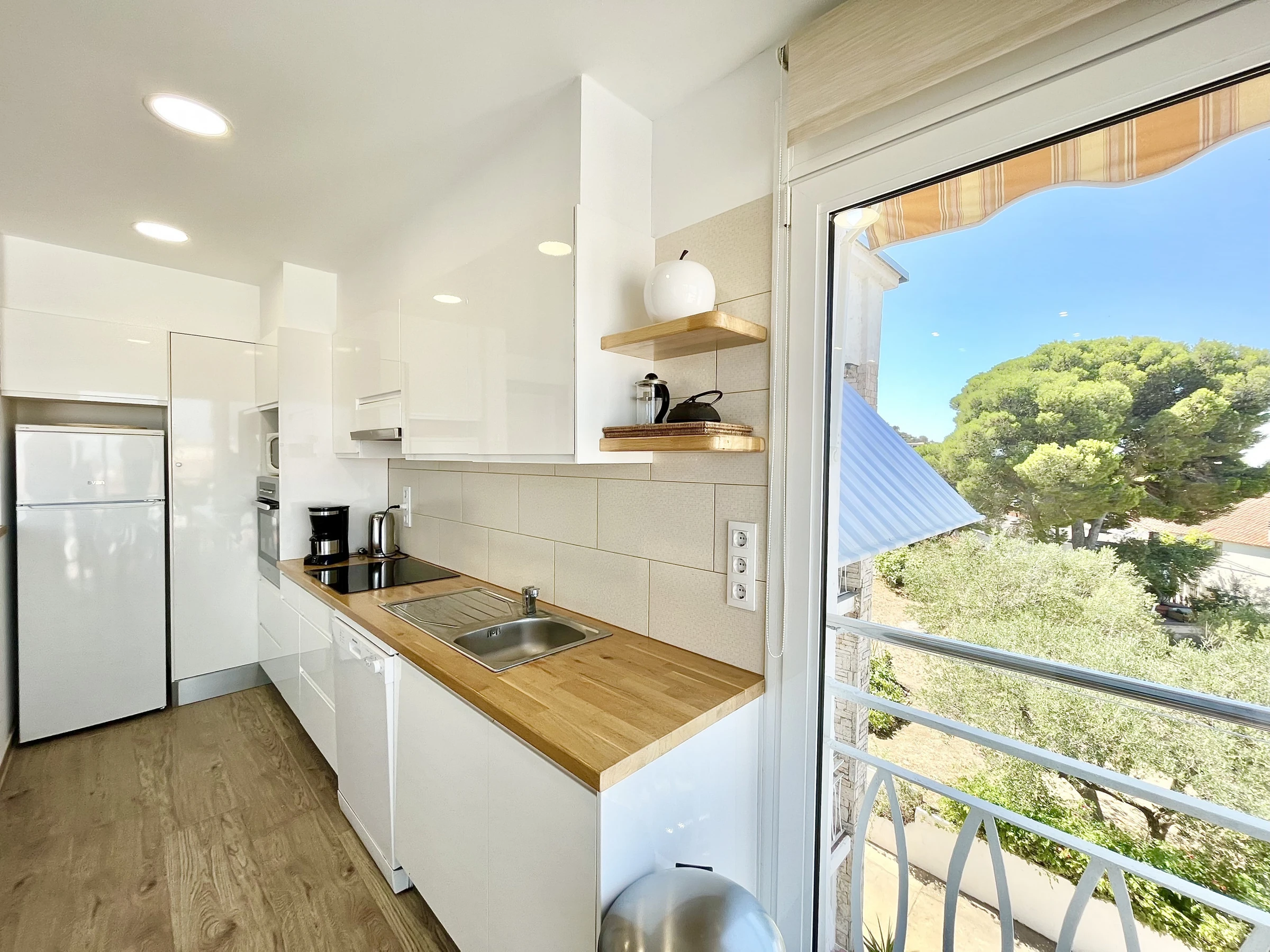 Le logement de 56 m² est décoré dans un style moderne et élégant, avec vue sur la mer et une grande terrasse de 21 m². Il dispose de la climatisation, d'un accès internet (wifi) et d'un parking extérieur dans le même bâtiment pour plus de confort. La cuisine américaine est équipée d'une plaque à induction, réfrigérateur, micro-onde, four, congélateur, lave-linge, cafetière, grille-pain et ustensiles de cuisine.