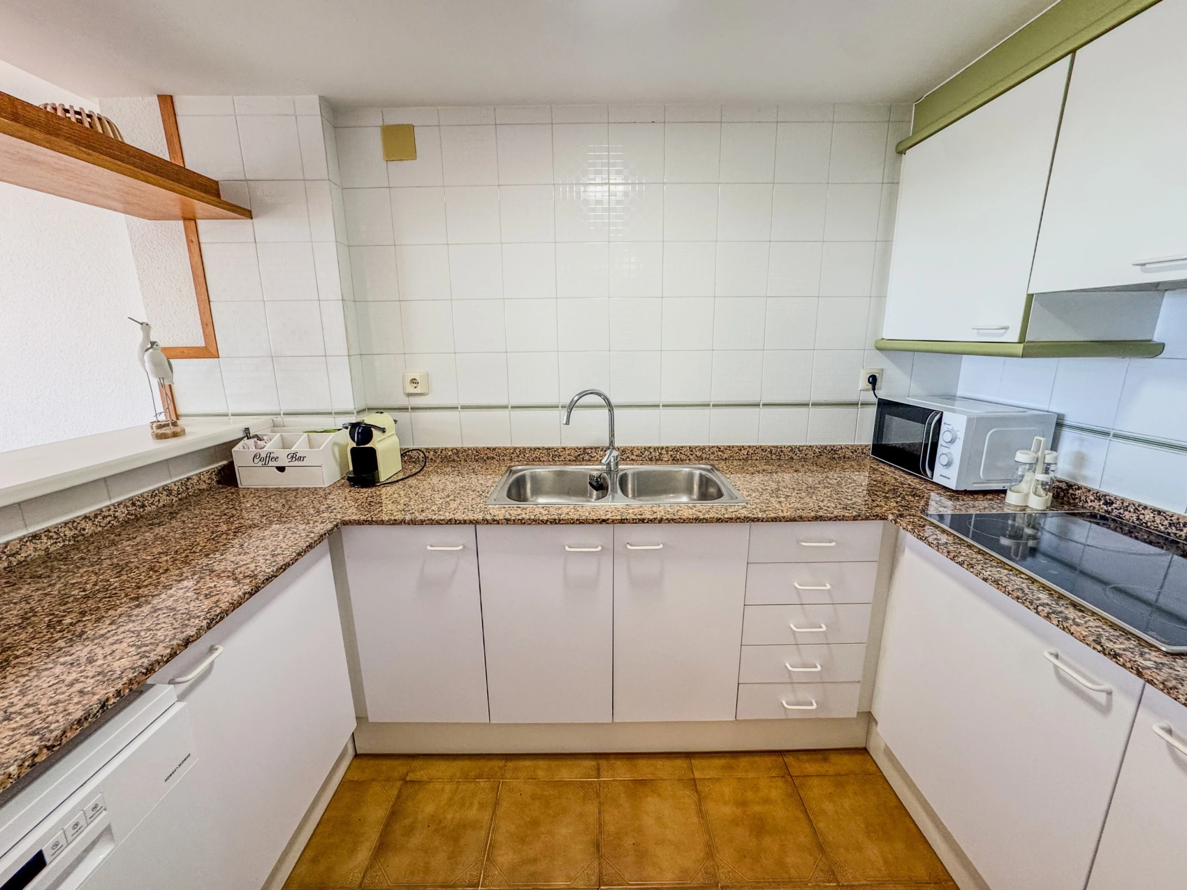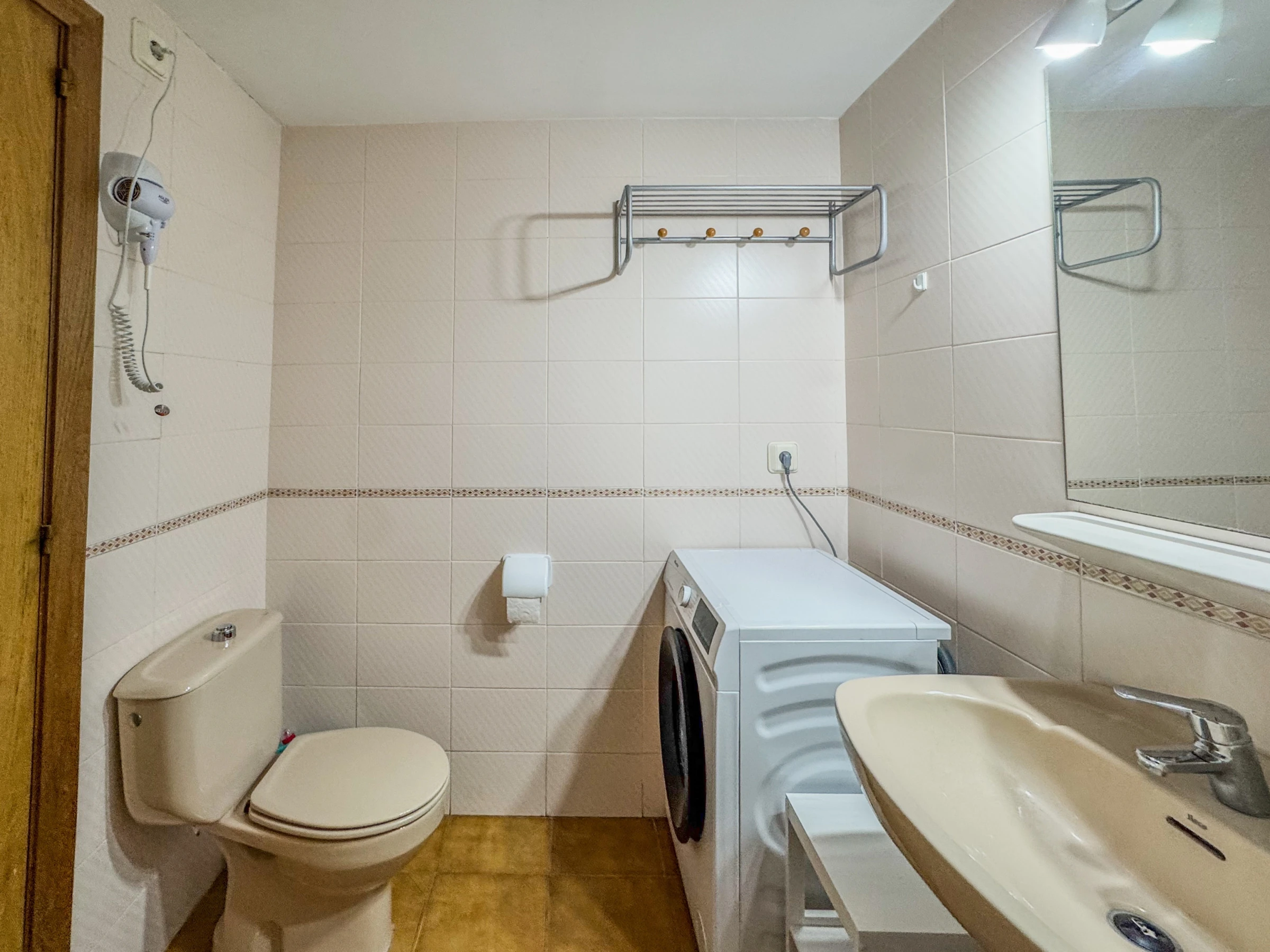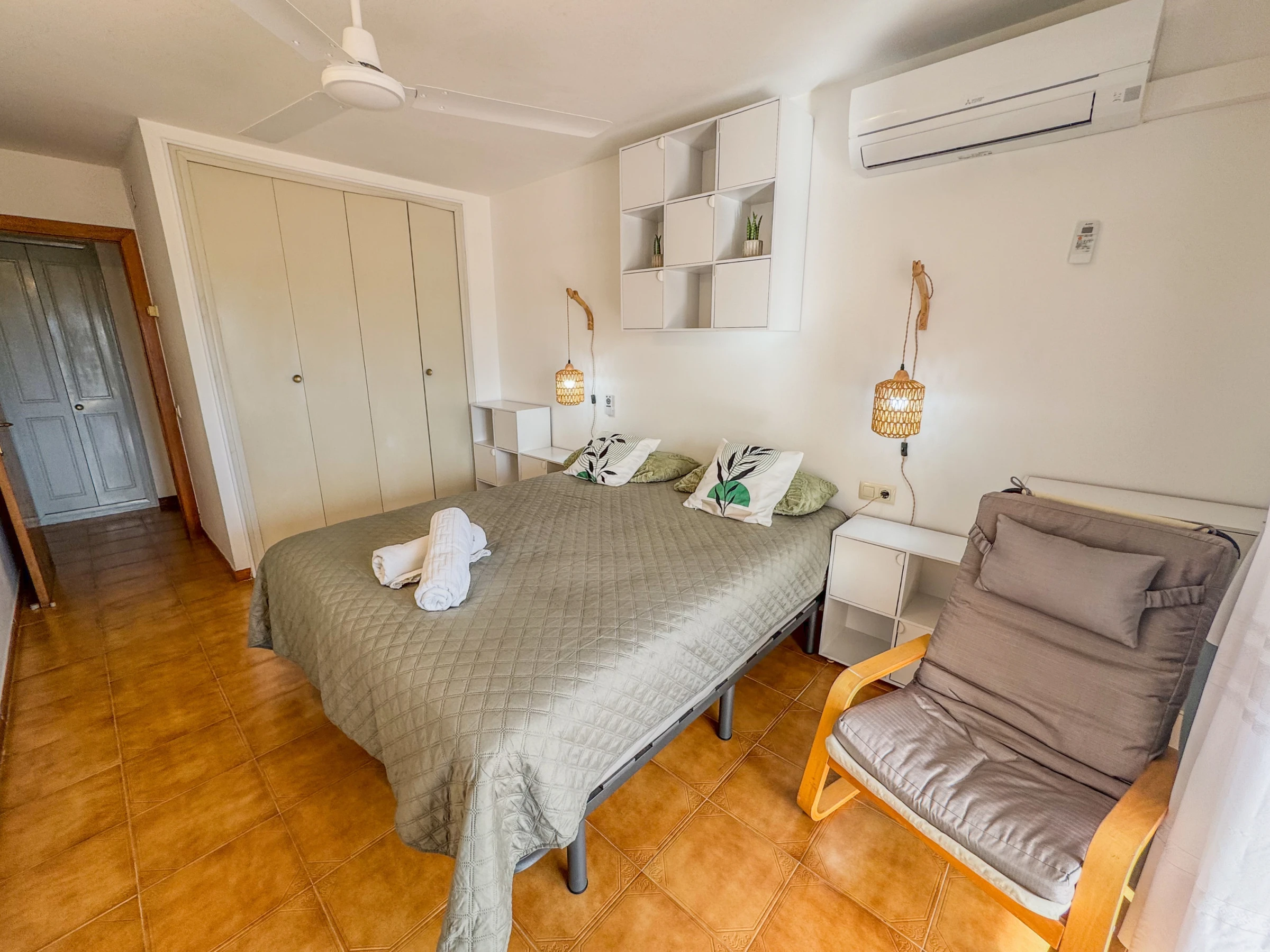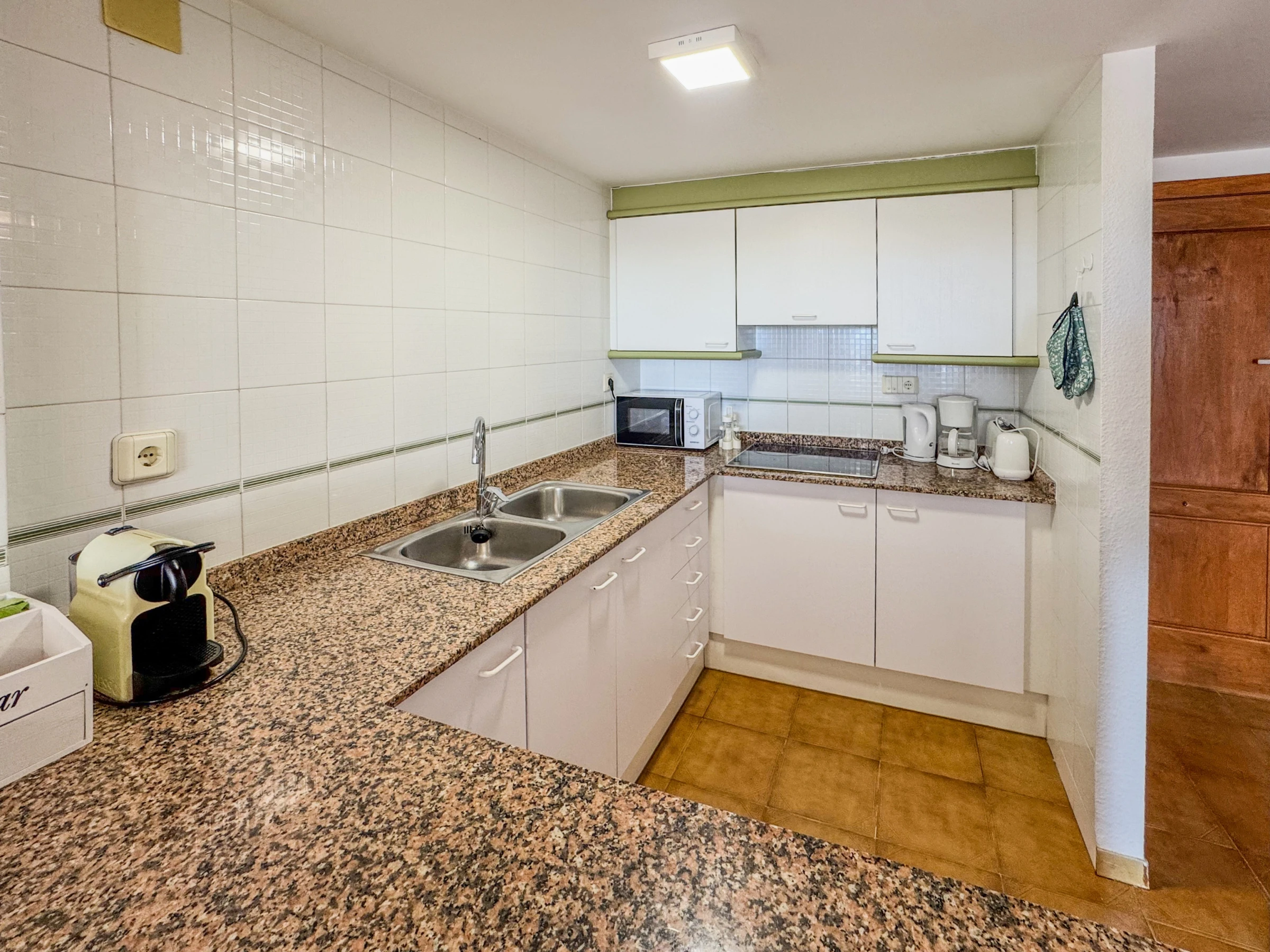 Il dispose d’un salon-salle à manger lumineux avec canapé-lit de haute qualité (140 × 200 cm), climatisation et chauffage. La cuisine est entièrement équipée avec plaque vitrocéramique, lave-vaisselle, micro-ondes et cafetière.