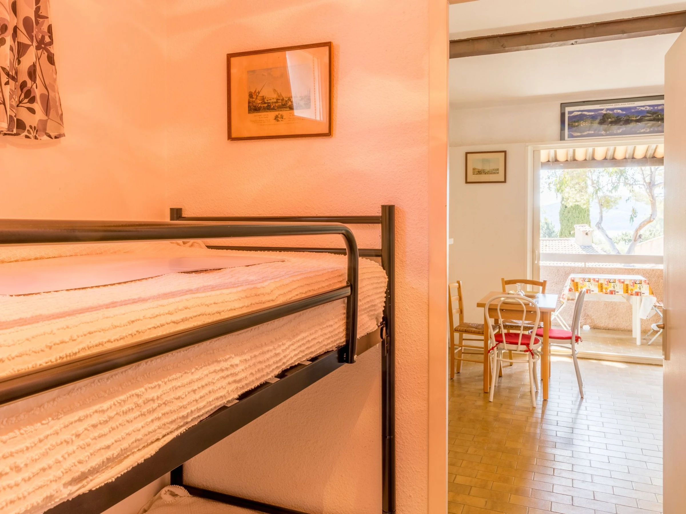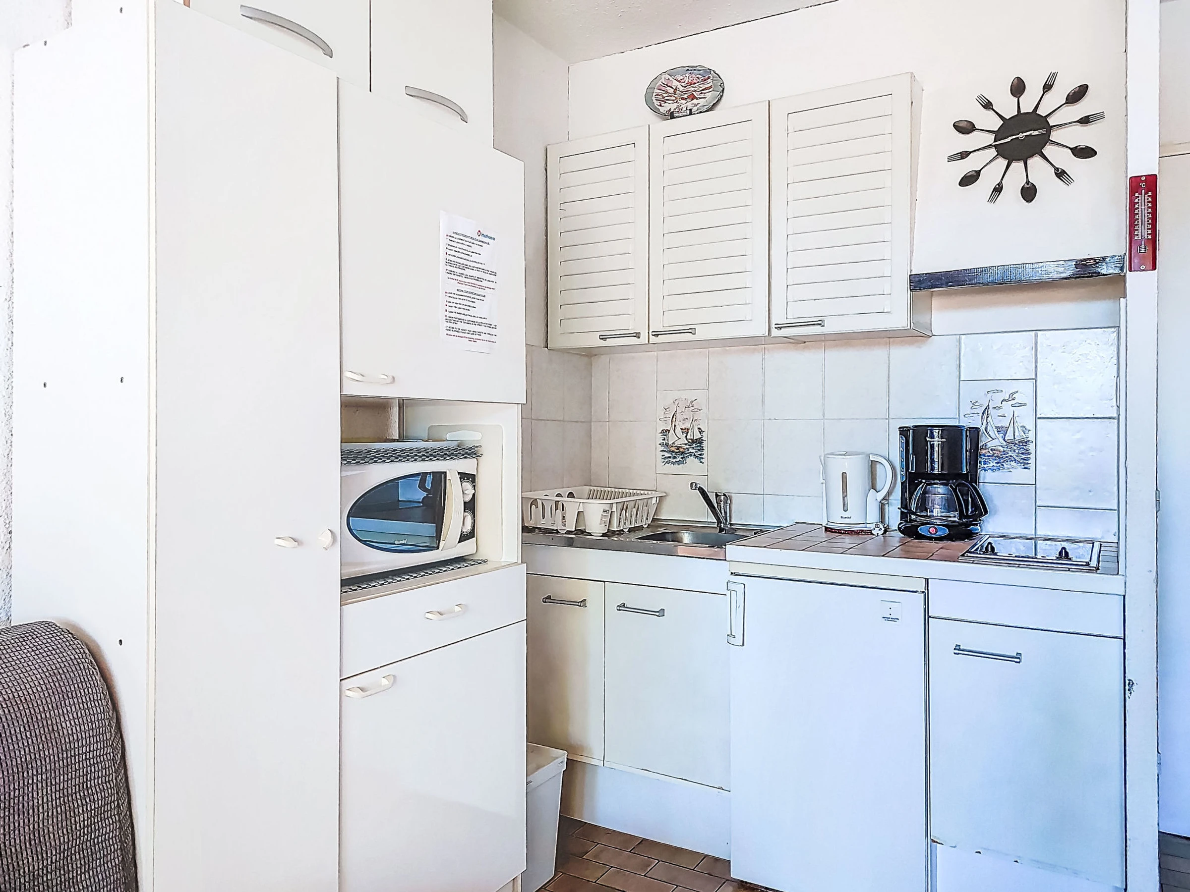 Studio 22 m2 au 1er étage. Entrée avec 1 x 2 lits superposés (80 cm, longueur 190 cm). Séjour/salle à manger avec 1 divan-lit double (140 cm, longueur 200 cm), TV. Sortie sur la terrasse. Coin cuisine (2 plaques vitrocéramiques, grille-pain, bouilloire électrique, micro-ondes, cafetière électrique). Douche/WC. Chauffage électrique. Terrasse 8 m2, couverte, situation sud-est. Meubles de terrasse. Vue partielle sur la mer. A disposition: lave-linge. Internet (Connexion WIFI, en sus). Place de parking No 106. Veuillez noter: détecteur de fumée. [hidden]