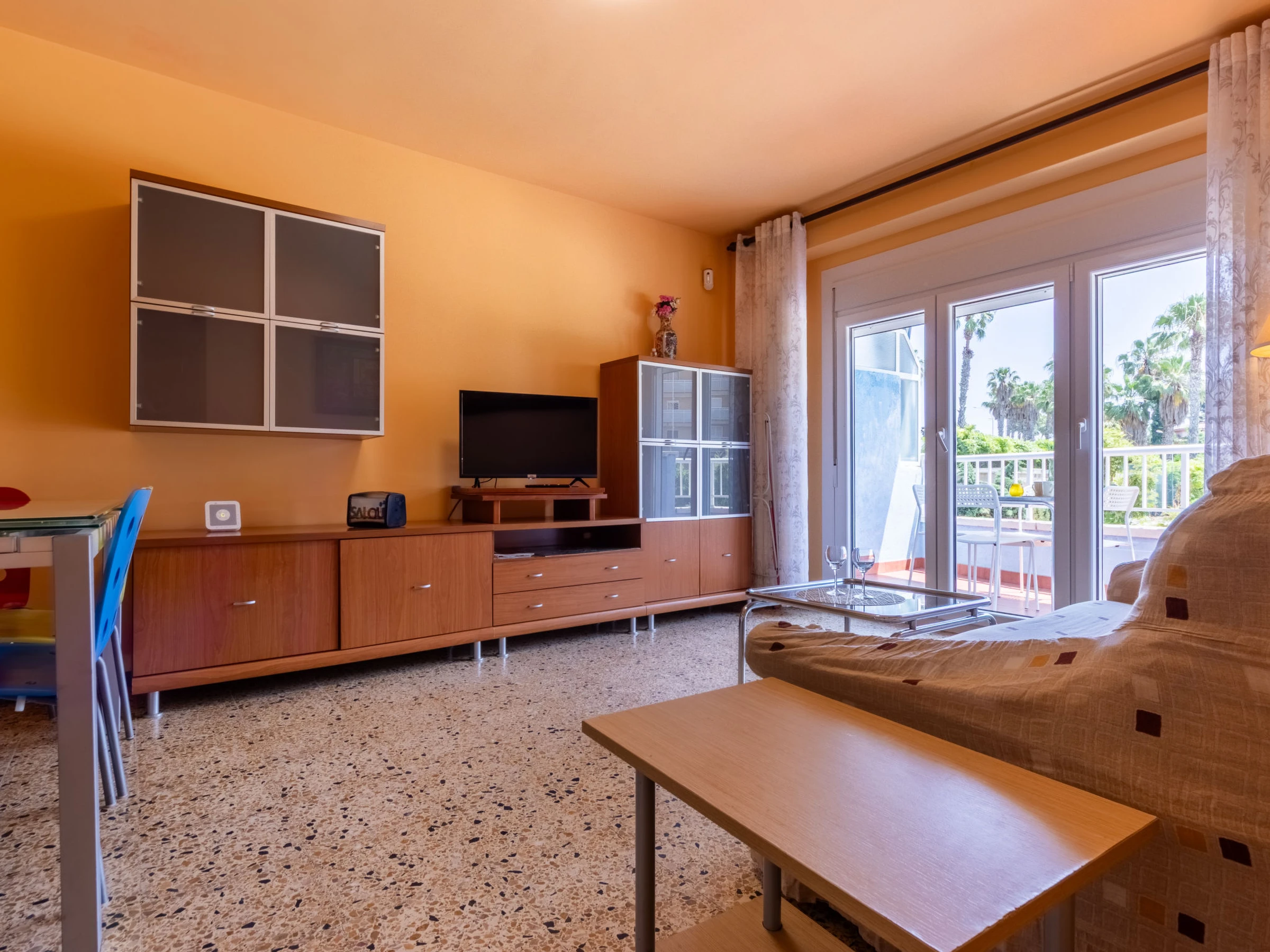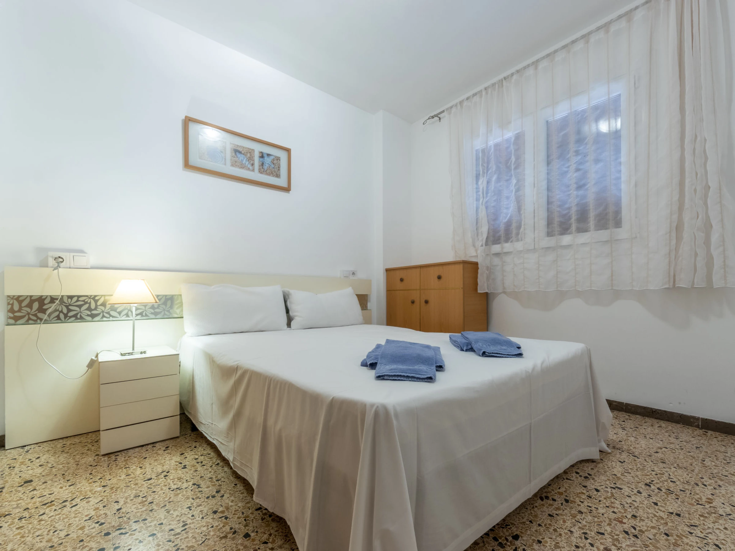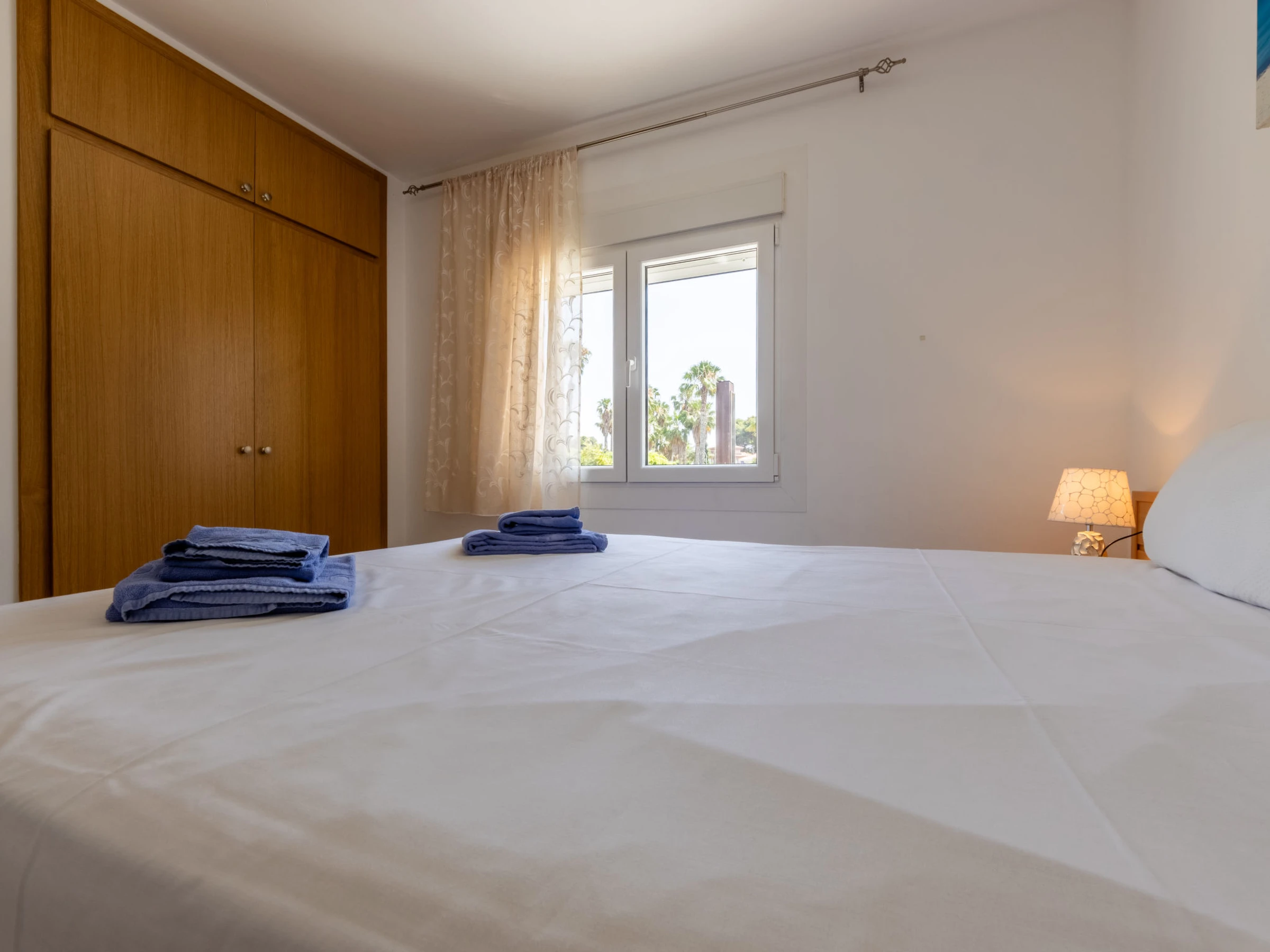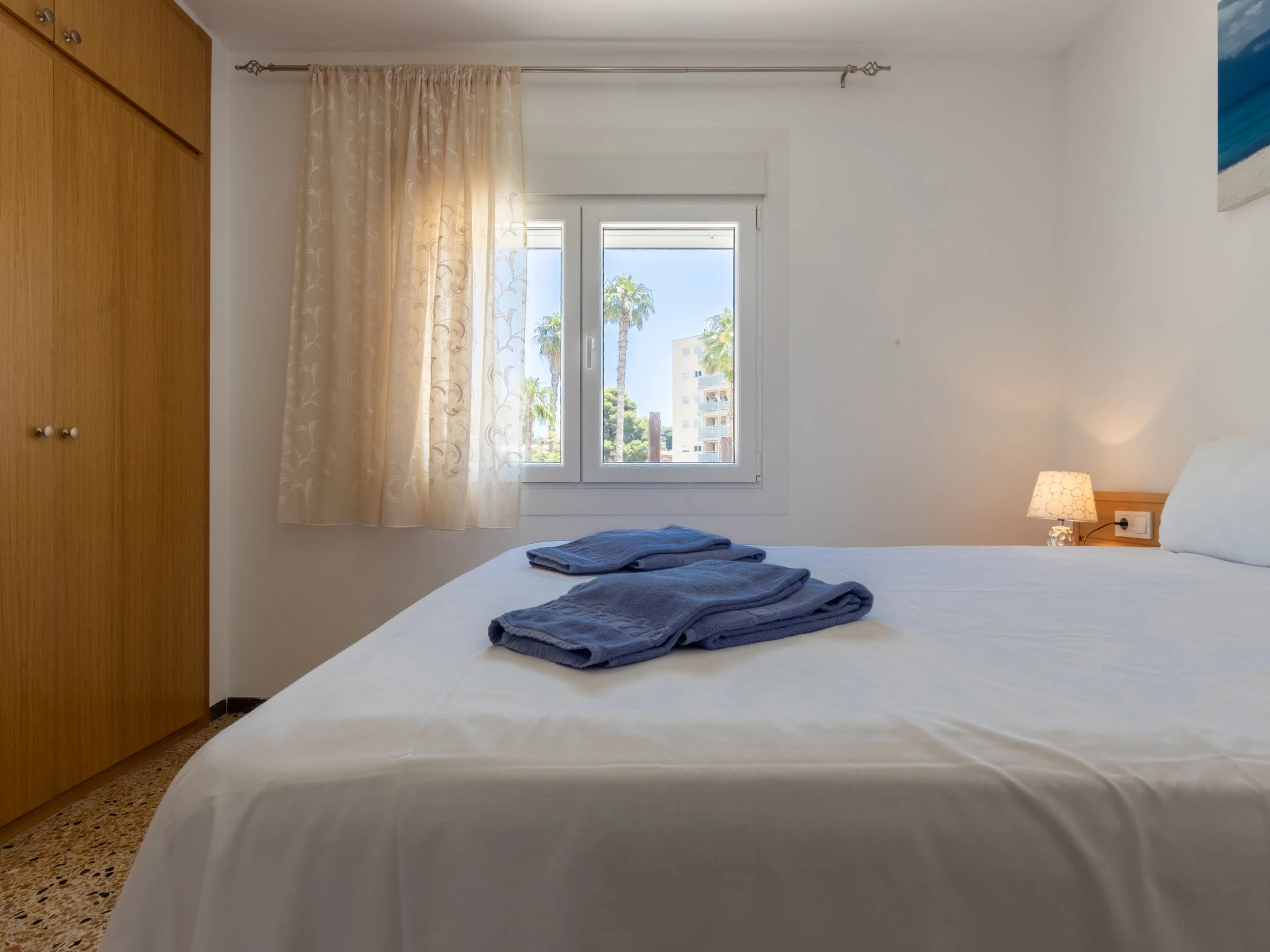 "California 2", apt 3 pièces 50 m2. Aménagement fonctionnel: séjour/salle à manger avec Télévision numérique et air-conditionné. Sortie sur le balcon. 1 chambre avec 1 grand-lit (150 cm, longueur 190 cm). 1 chambre avec 1 grand-lit (135 cm, longueur 190 cm). Cuisine ouverte (2 plaques vitrocéramiques, grille-pain, bouilloire électrique, micro-ondes, cafetière électrique, Capsules pour machine à café (Dolce Gusto) (NON INCLUSES)). Douche/bidet/WC. Chauffage à air chaud, chauffe eau (50 litres). Chauffage pas dans toutes les pièces. Balcon. Mobilier de balcon. Vue sur la ville. A disposition: lave-linge, fer à repasser, sèche-cheveux. Veuillez noter: logement non-fumeur. TV seulement ES. [hidden] ESFCTU[hidden][hidden][hidden]HUTT-33355397