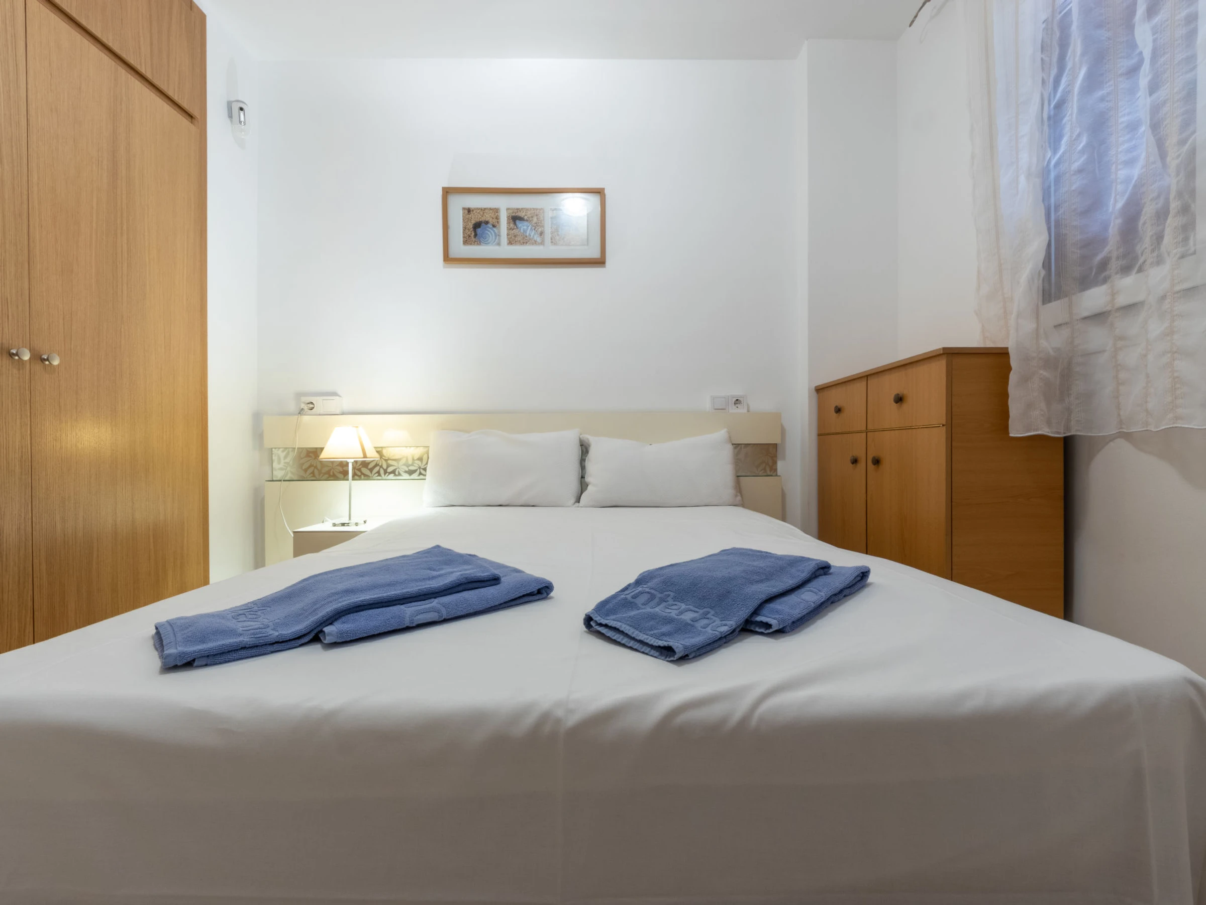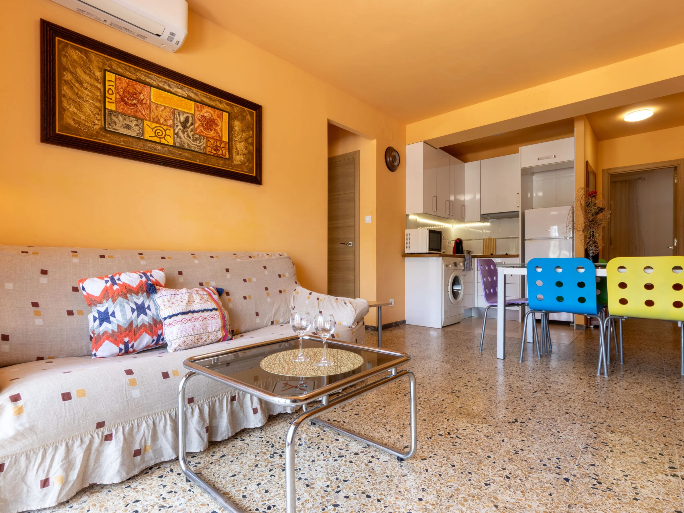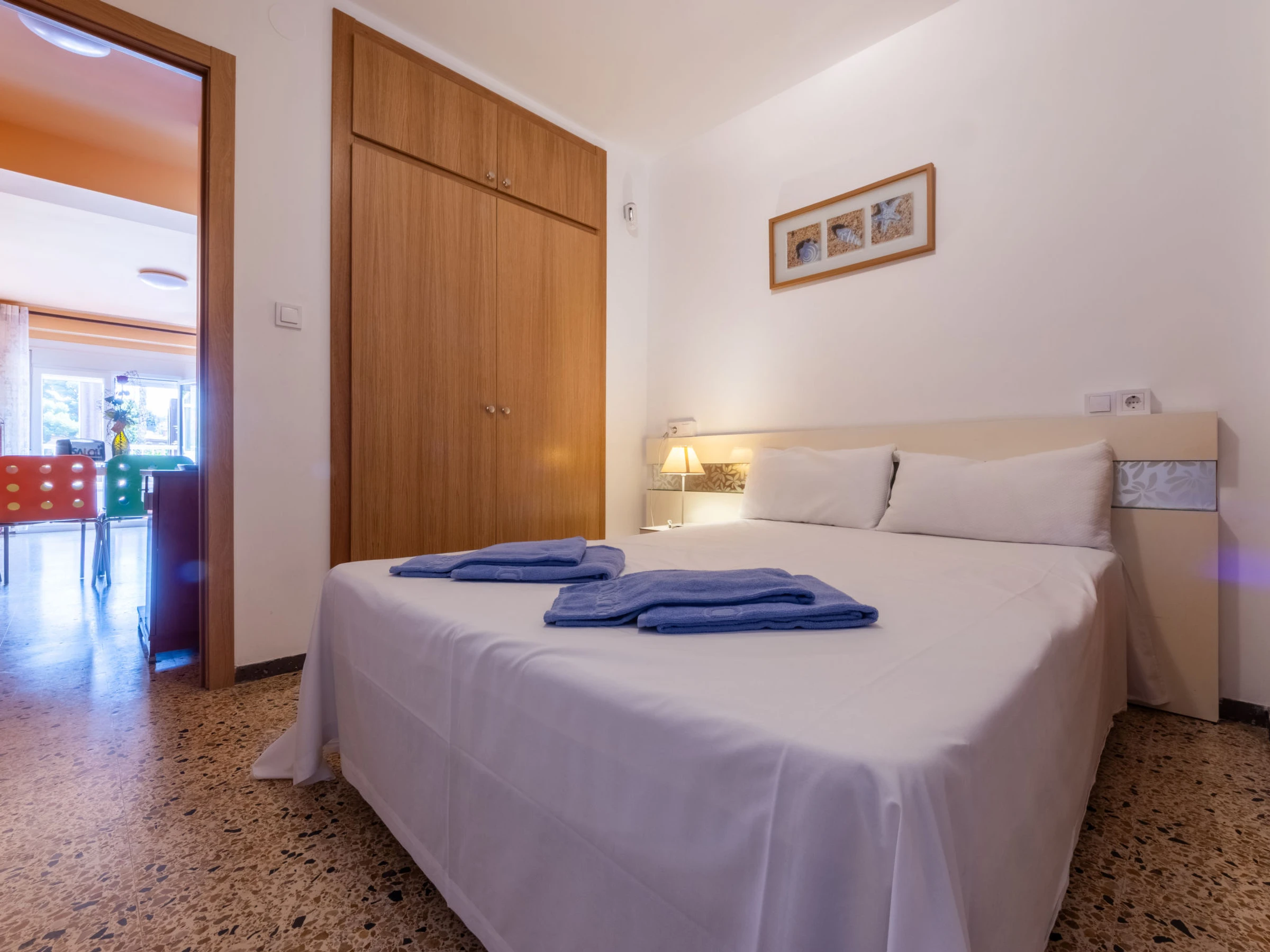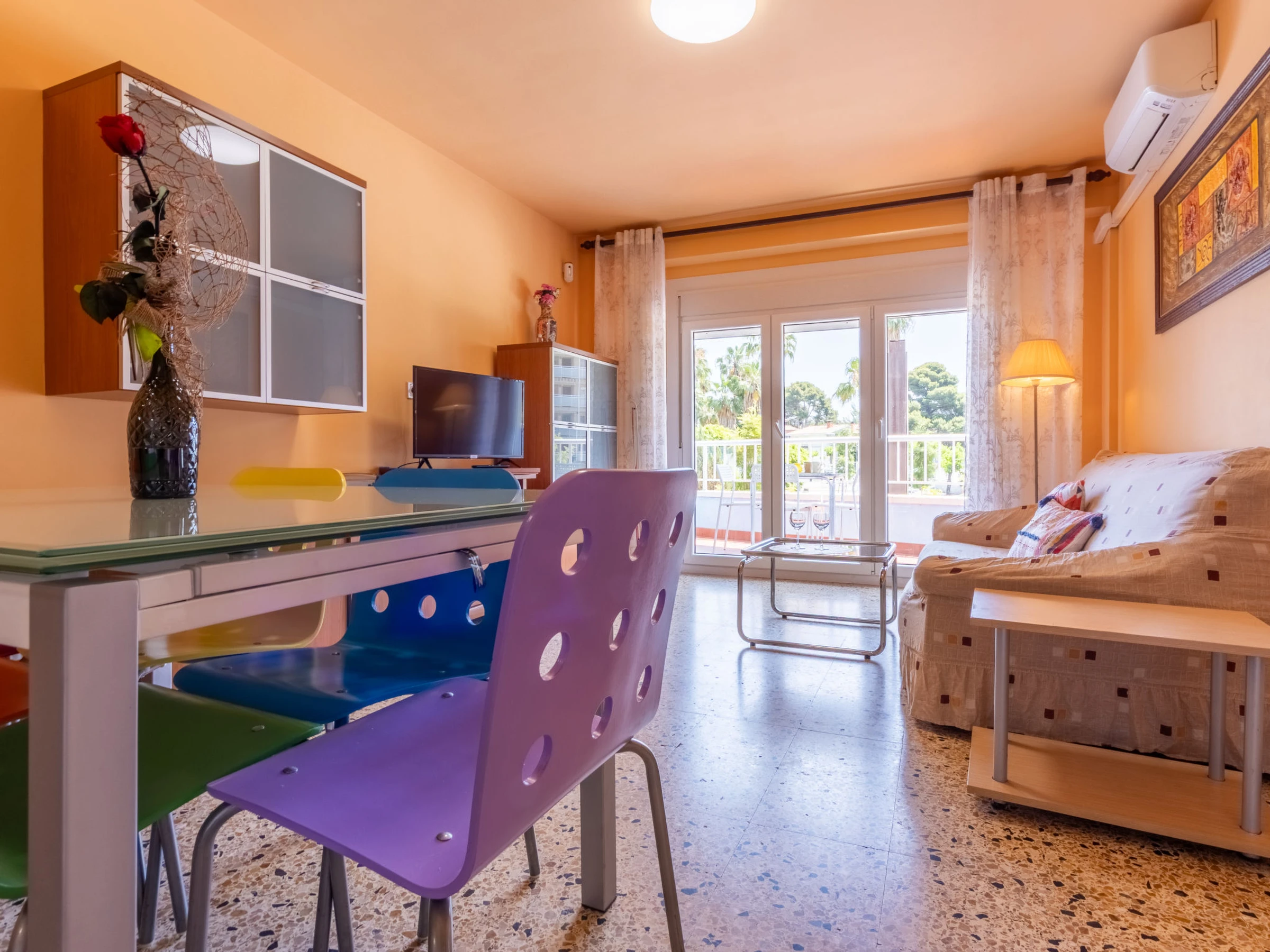 "California 2", apt 3 pièces 50 m2. Aménagement fonctionnel: séjour/salle à manger avec Télévision numérique et air-conditionné. Sortie sur le balcon. 1 chambre avec 1 grand-lit (150 cm, longueur 190 cm). 1 chambre avec 1 grand-lit (135 cm, longueur 190 cm). Cuisine ouverte (2 plaques vitrocéramiques, grille-pain, bouilloire électrique, micro-ondes, cafetière électrique, Capsules pour machine à café (Dolce Gusto) (NON INCLUSES)). Douche/bidet/WC. Chauffage à air chaud, chauffe eau (50 litres). Chauffage pas dans toutes les pièces. Balcon. Mobilier de balcon. Vue sur la ville. A disposition: lave-linge, fer à repasser, sèche-cheveux. Veuillez noter: logement non-fumeur. TV seulement ES. [hidden] ESFCTU[hidden][hidden][hidden]HUTT-33355397