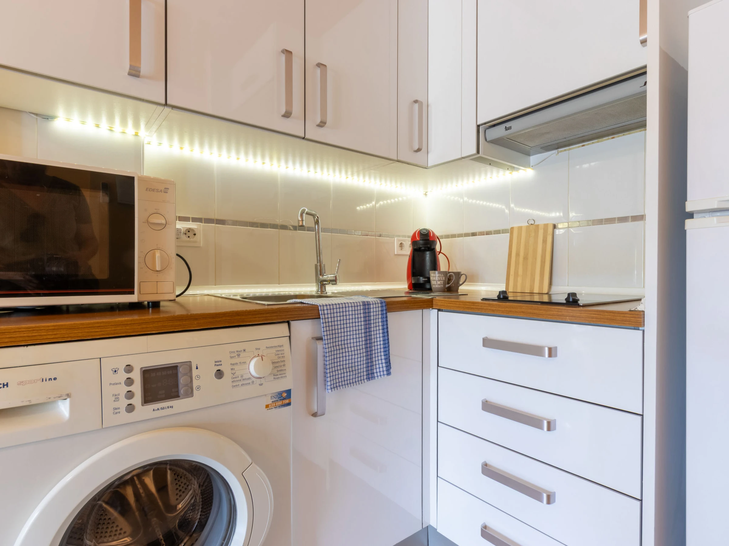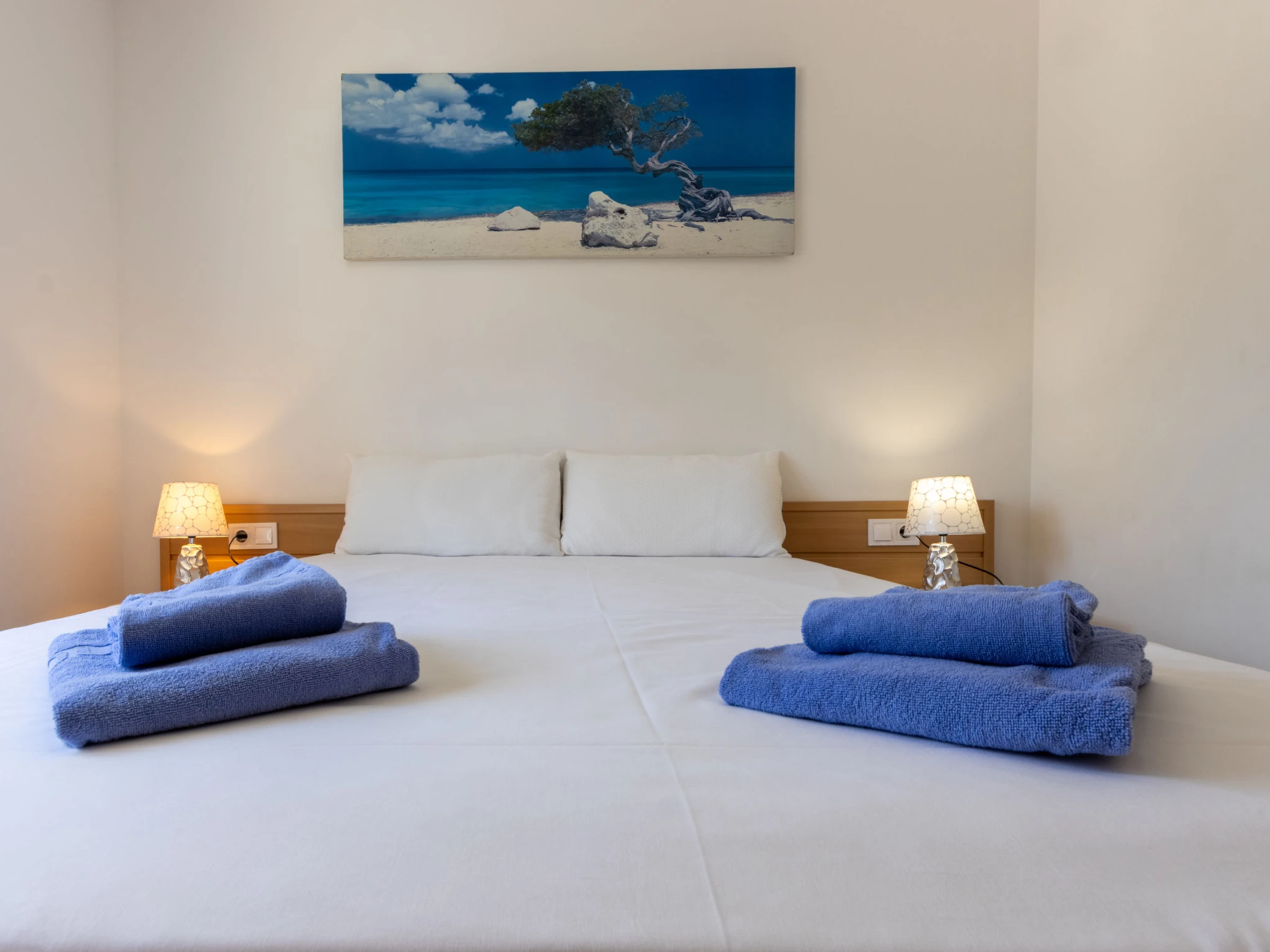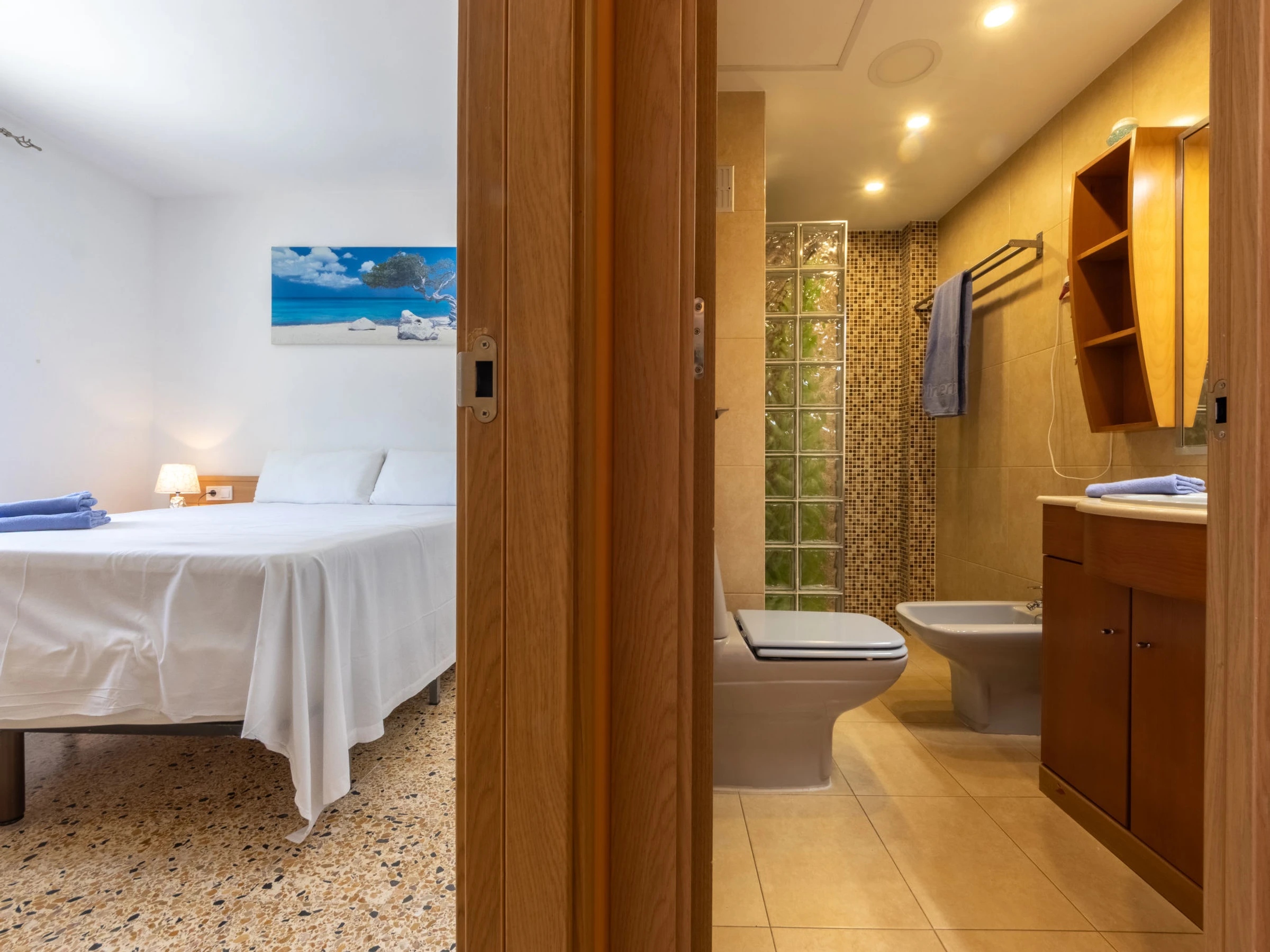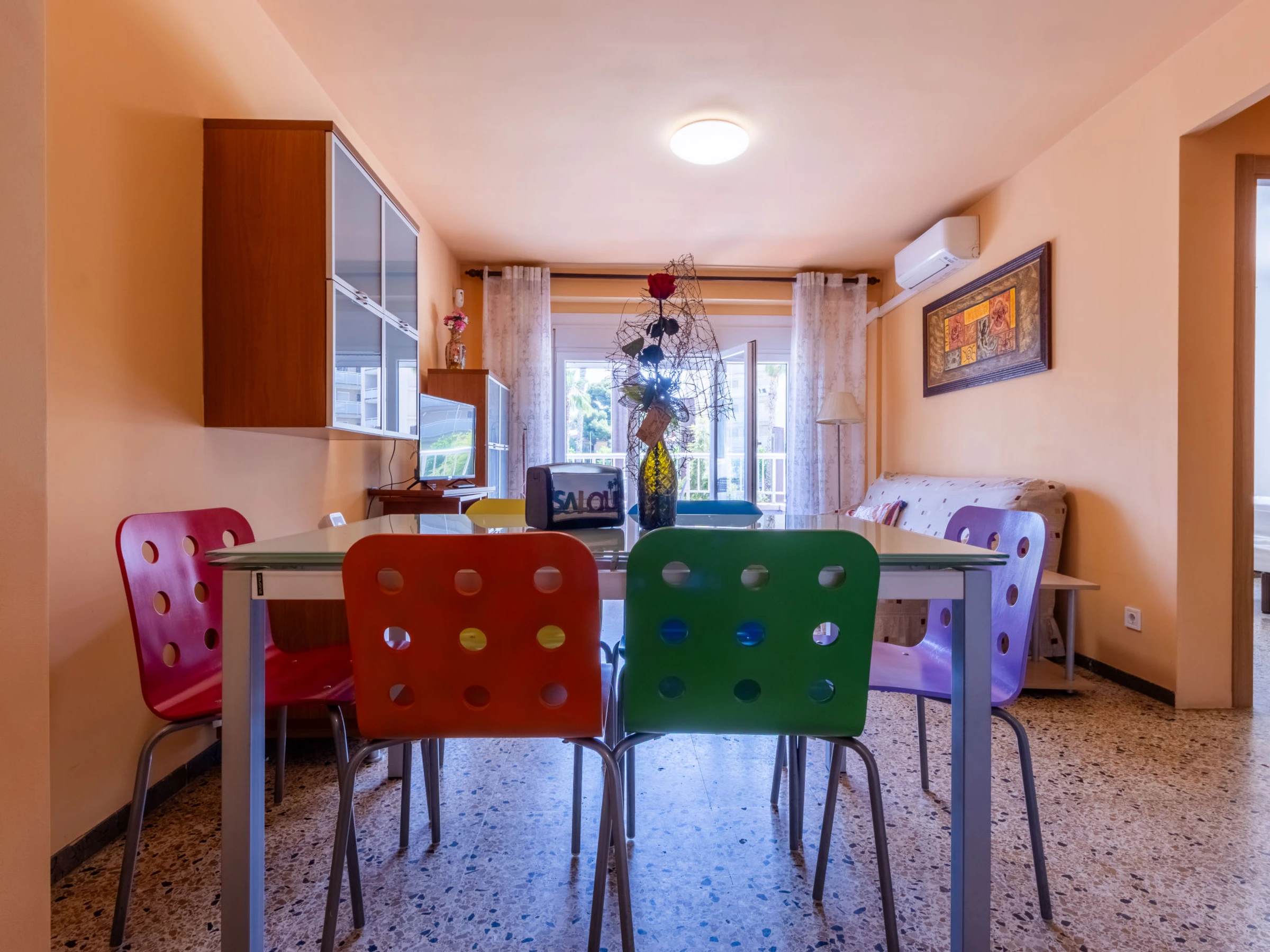 "California 2", apt 3 pièces 50 m2. Aménagement fonctionnel: séjour/salle à manger avec Télévision numérique et air-conditionné. Sortie sur le balcon. 1 chambre avec 1 grand-lit (150 cm, longueur 190 cm). 1 chambre avec 1 grand-lit (135 cm, longueur 190 cm). Cuisine ouverte (2 plaques vitrocéramiques, grille-pain, bouilloire électrique, micro-ondes, cafetière électrique, Capsules pour machine à café (Dolce Gusto) (NON INCLUSES)). Douche/bidet/WC. Chauffage à air chaud, chauffe eau (50 litres). Chauffage pas dans toutes les pièces. Balcon. Mobilier de balcon. Vue sur la ville. A disposition: lave-linge, fer à repasser, sèche-cheveux. Veuillez noter: logement non-fumeur. TV seulement ES. [hidden] ESFCTU[hidden][hidden][hidden]HUTT-33355397