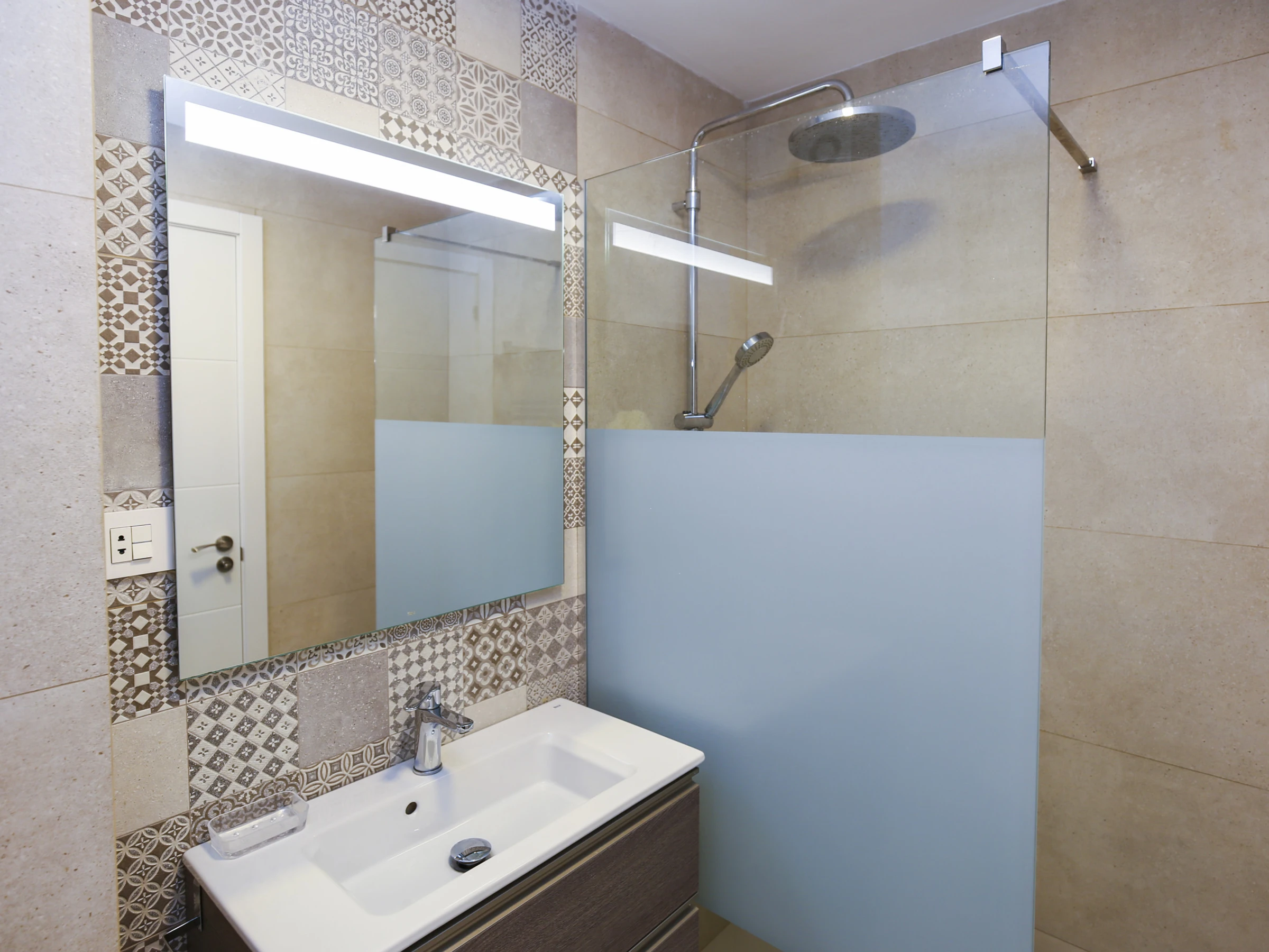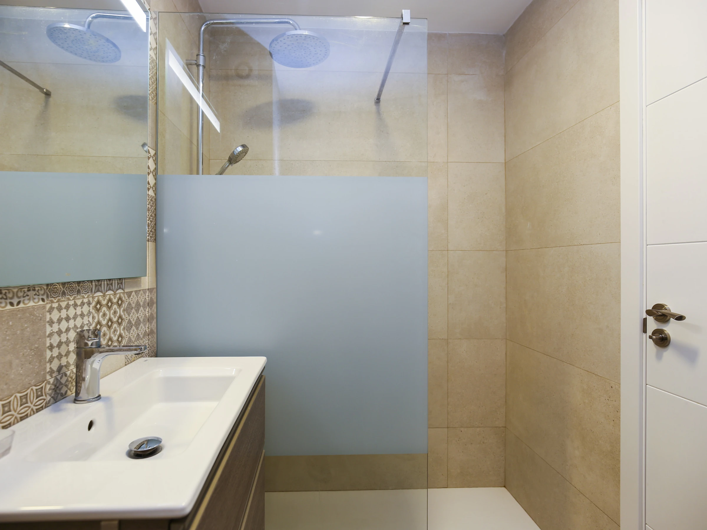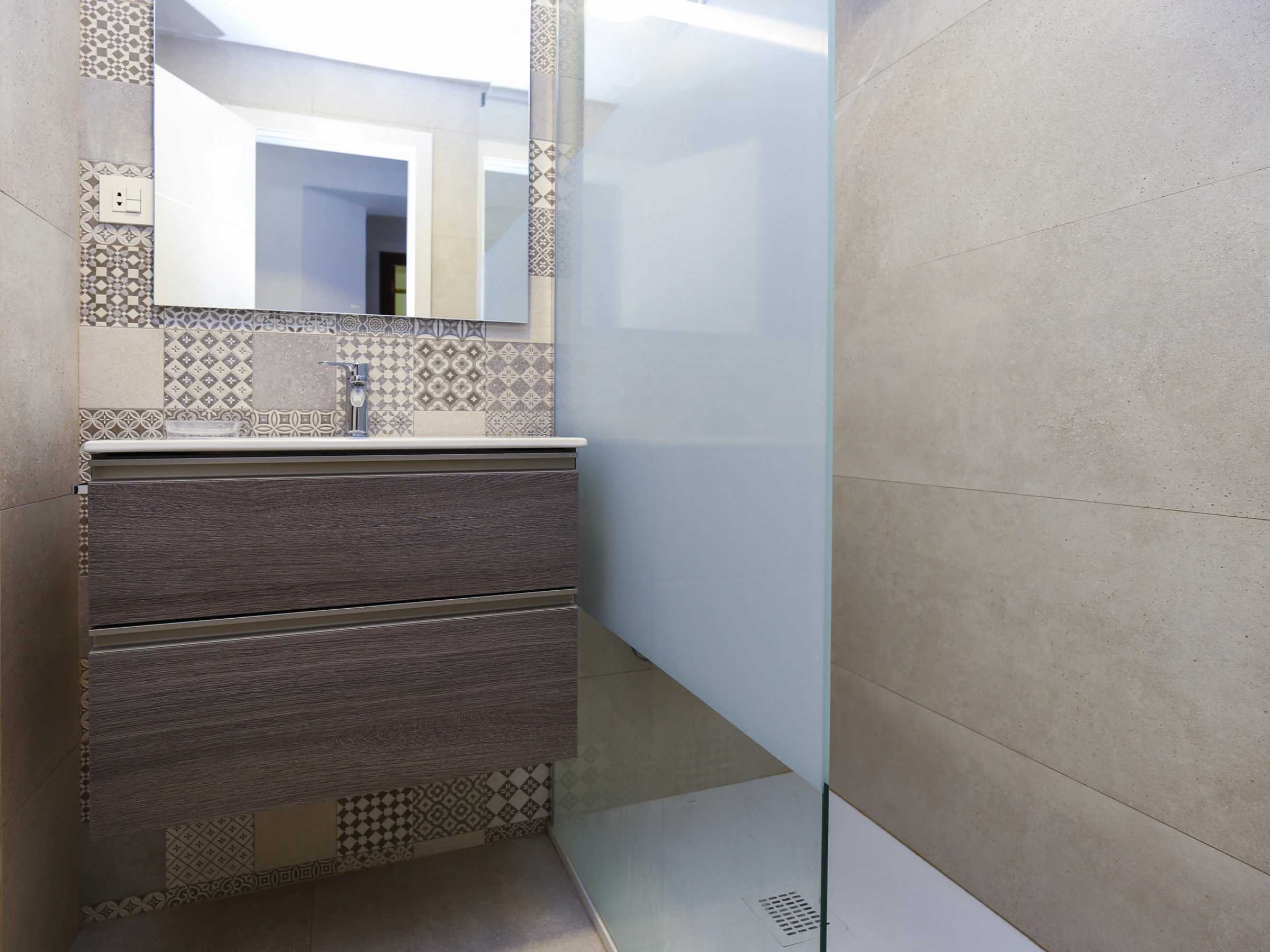 Salle de bain rénovée avec douche.