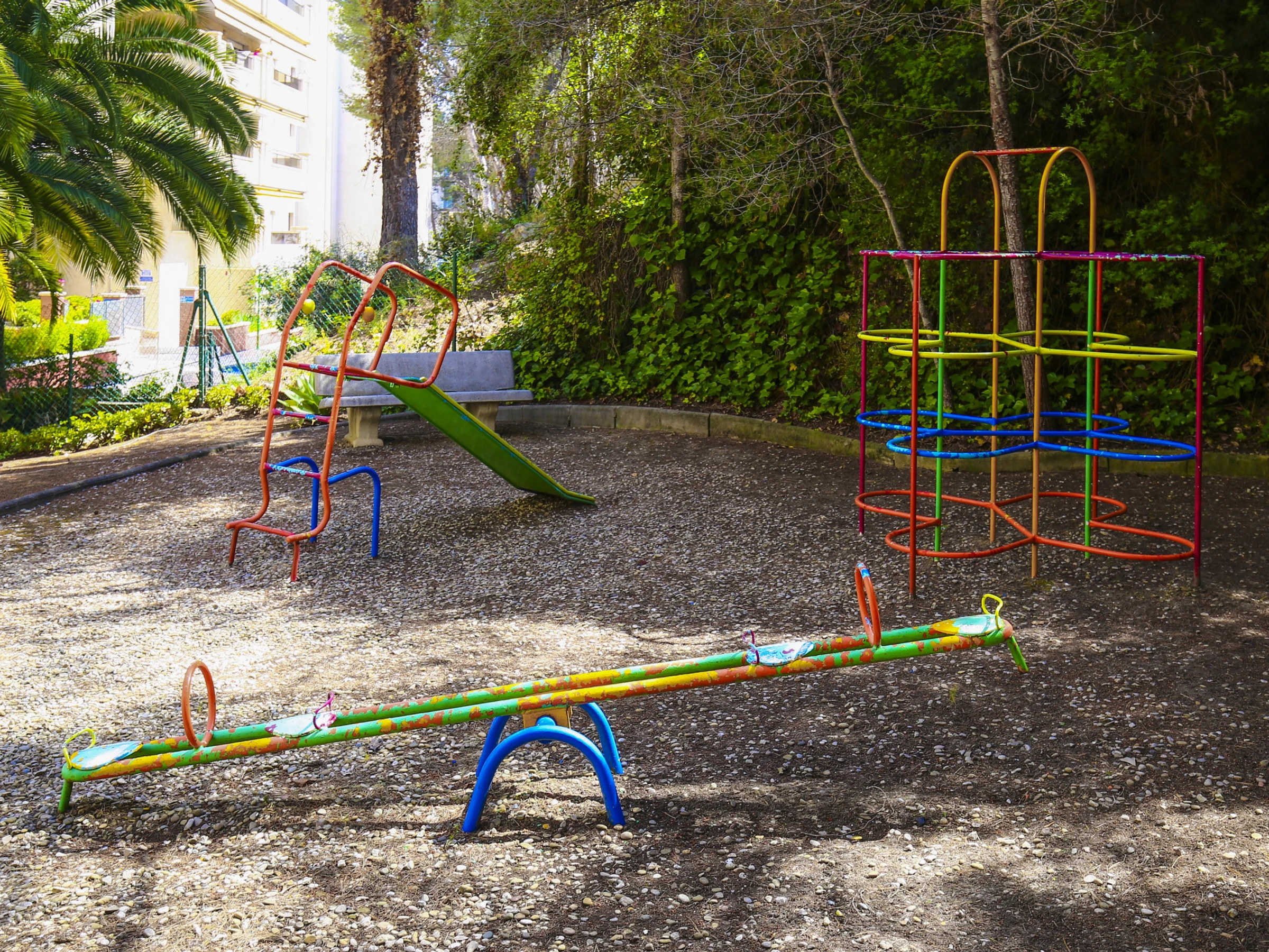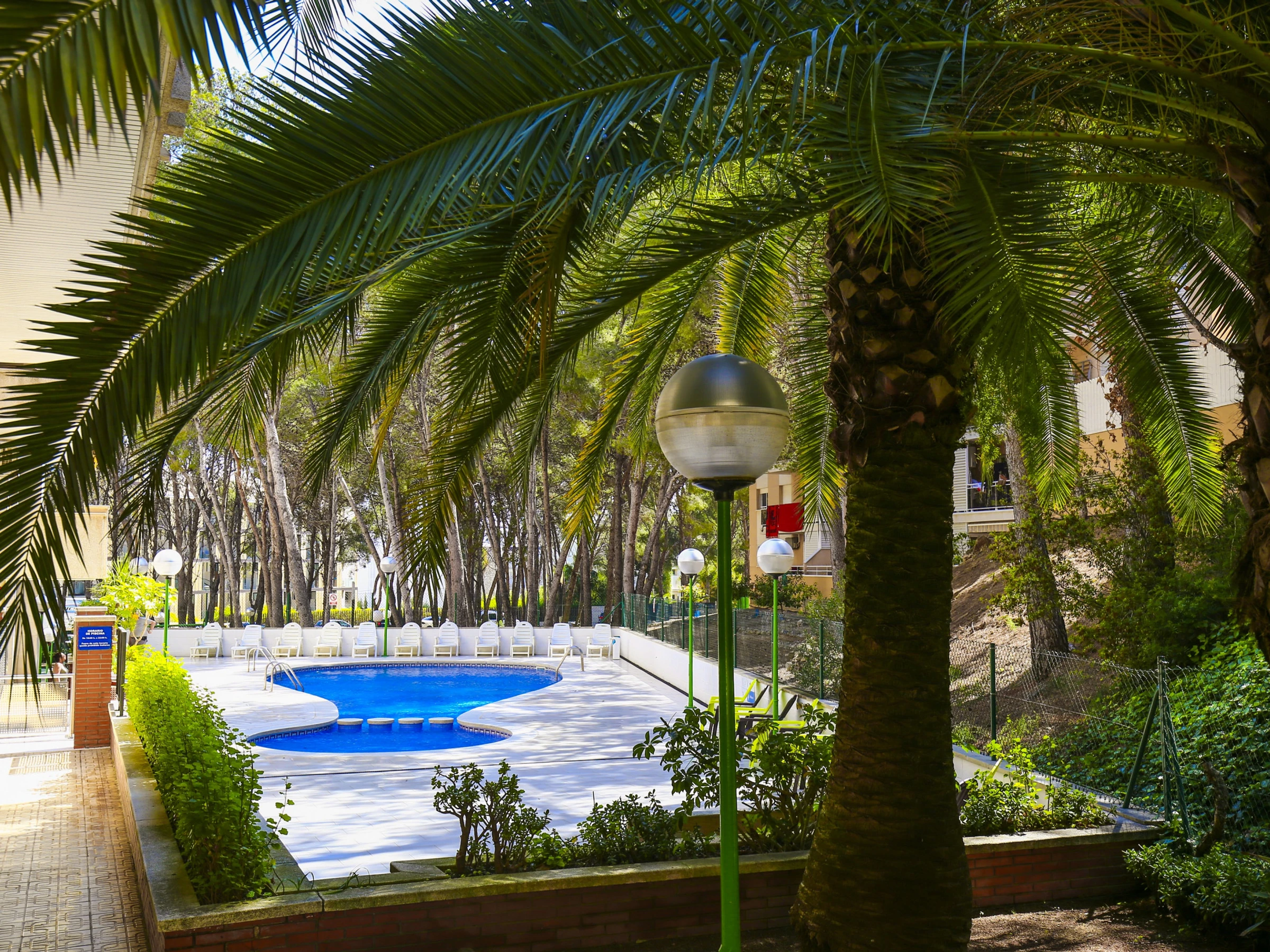 Dispose d'une zone communautaire avec une piscine saisonnière et des transats pour prendre le soleil, ainsi qu'une petite aire de jeux pour les enfants.