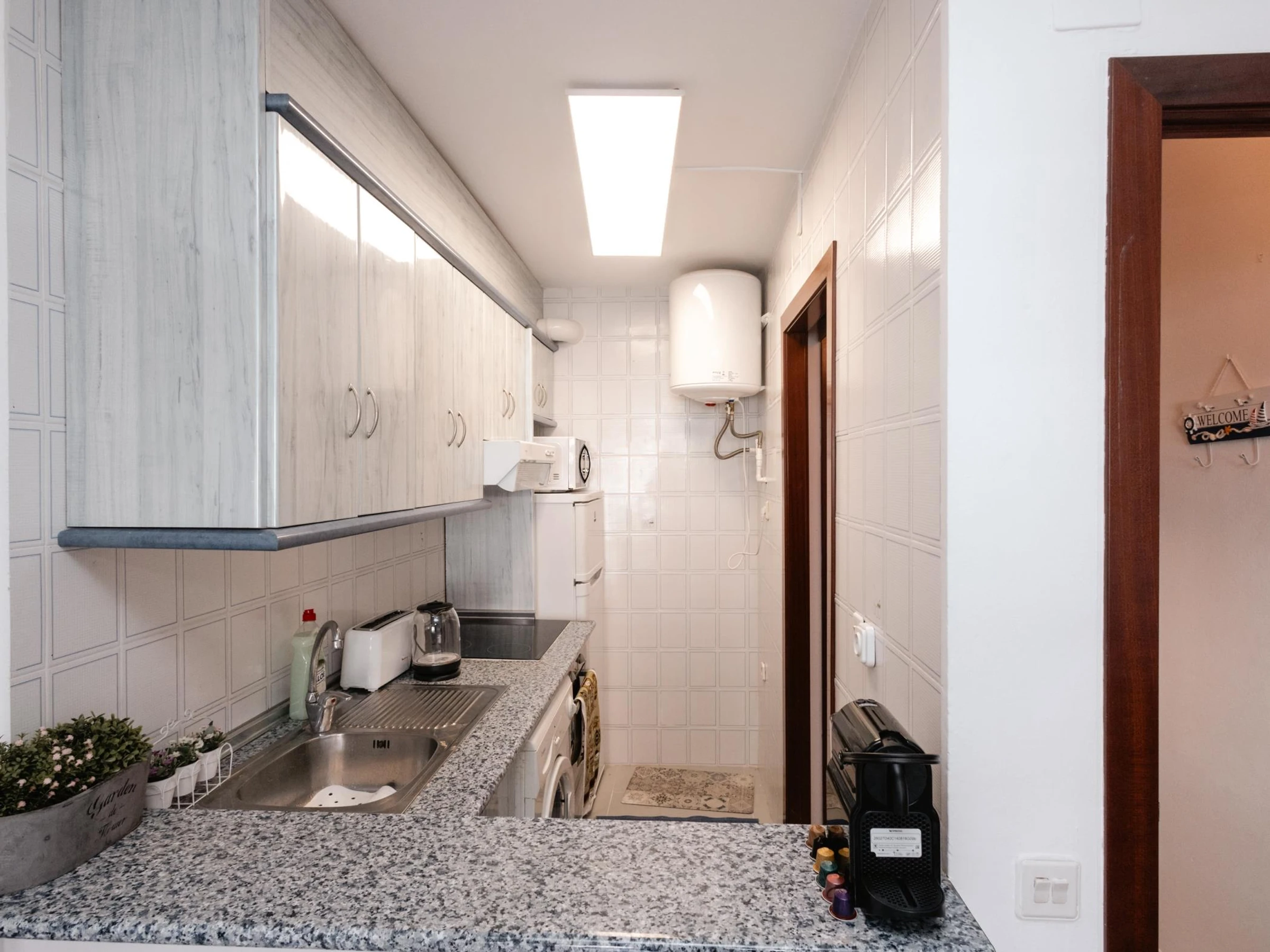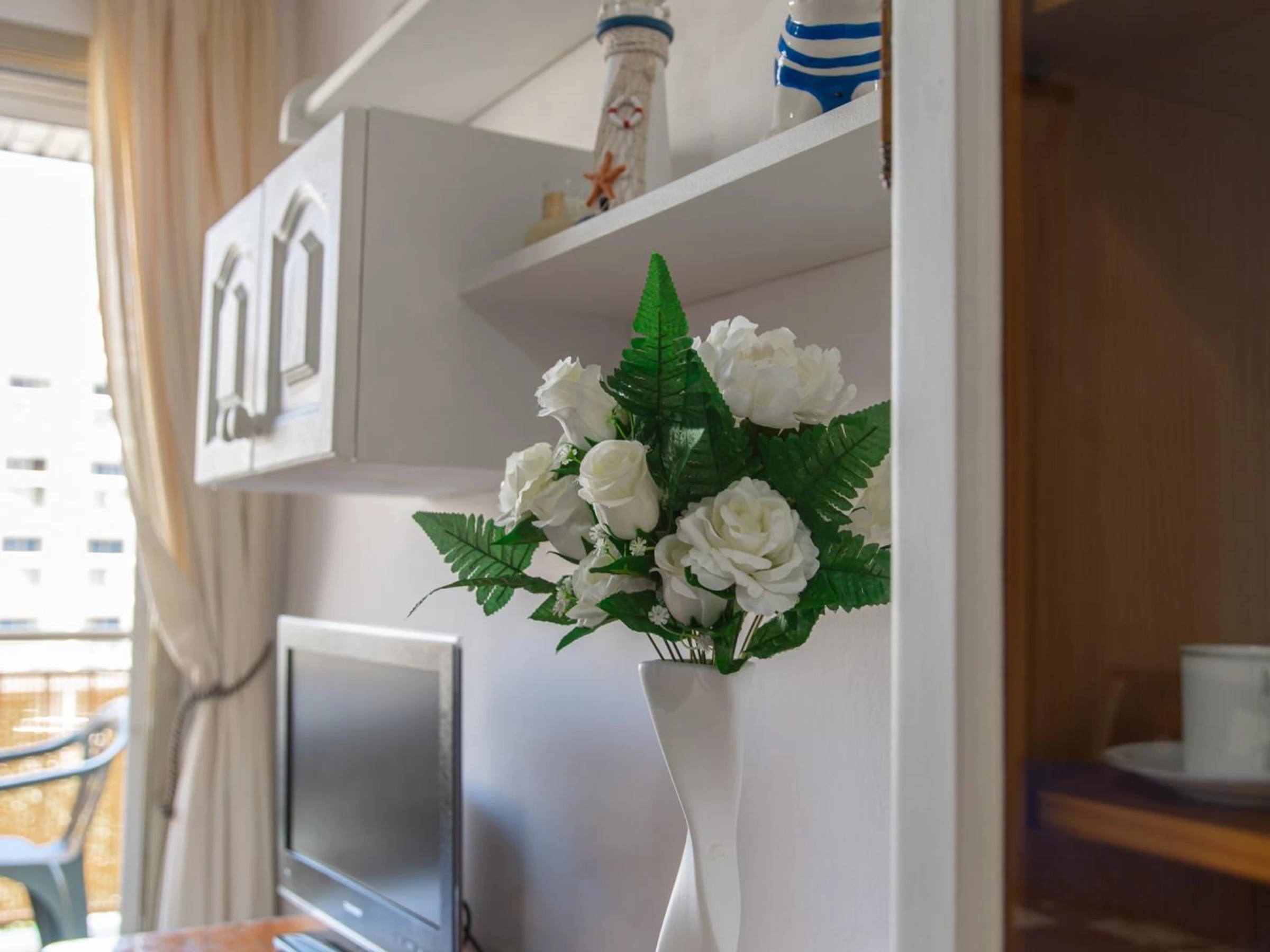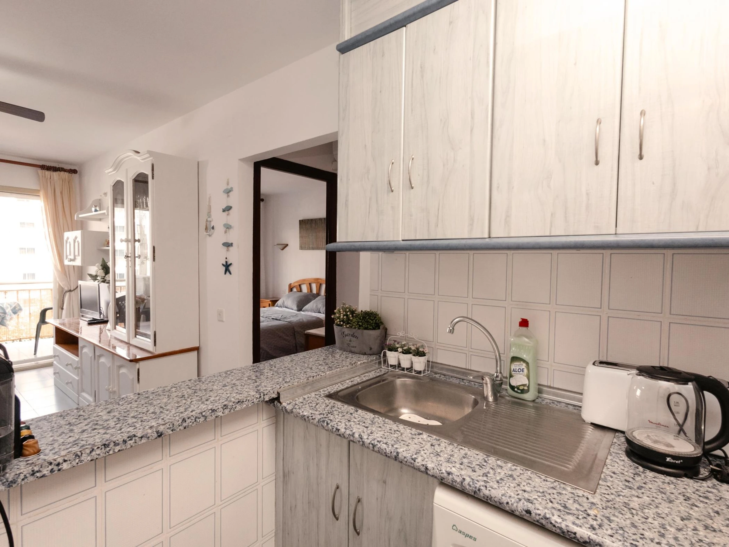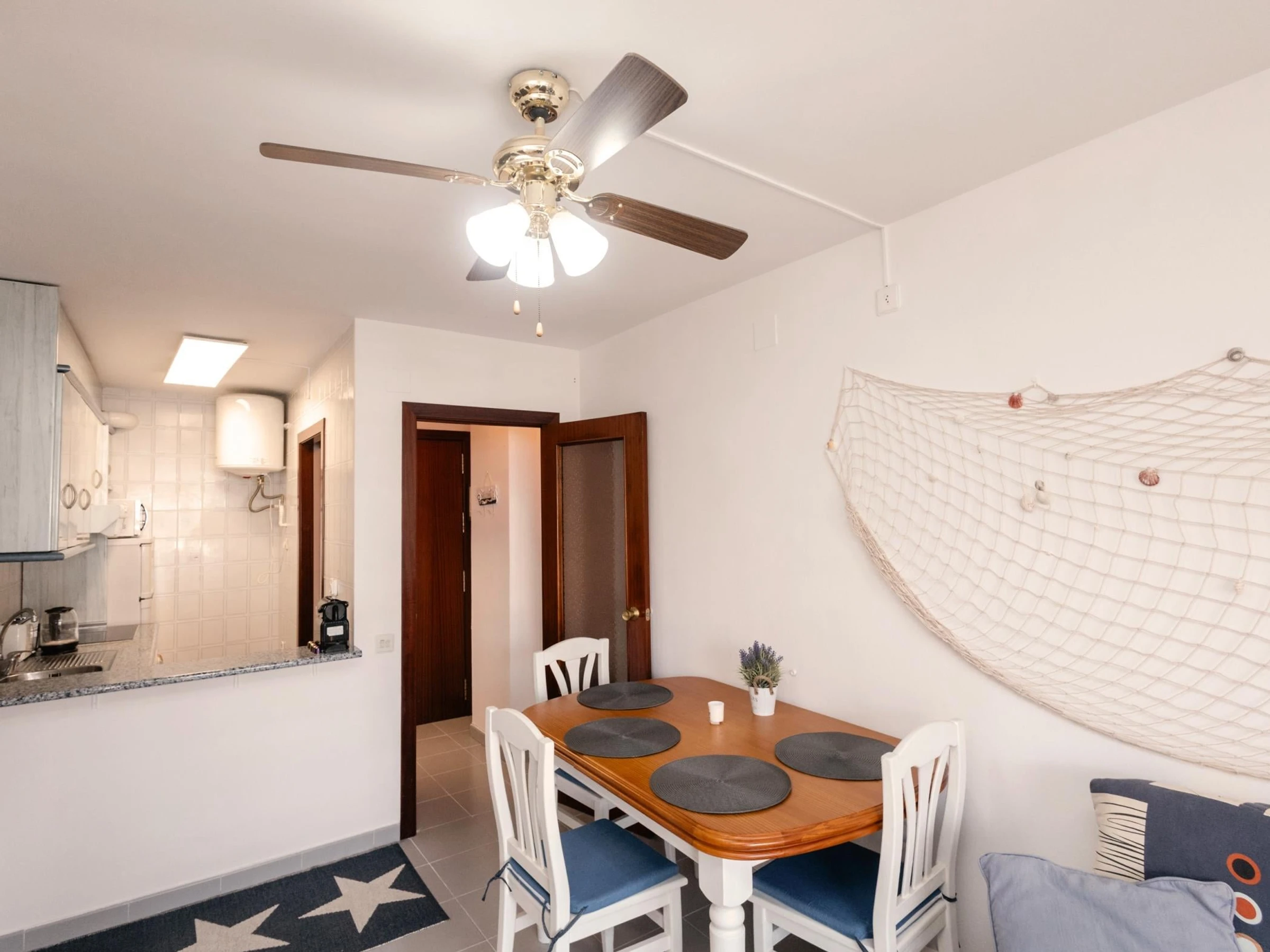 L’appartement dispose de deux chambres doubles confortables, entièrement équipées pour garantir un repos optimal. L’une d’elles comprend un lit double, une télévision et un ventilateur de plafond, créant un espace idéal pour se détendre après une journée à la plage. La seconde chambre est équipée de deux lits simples, parfaite pour les familles ou les groupes d’amis.