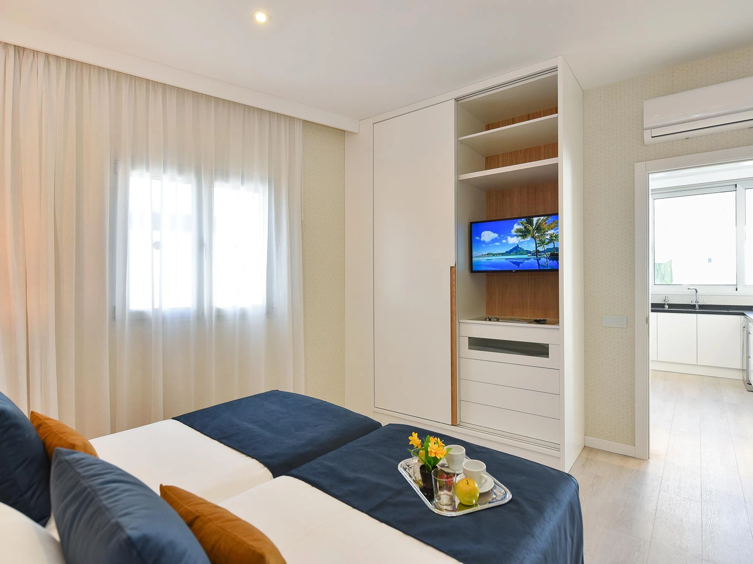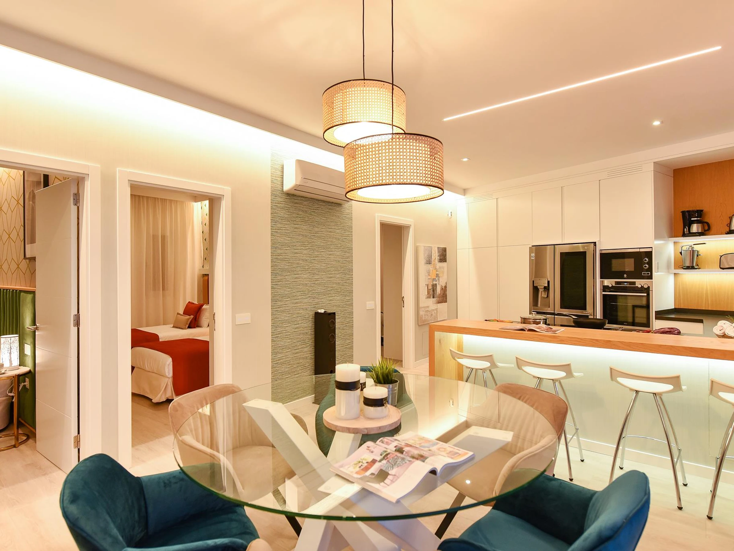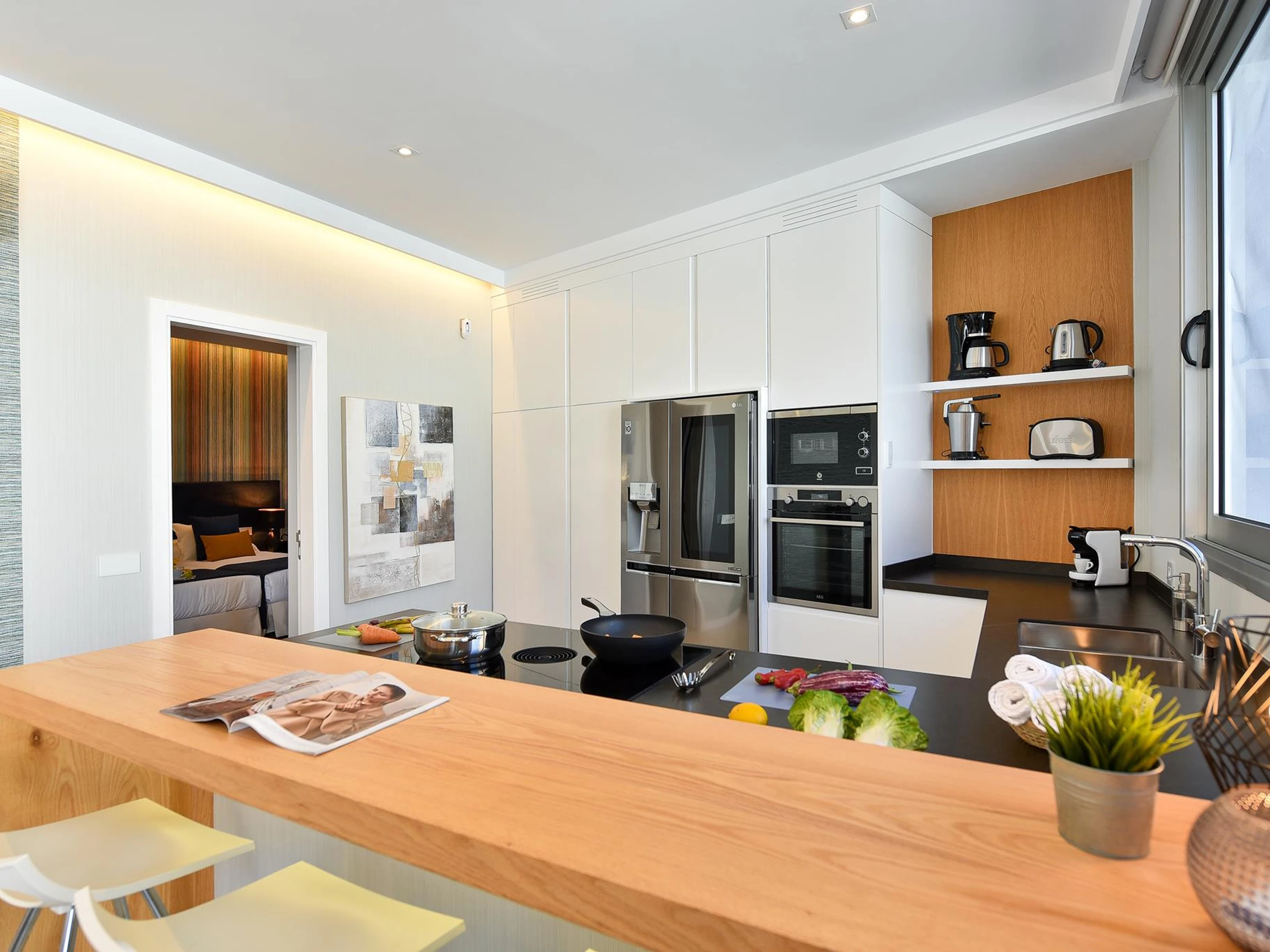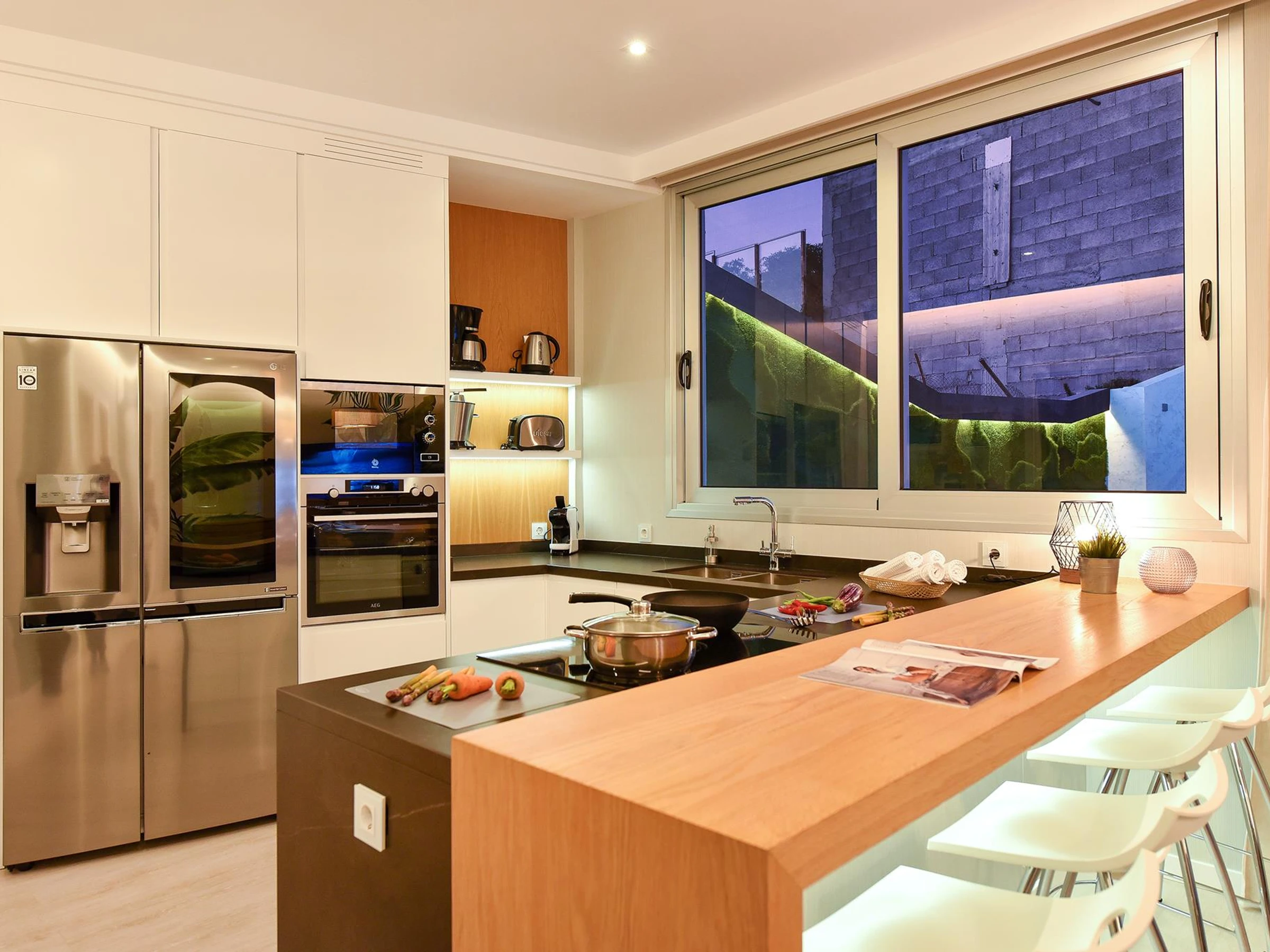 La cuisine, est équipée avec réfrigérateur, micro-ondes, four, congélateur, lave-vaisselle et cafetière.