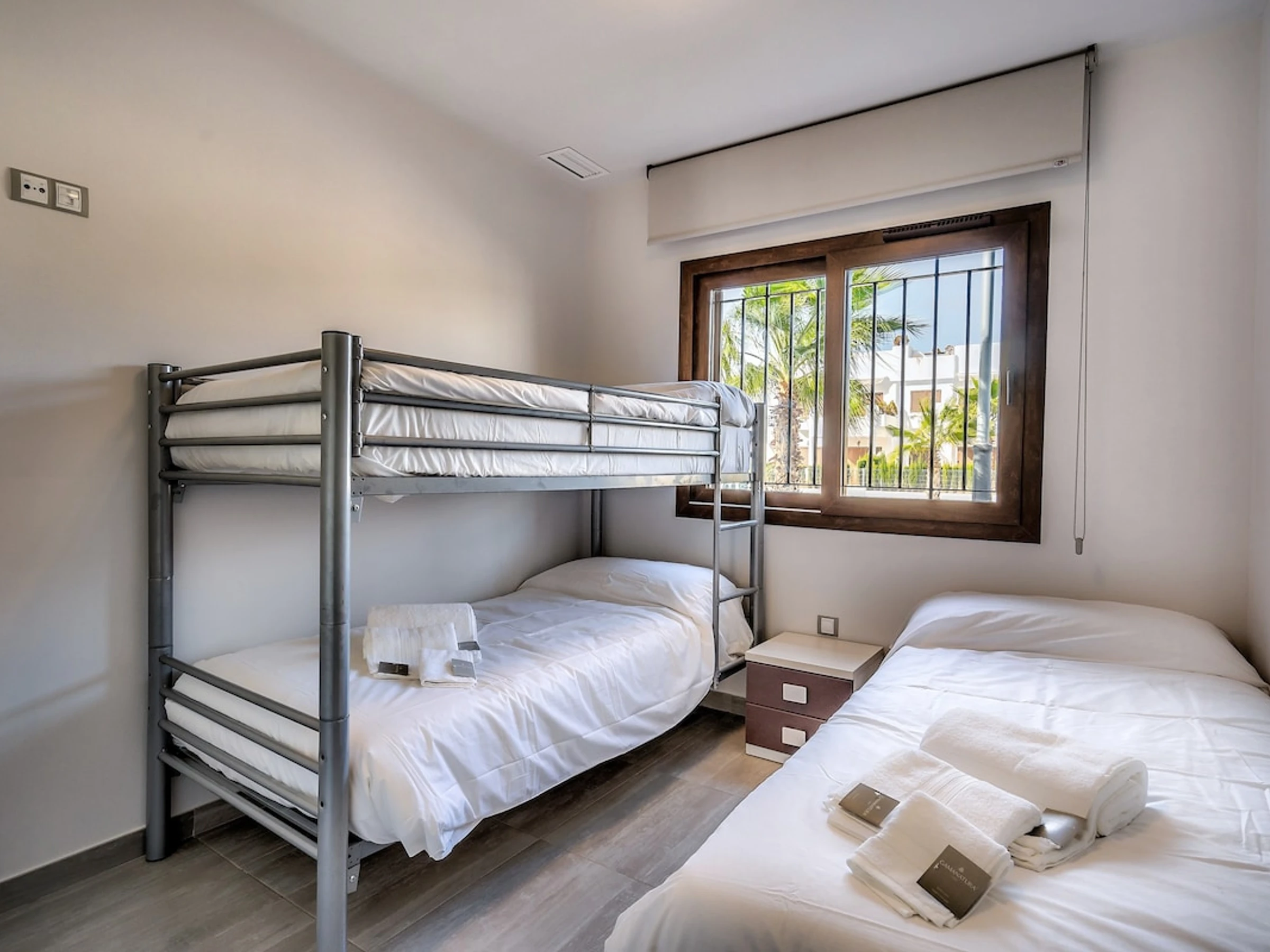 - chambre à coucher climatisée avec un lit simple et un lit superposé de deux couchages