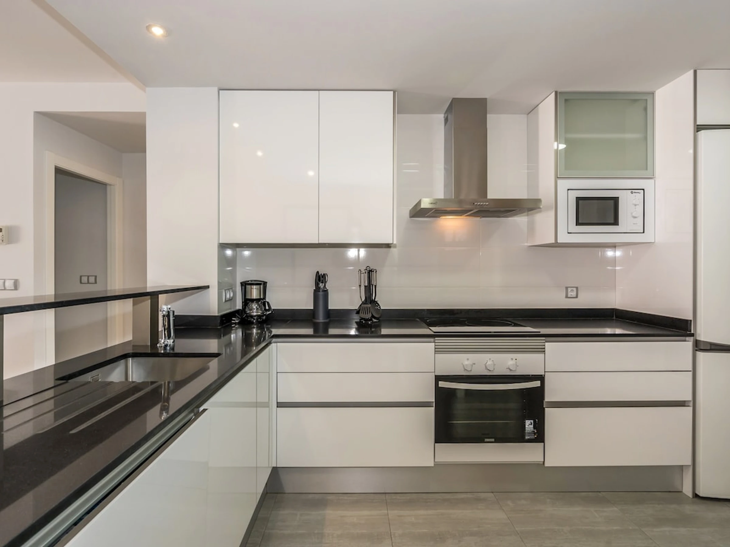 - cuisine américaine avec cuisinière à induction, four électrique, four à micro-ondes, lave-vaisselle, refrigérateur, congélateur, cafetière électrique, bouilloire et grille-pain