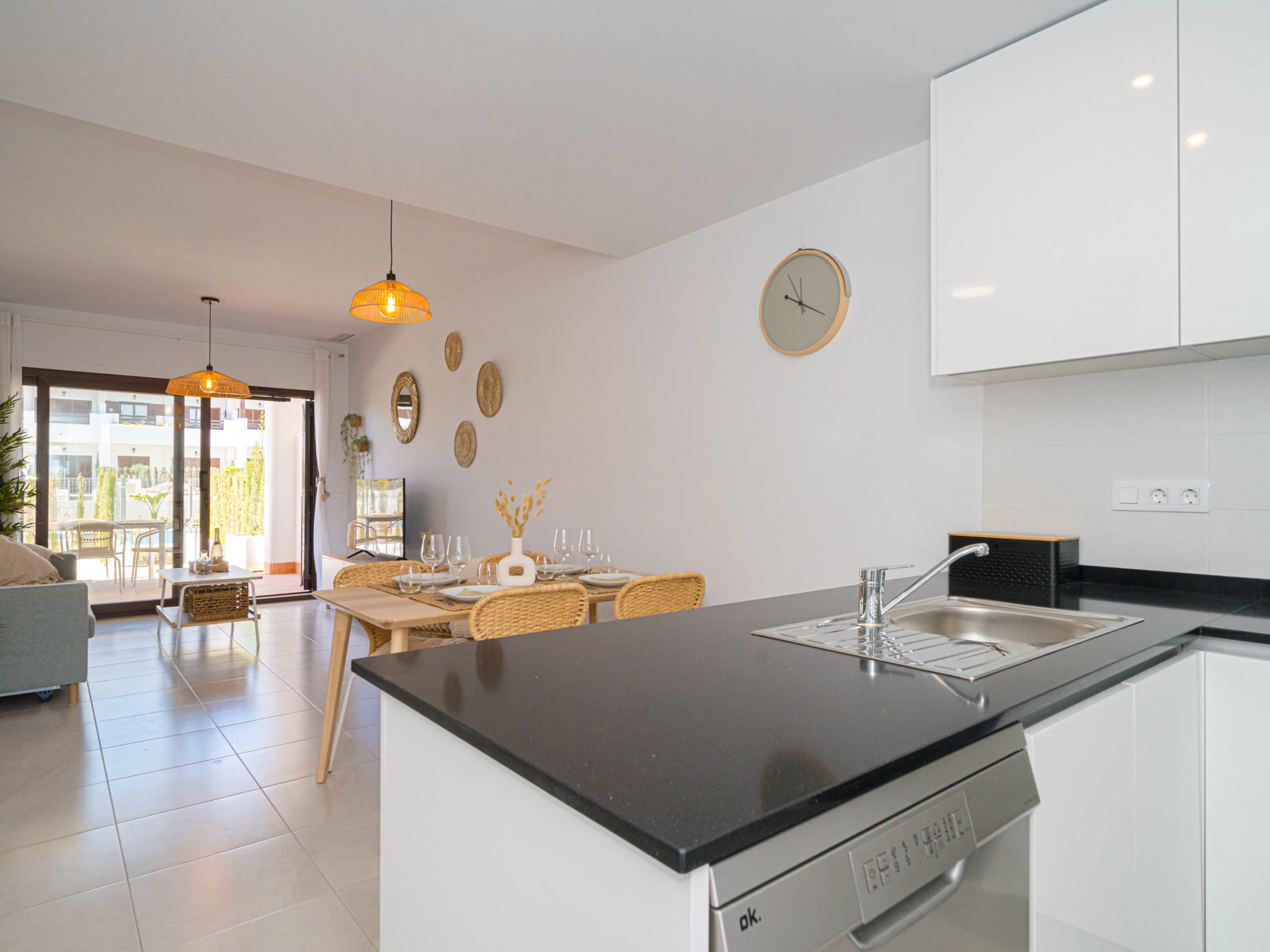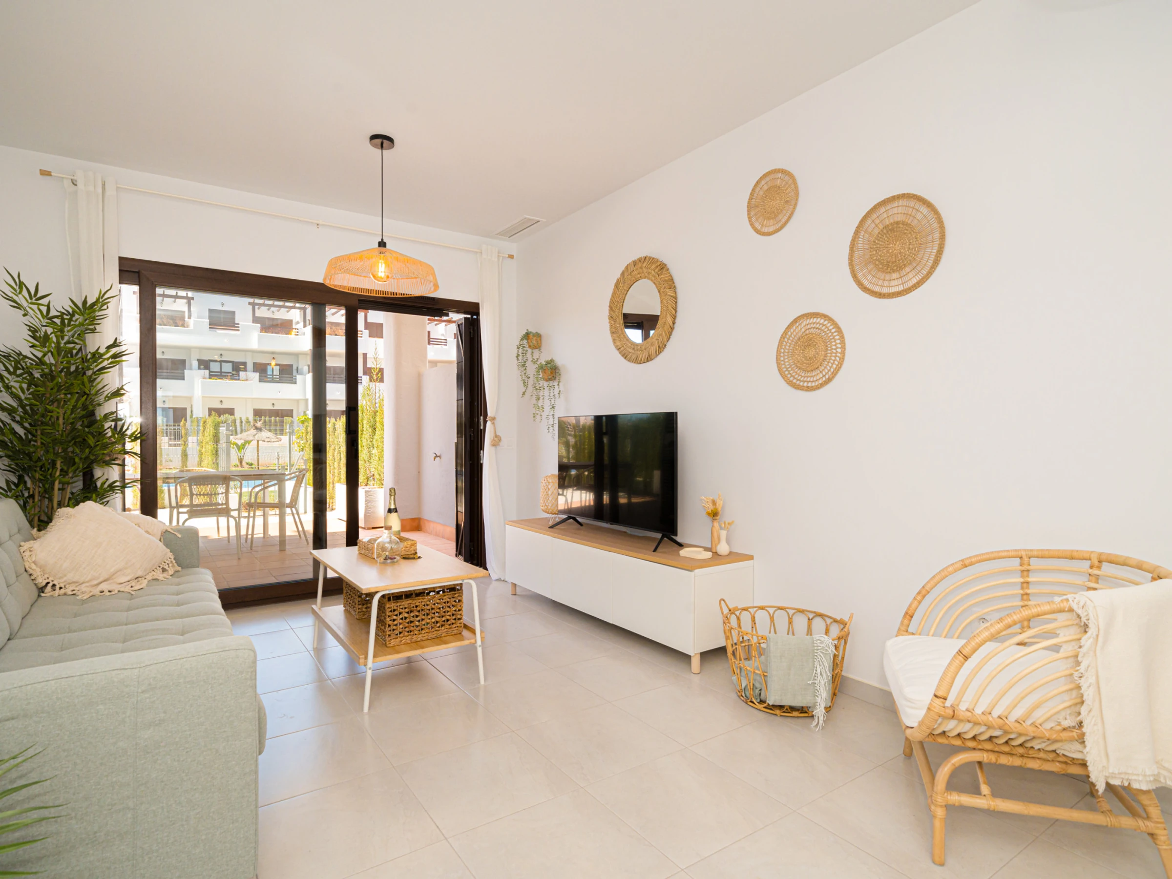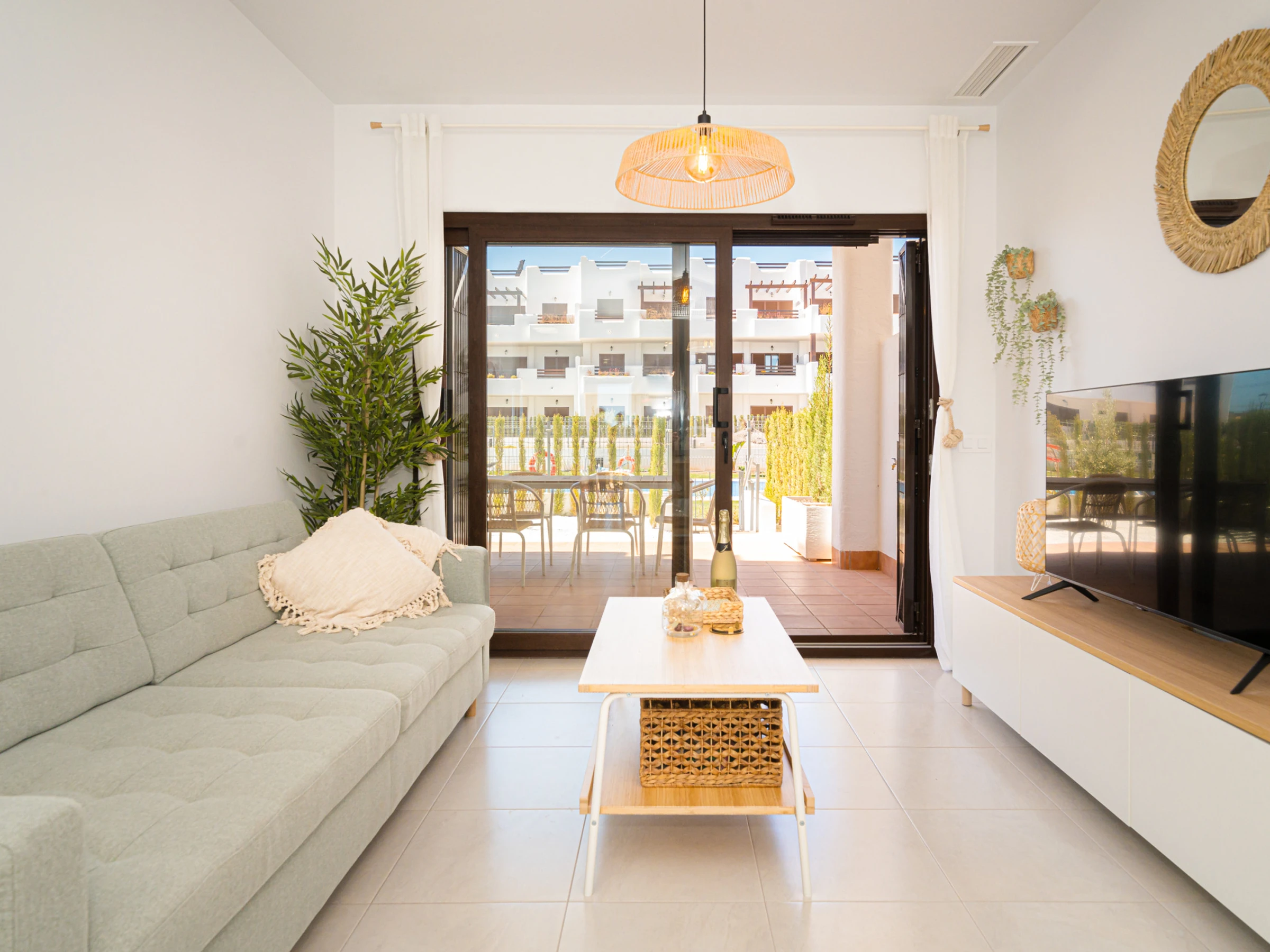 Logement de 75 m² meublé avec goût et de construction récente, avec vue sur le jardin et la piscine.
