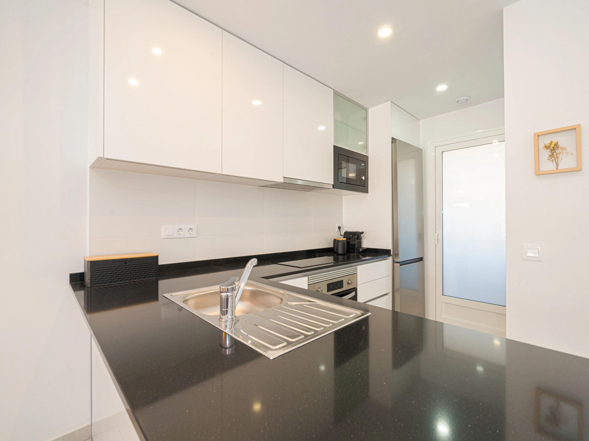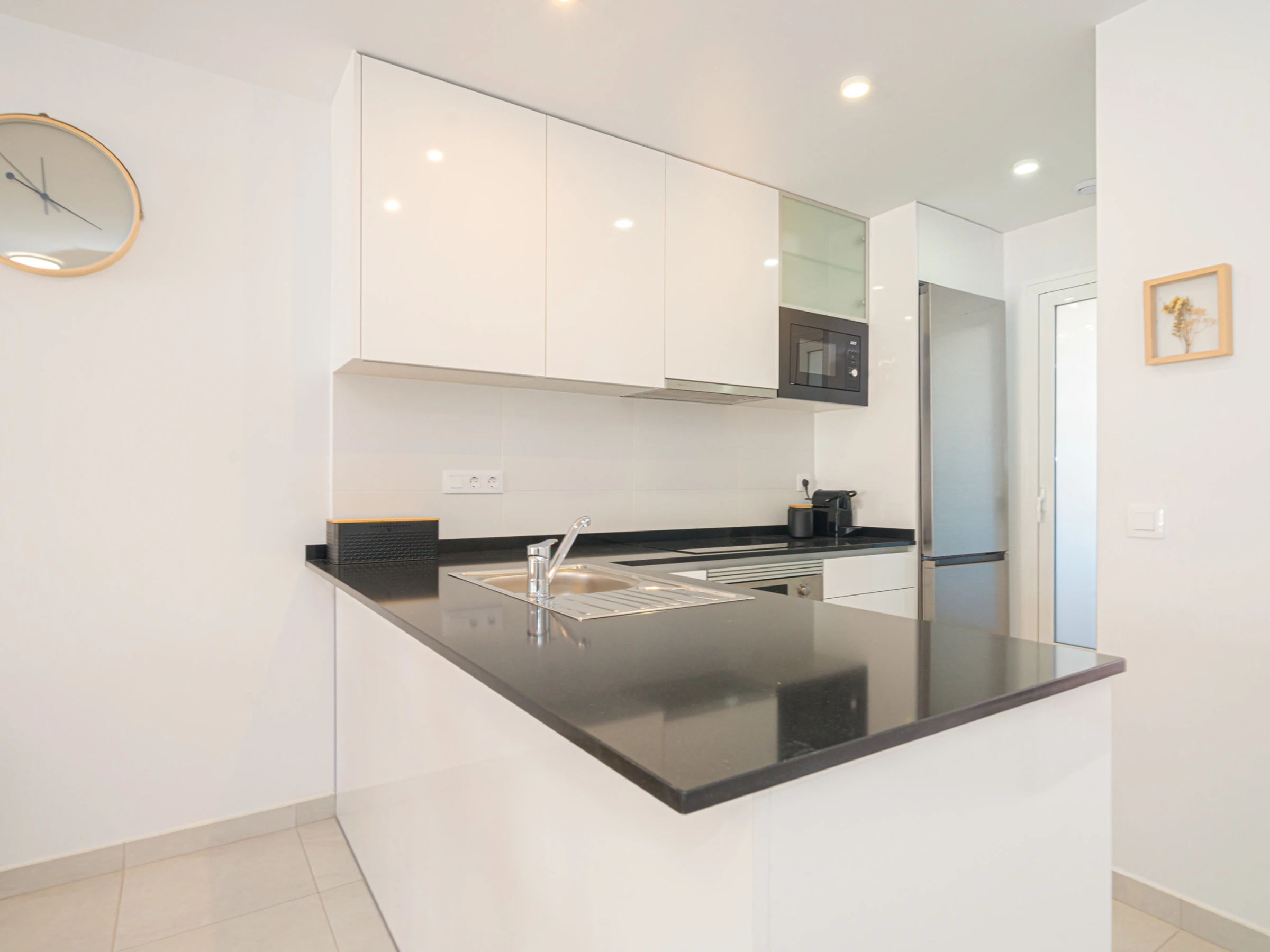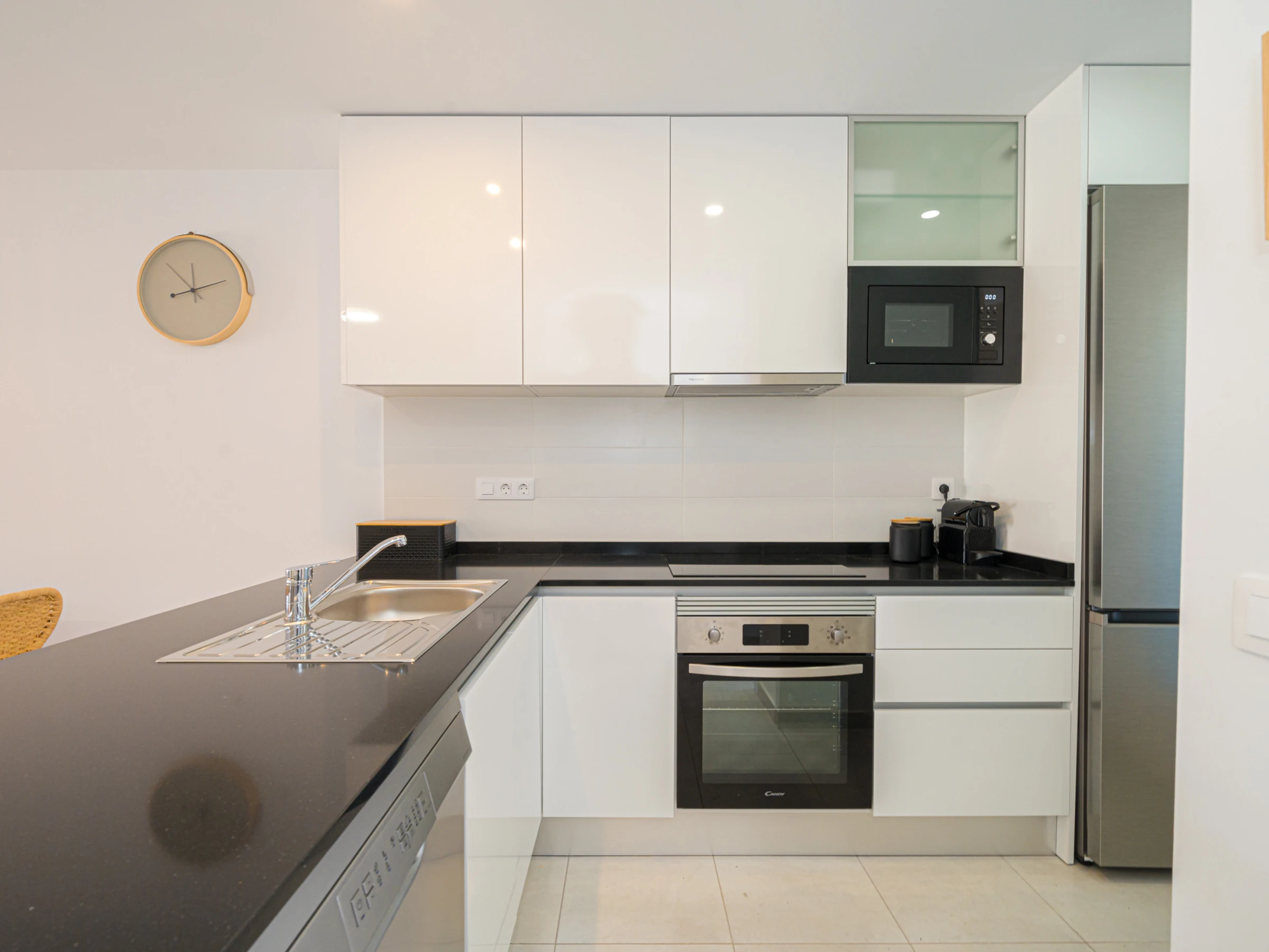 La cuisine américaine, à induction, est équipée avec réfrigérateur, micro-ondes, four, congélateur, lave-vaisselle, vaisselle/couverts, ustensiles/cuisine, cafetière, grille pain et bouilloire.