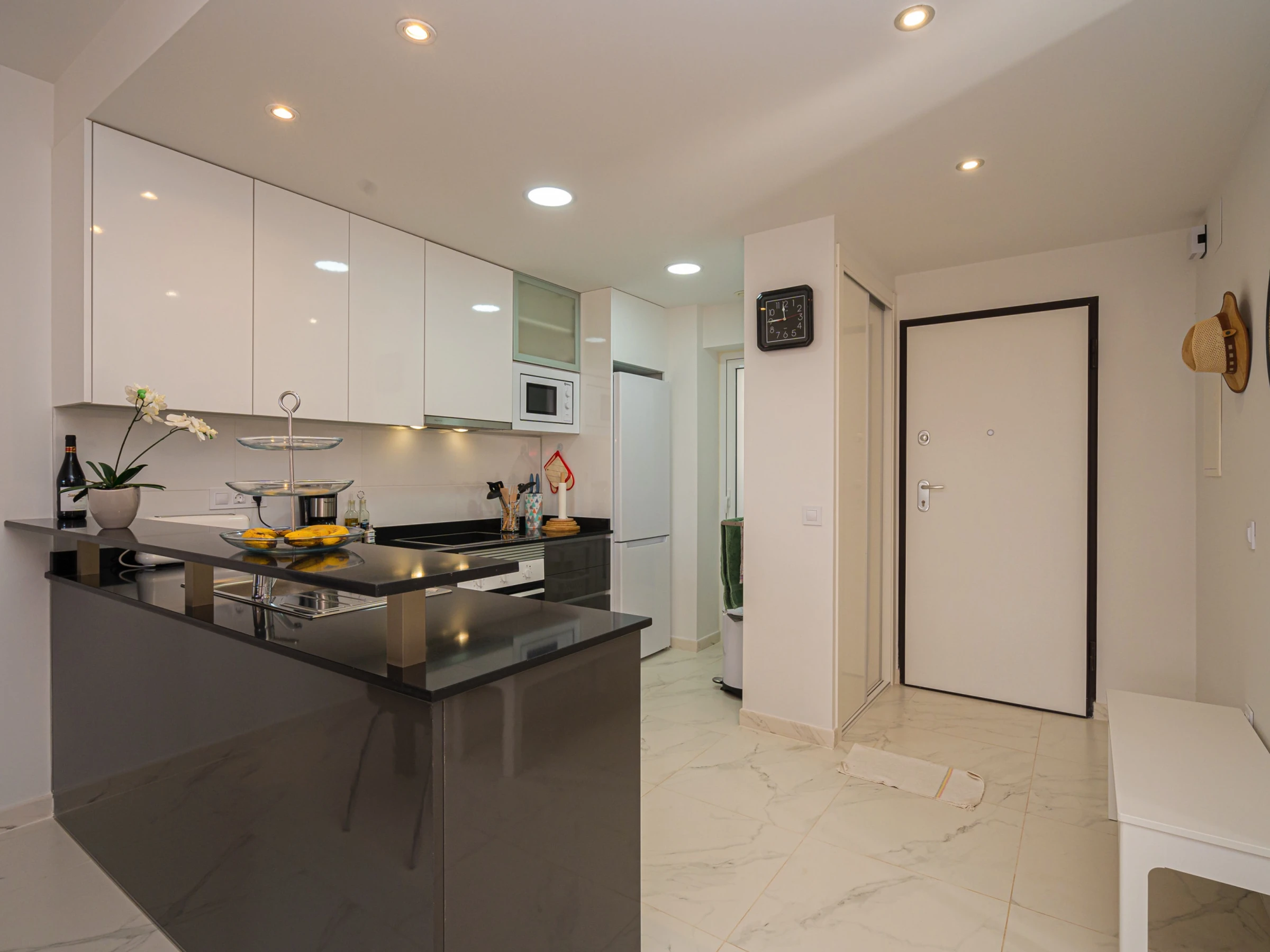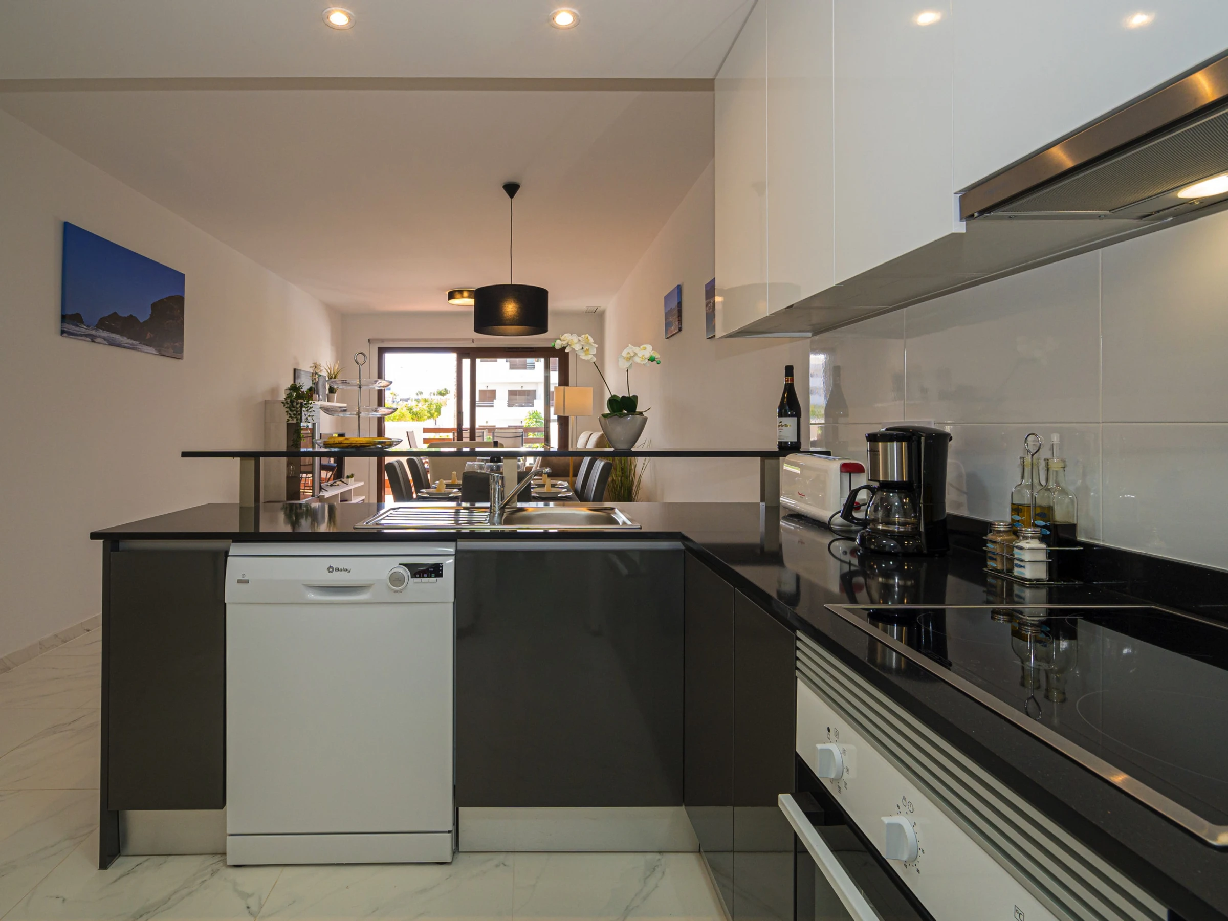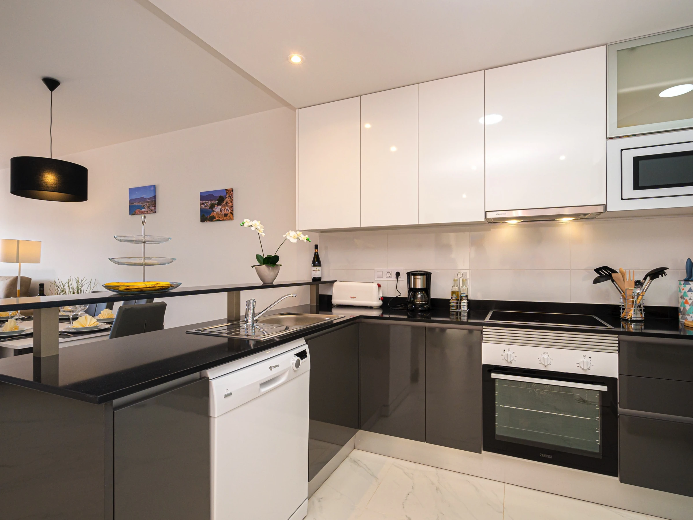 La cuisine américaine, à vitrocéramique, est équipée avec réfrigérateur, micro-ondes, four, congélateur, lave-vaisselle, vaisselle/couverts, ustensiles/cuisine, cafetière, grille pain, bouilloire et presse-agrumes.