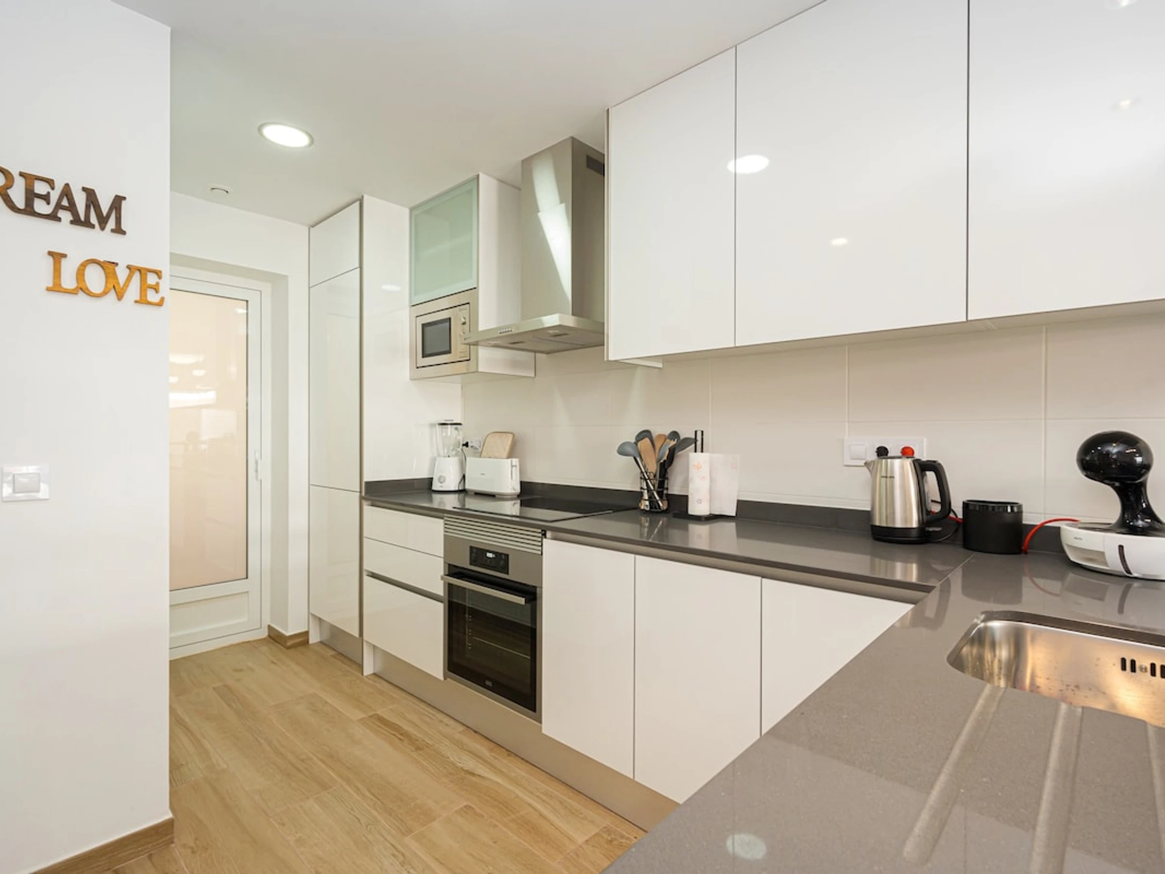 - cuisine américaine avec cuisinière électrique, four électrique, four à micro-ondes, lave-vaisselle, refrigérateur, congélateur, cafetière électrique, bouilloire et grille-pain